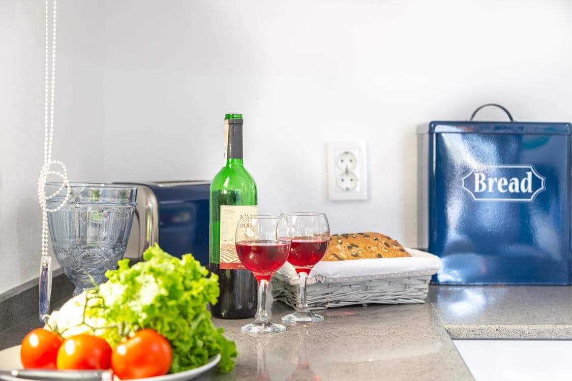 - Large modern kitchen with fridge‑freezer, cooker, microwave, kettle, cafetière, toaster, washing machine and water dispenser.
