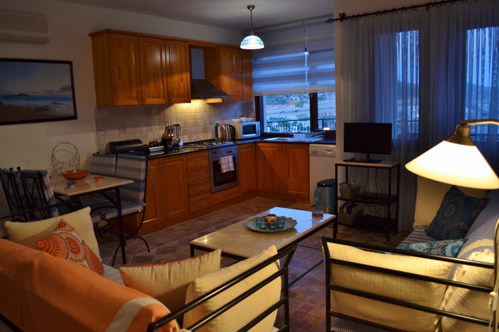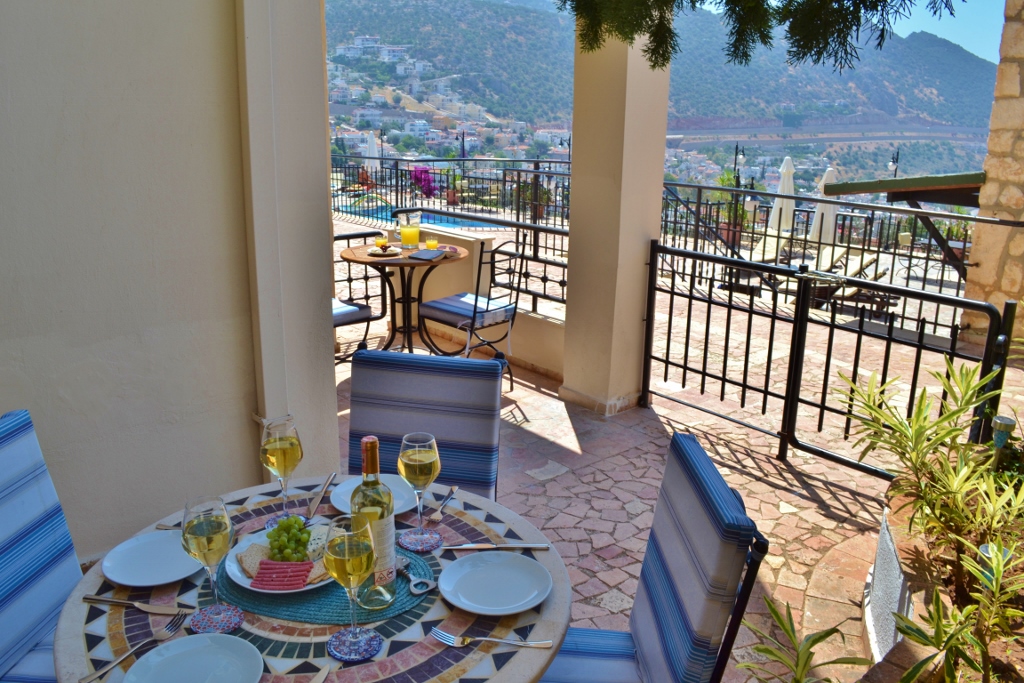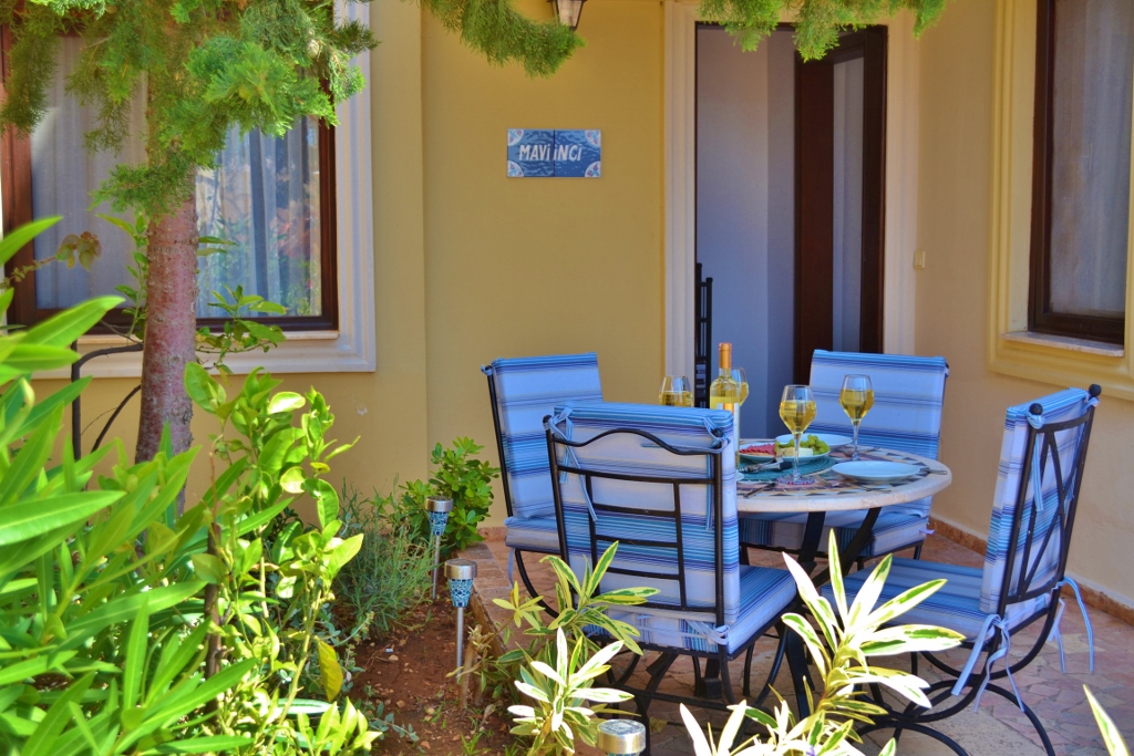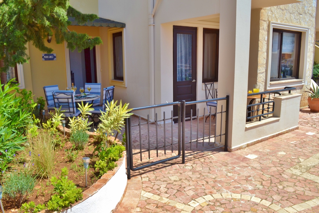 Mavi Inci is accessed via steps in the complex but is on the ground floor and has a large gated private terrace at the front with ample outdoor dining furniture for guests to dine al fresco.