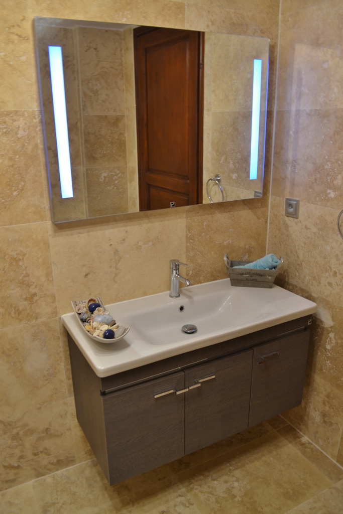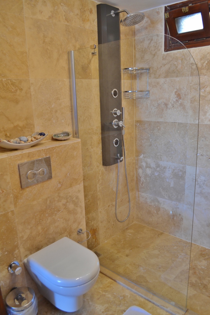Up to 5 guests are accommodated in one king size and one twin bedroom, which also has ample space for a Z bed. Each bedroom has a wardrobe and a dressing table, with stool, mirror and a hairdryer. Completing the apartment is a modern wet-room style shower room with WC with built in bidet, large sink unit with lit mirror above and a large walk in shower area where the shower has two adjustable massage jets, a rain shower head and an integrated hand shower.