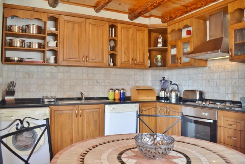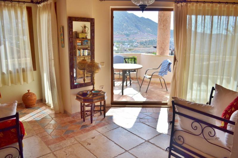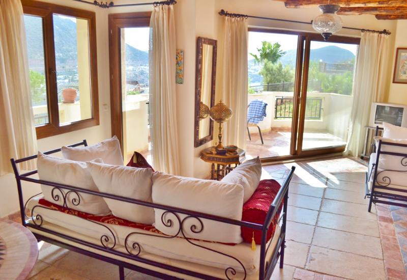 Adjacent to the kitchen is the living area, furnished with a high quality cast iron sofa and armchair, chess table, book case, flat-screen TV, DVD player, Ipod Dock and Wi-Fi. Double patio doors lead directly out onto the wrap-around balcony.