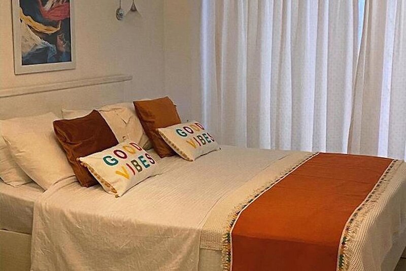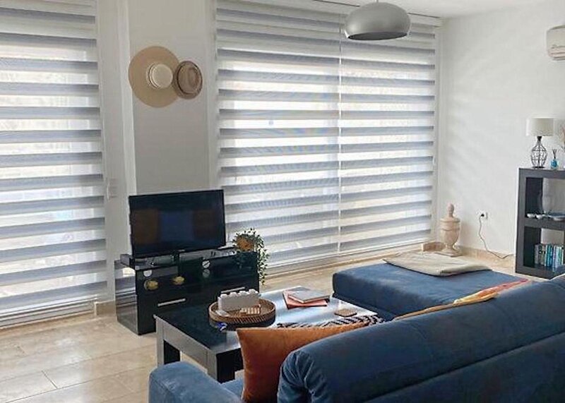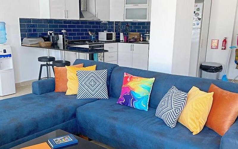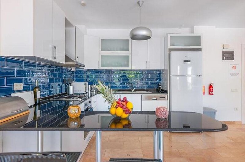 The entrance to the apartment is on the ground floor and opens to a very bright and spacious open plan living area with a well-stocked modern kitchen with water cooler and Nespresso coffee machine, indoor dining area and airy living space housing an ample L-shaped sofa, air conditioning, TV with UK channels and Bluetooth speaker. Two large sets of patio doors open directly onto the pool terrace and outside dining area. A BBQ, adjustable shade and comfy sun-loungers complete the picture.