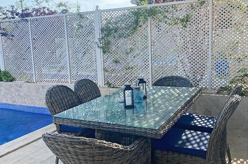 The two light and generous bedrooms are on the lower level and both open out onto the downstairs garden courtyard. This is also equipped with outdoor furniture and a table tennis table for entertainment.