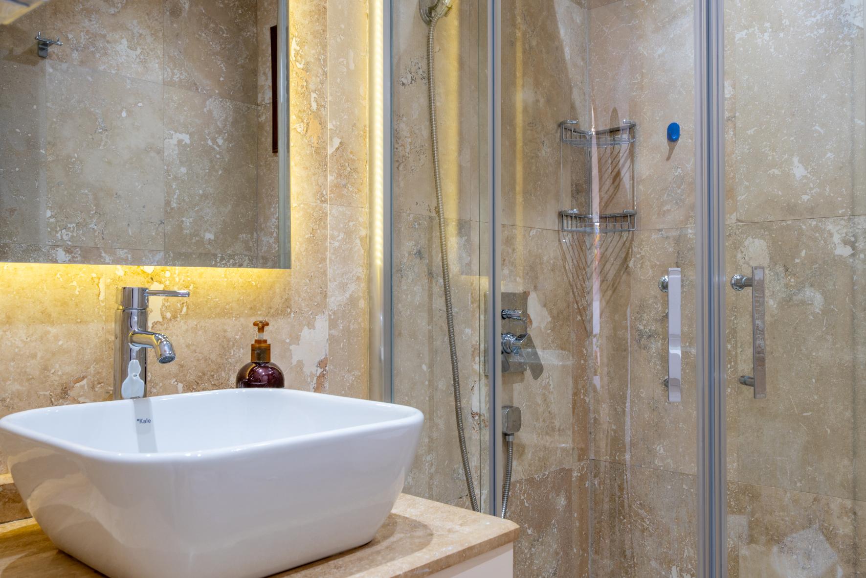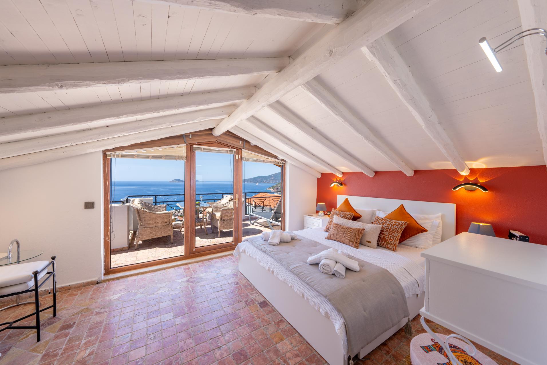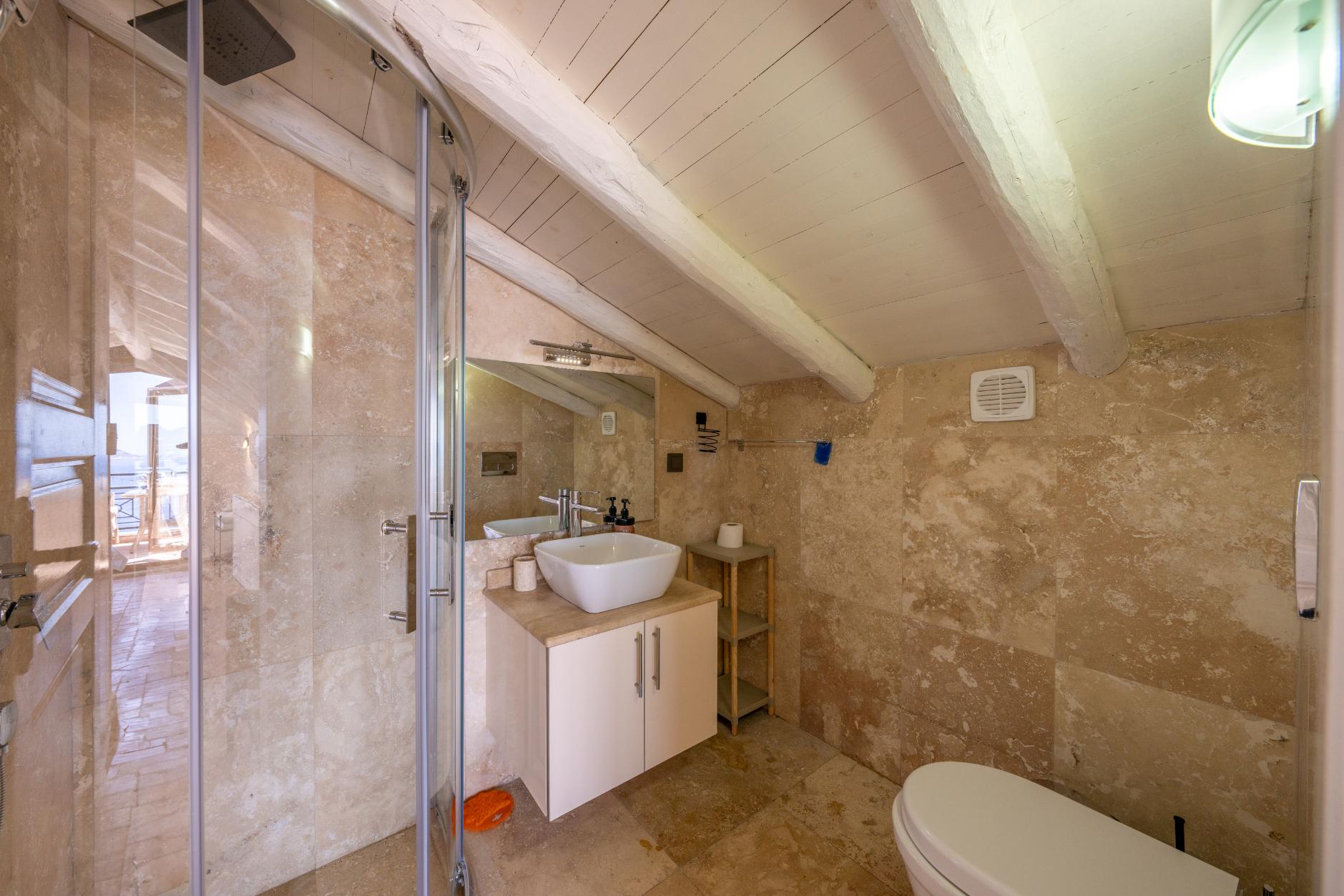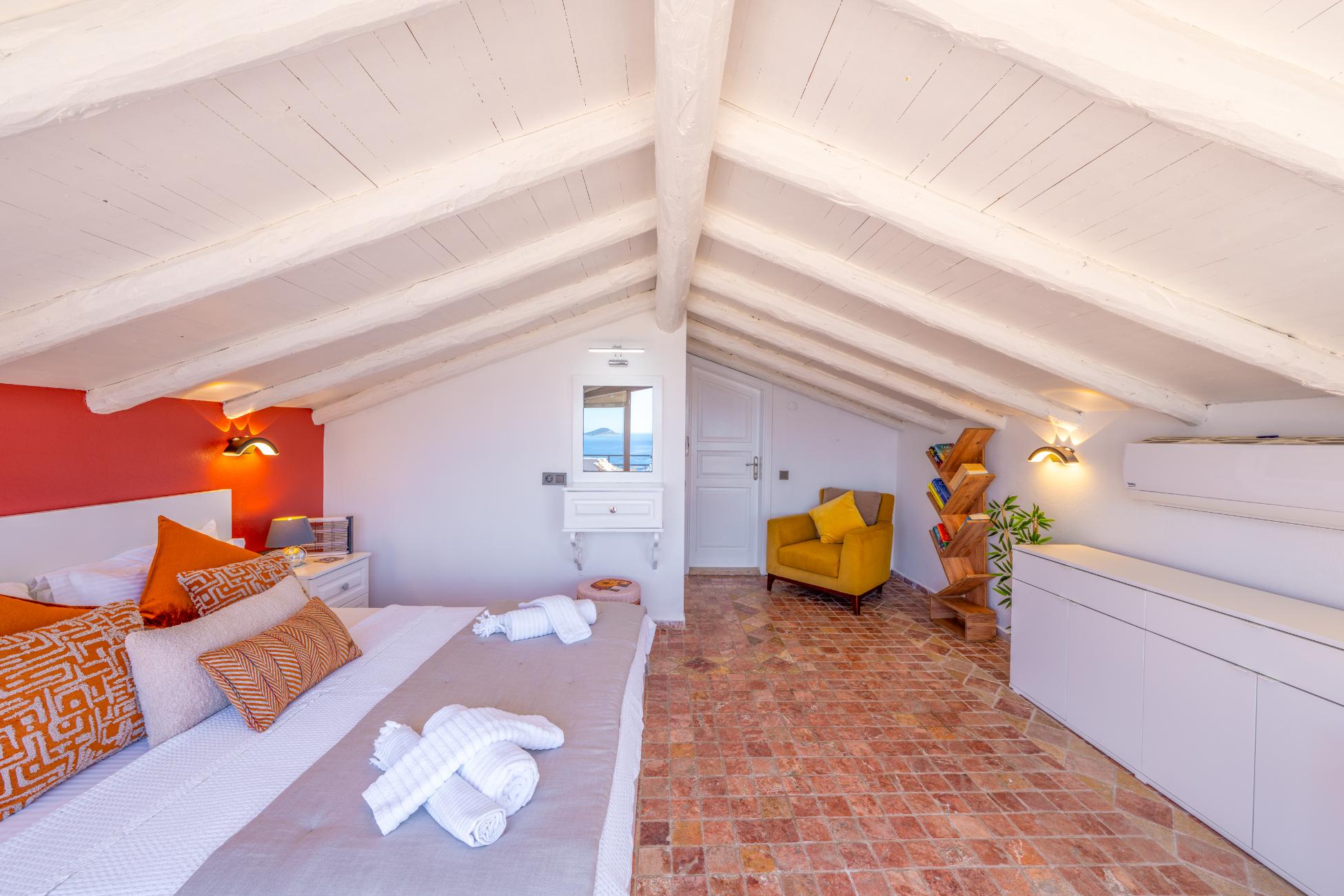 A solid antique marble staircase leads up to the Sahane’s penthouse king size master suite. This exceptionally spacious suite style bedroom complete with seating area commands spectacular sea views. The room’s en suite bathroom includes a walk in power shower, wc, sink and mirror. The suite has its own private, extensive ‘wraparound’ sun terrace which is furnished with sunloungers, parasol, table and chairs and private bbq.
