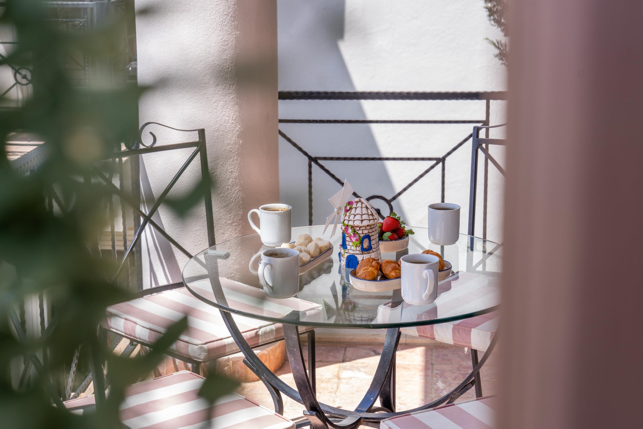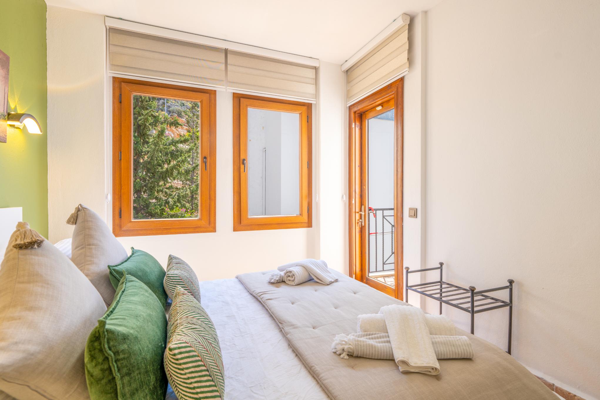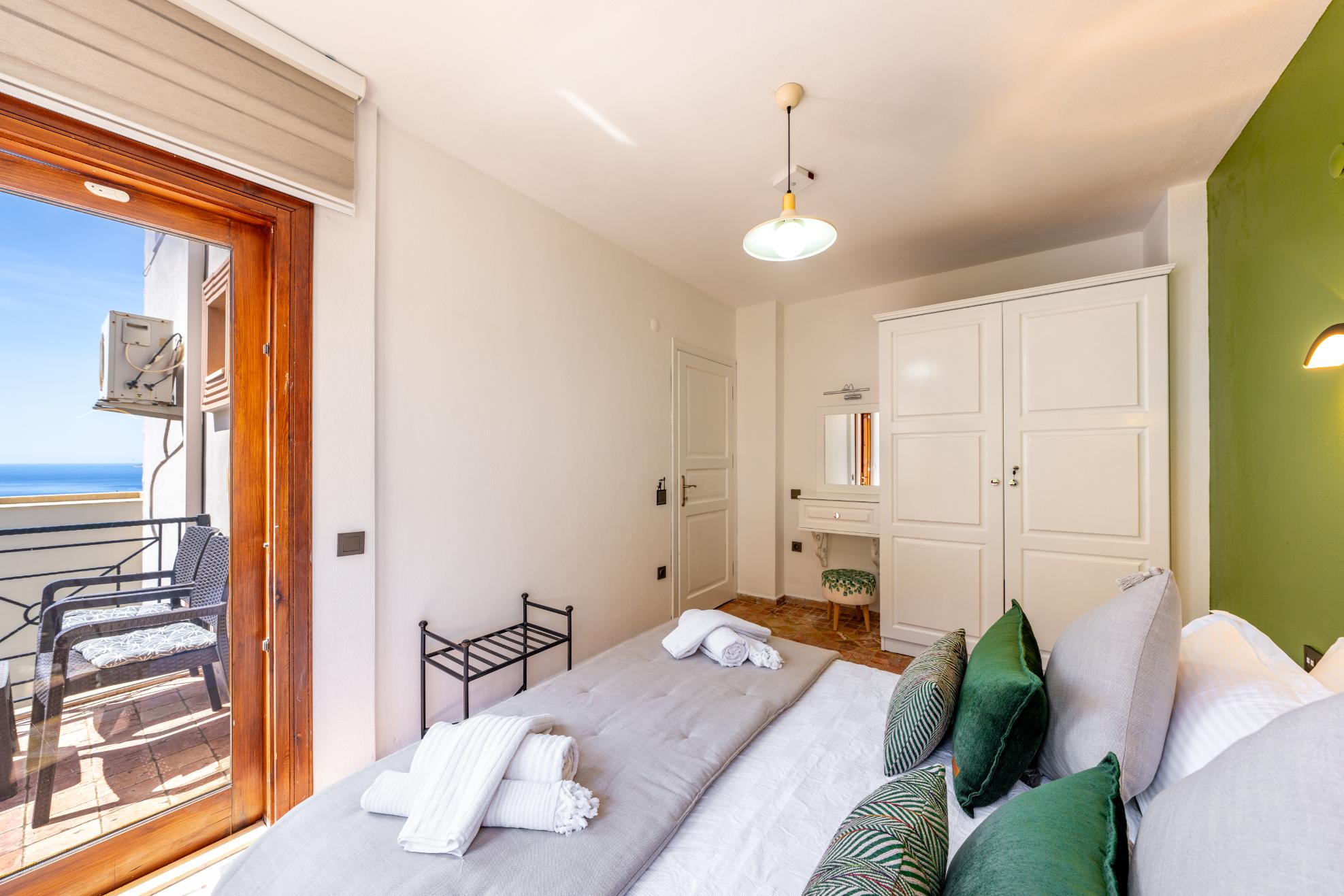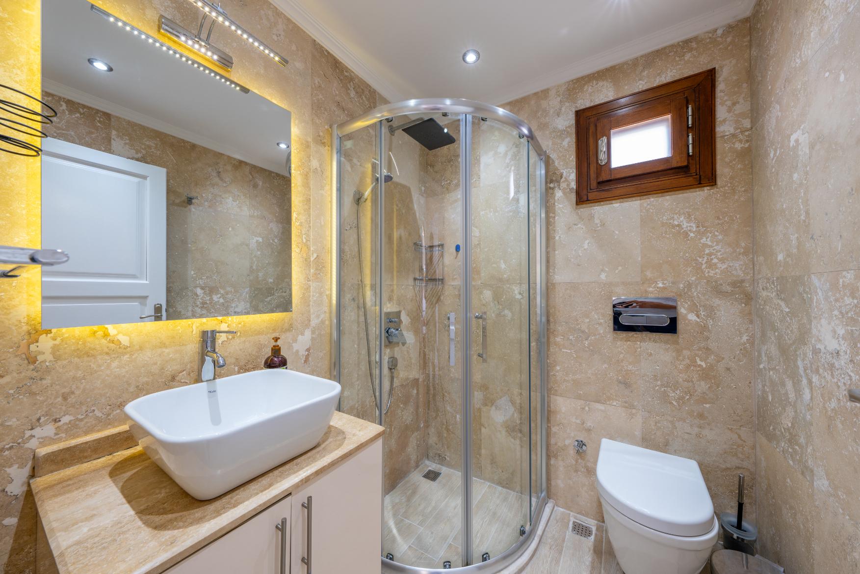 A solid antique marble staircase leads up to the Sahane’s penthouse king size master suite. This exceptionally spacious suite style bedroom complete with seating area commands spectacular sea views. The room’s en suite bathroom includes a walk in power shower, wc, sink and mirror. The suite has its own private, extensive ‘wraparound’ sun terrace which is furnished with sunloungers, parasol, table and chairs and private bbq.