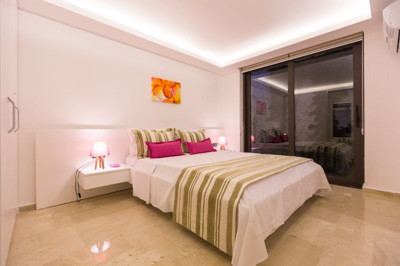First Floor: The spacious open plan living area has contemporary style décor and furnishings and is further enhanced with original art pieces. The kitchen is fully equipped with integral oven, hob and dishwasher. There is also a large fridge freezer and kettle. Full length sliding doors open onto the large private pool terrace where you will find ample sun loungers and a shaded dining area. A guest cloakroom is also provided on this level.