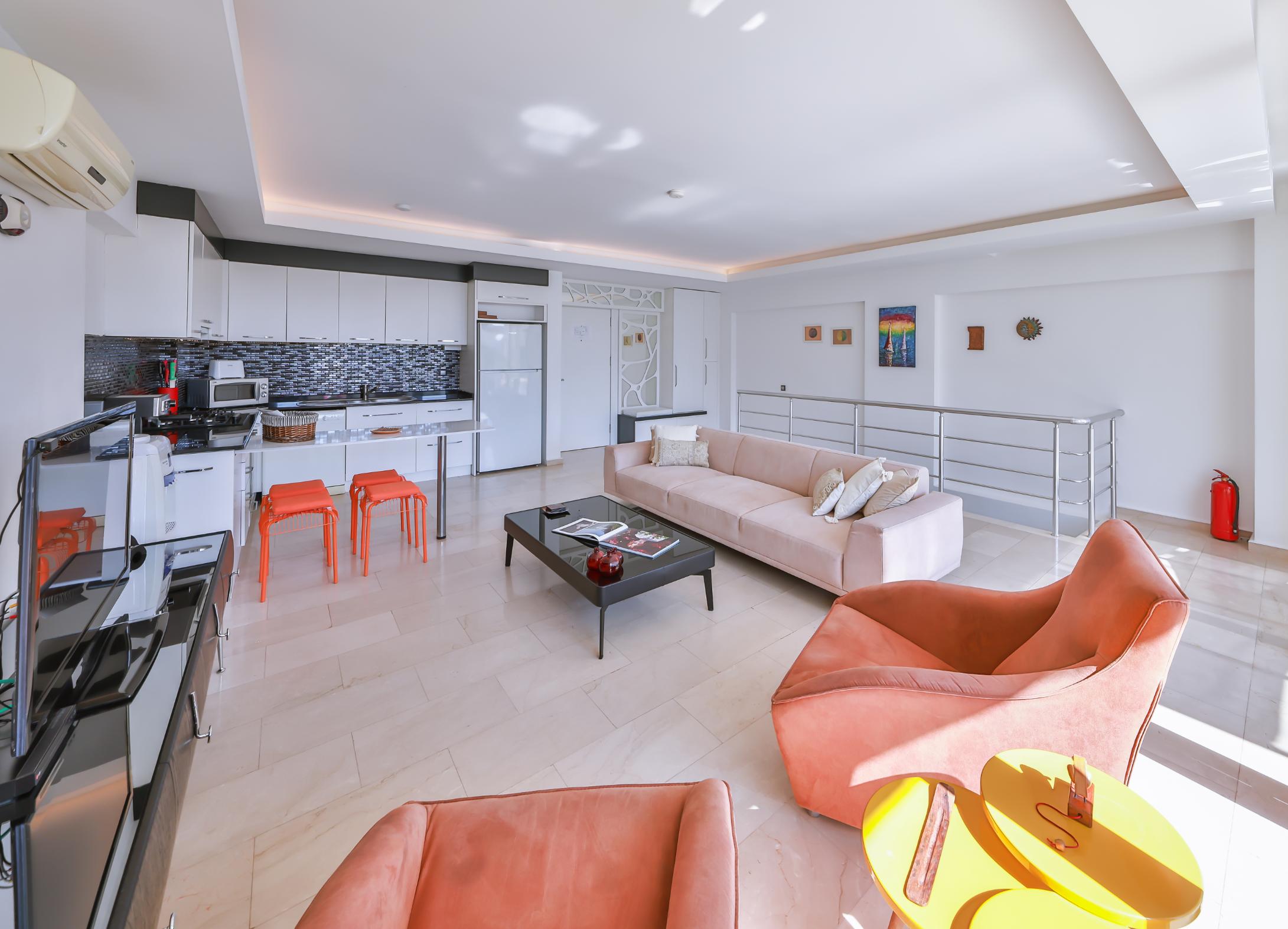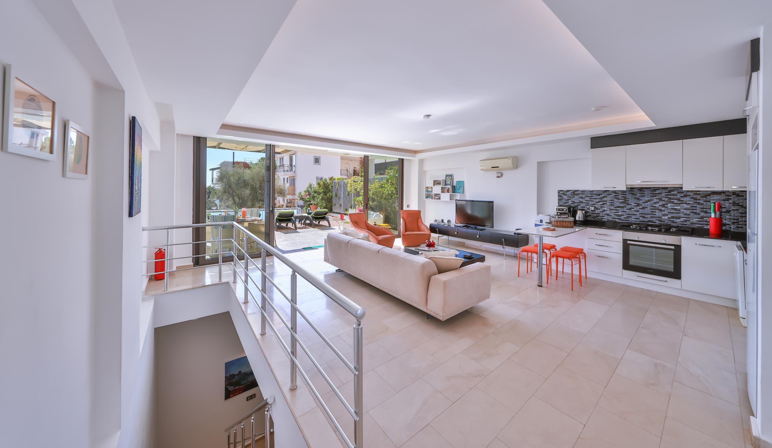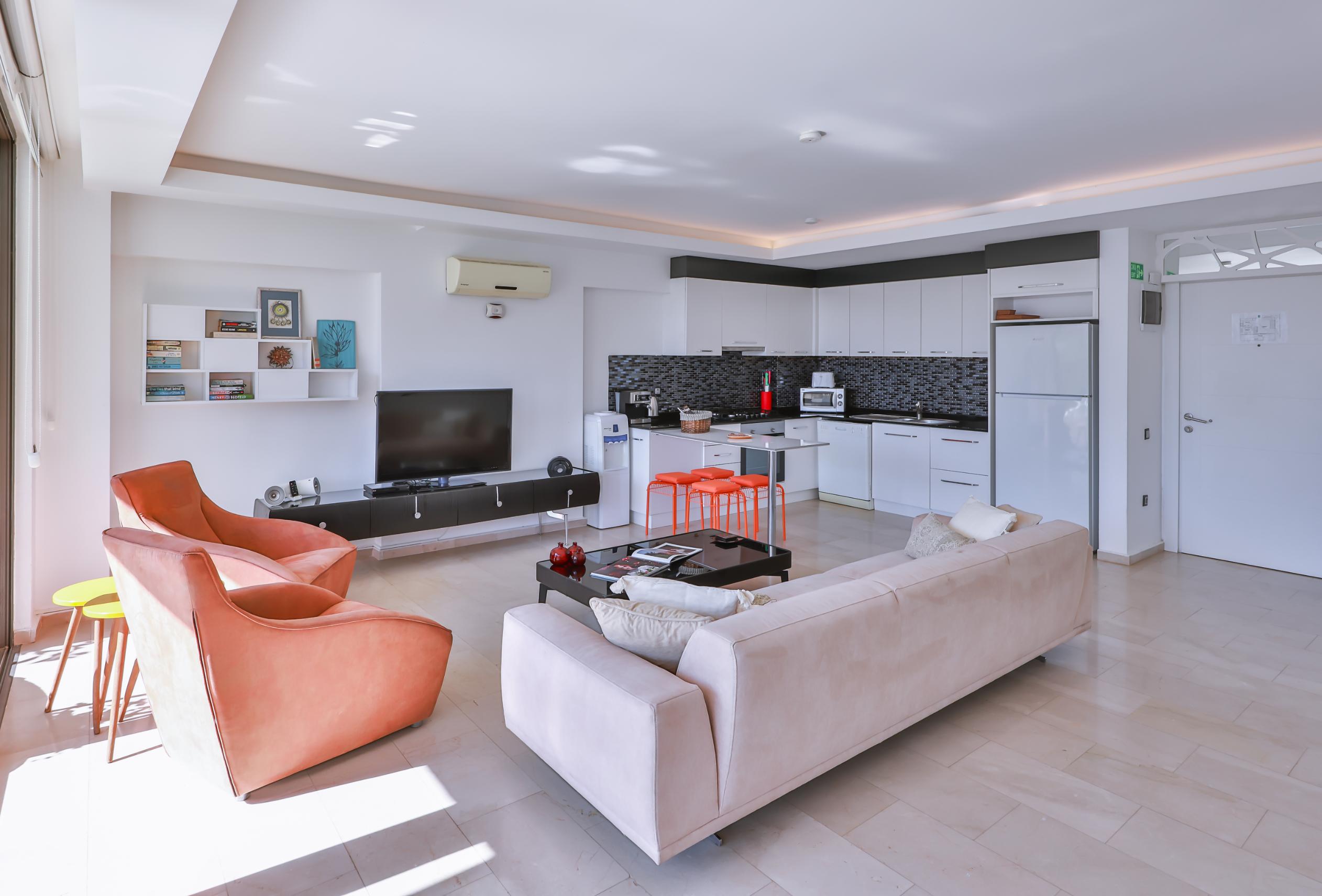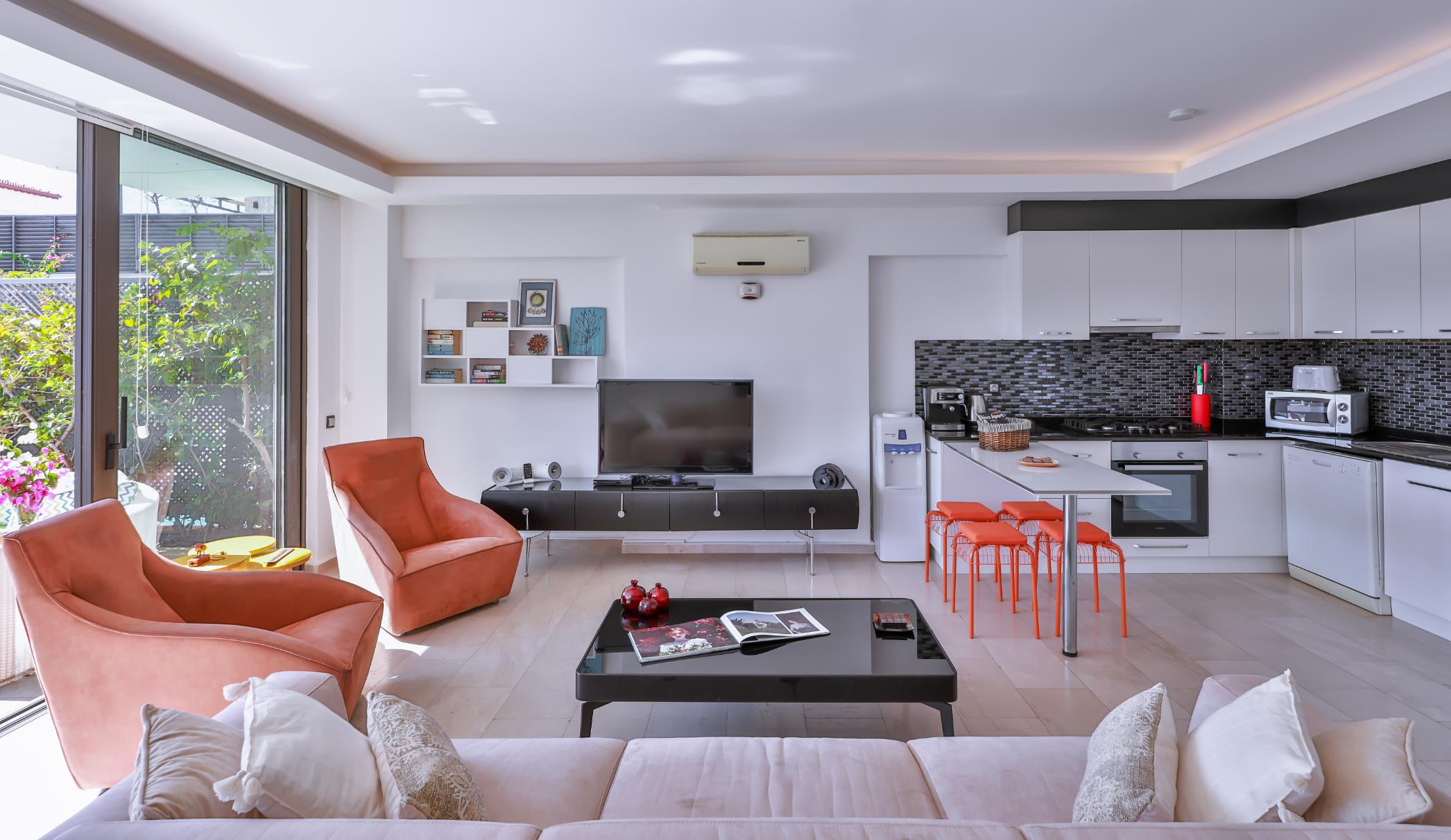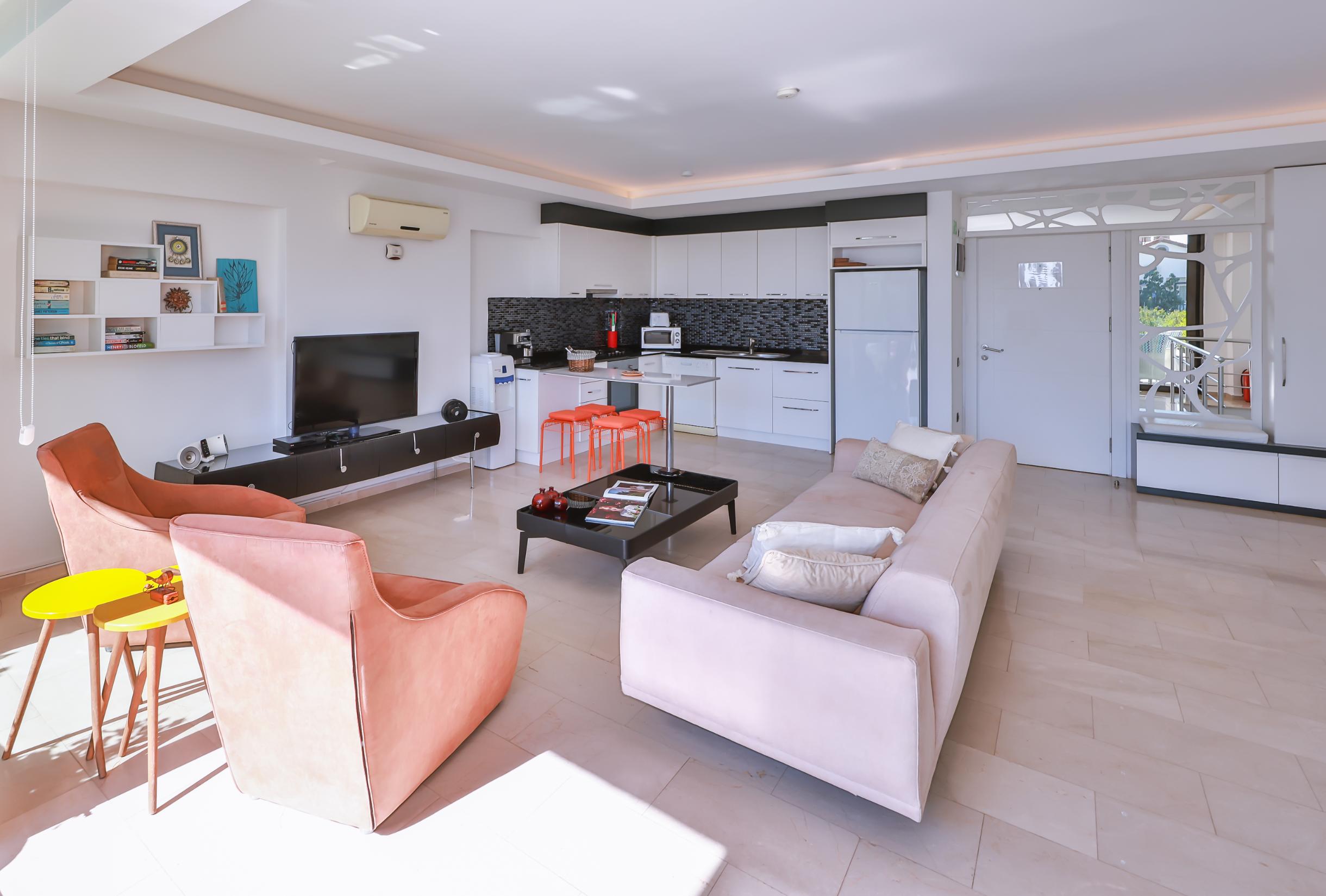 Upon entering, you are welcomed into a spacious and airy open-plan living area, furnished with comfortable seating and a large flat-screen TV. The décor is contemporary and accentuated with original art pieces.