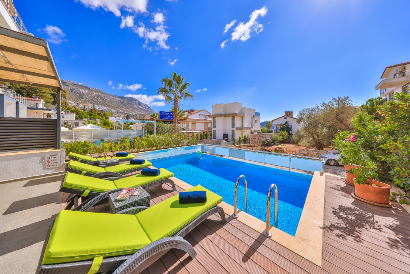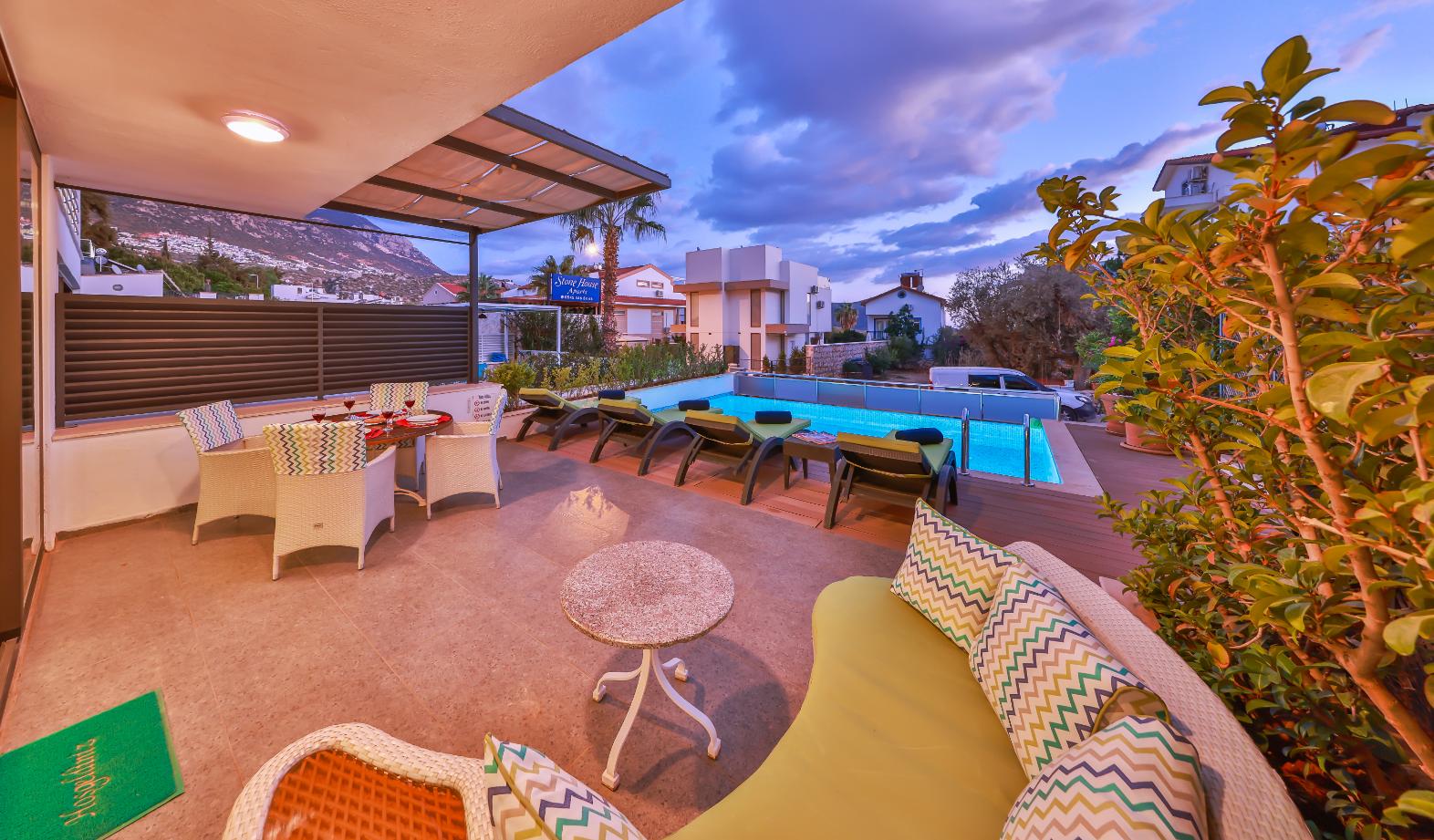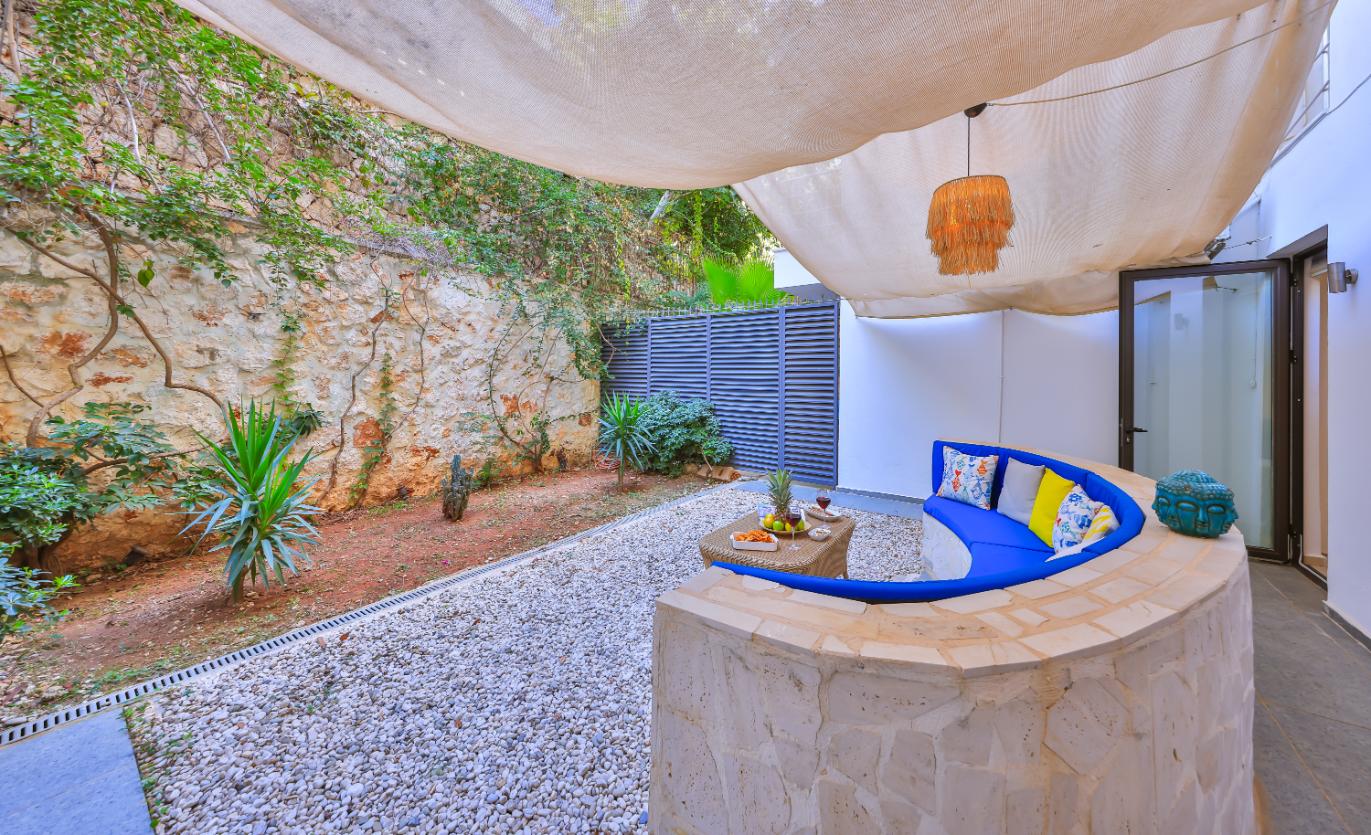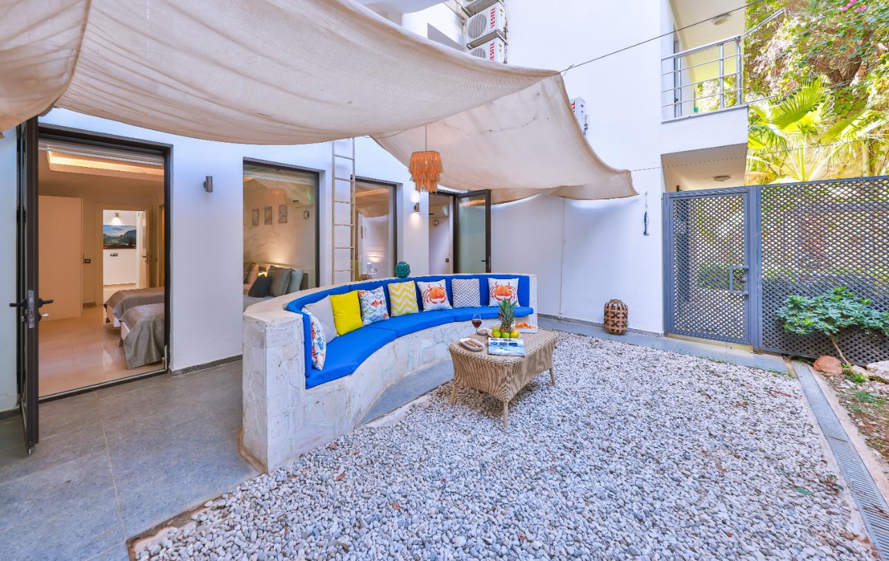 Apartment Shiva is a stylish luxury two-bedroom, two-bathroom holiday apartment in Kalkan, Turkey. Spanning two floors, it offers two private sun terraces, a secluded garden, and its own private pool — ideal for relaxing in privacy. Set within a small complex of five apartments, it’s perfectly located close to restaurants, shops, and supermarkets, and just a 10-minute walk from Kalkan’s Old Town and harbour. Ideal for couples, friends, or small families seeking a modern Kalkan holiday rental with privacy, style, and an excellent location.