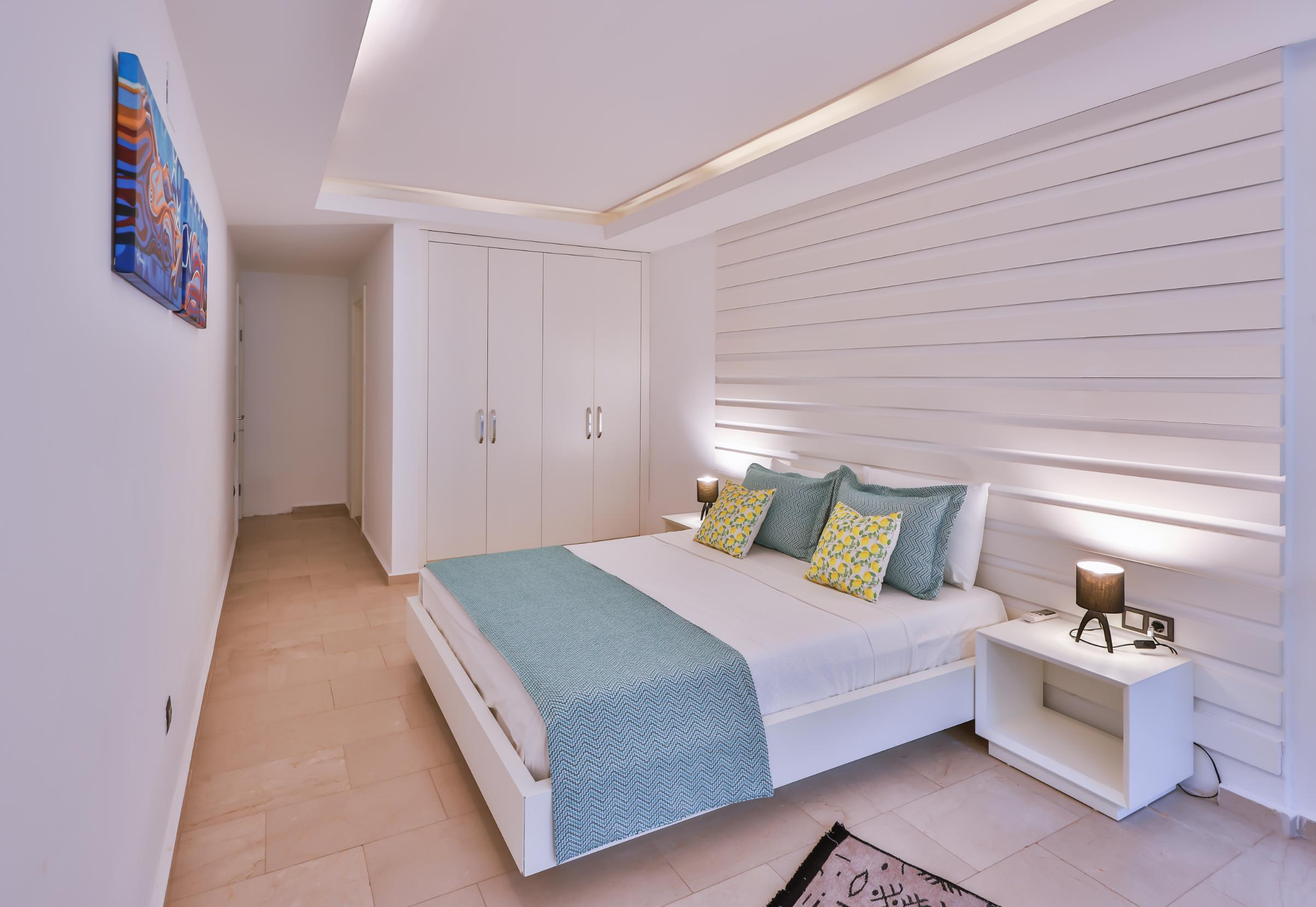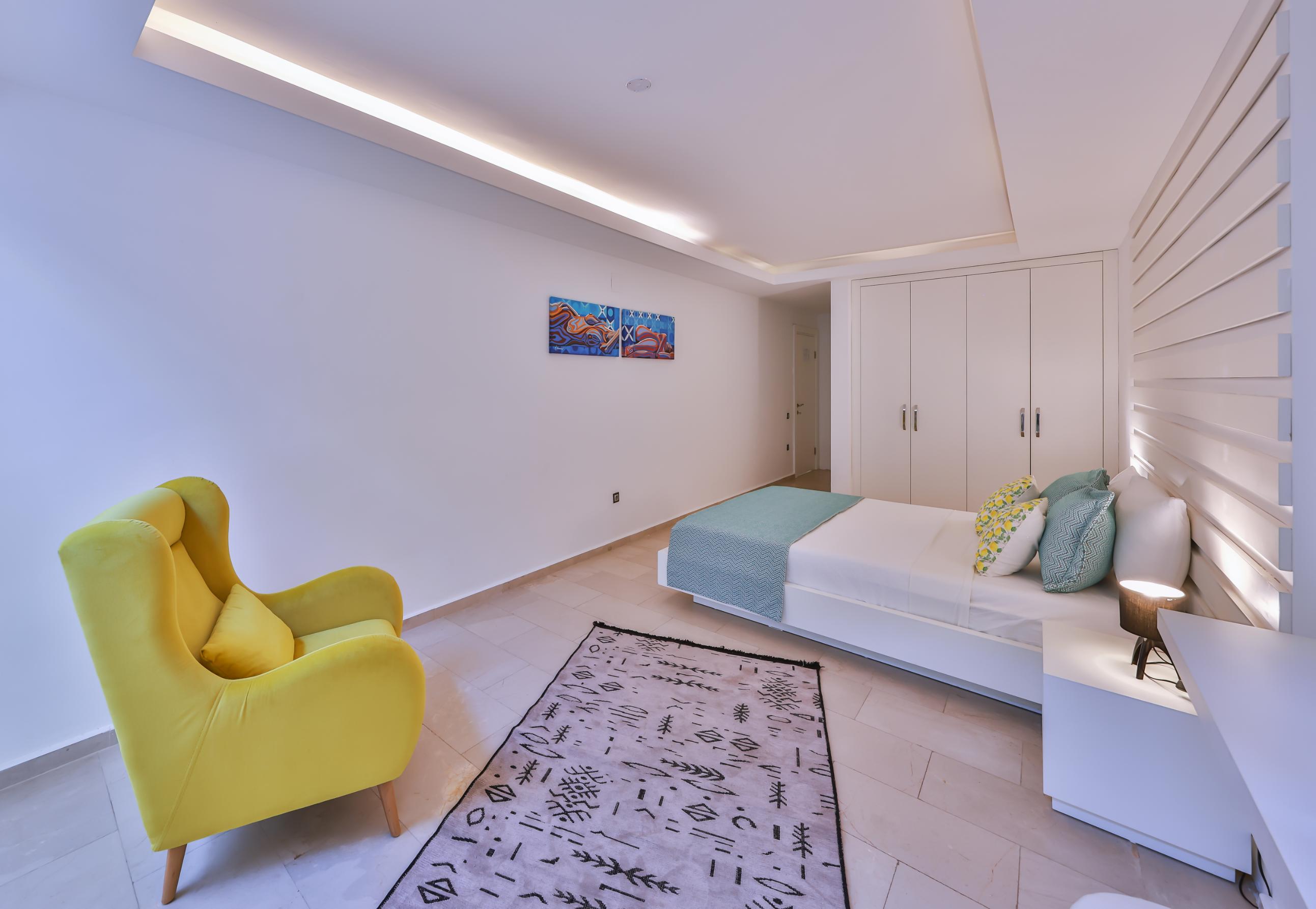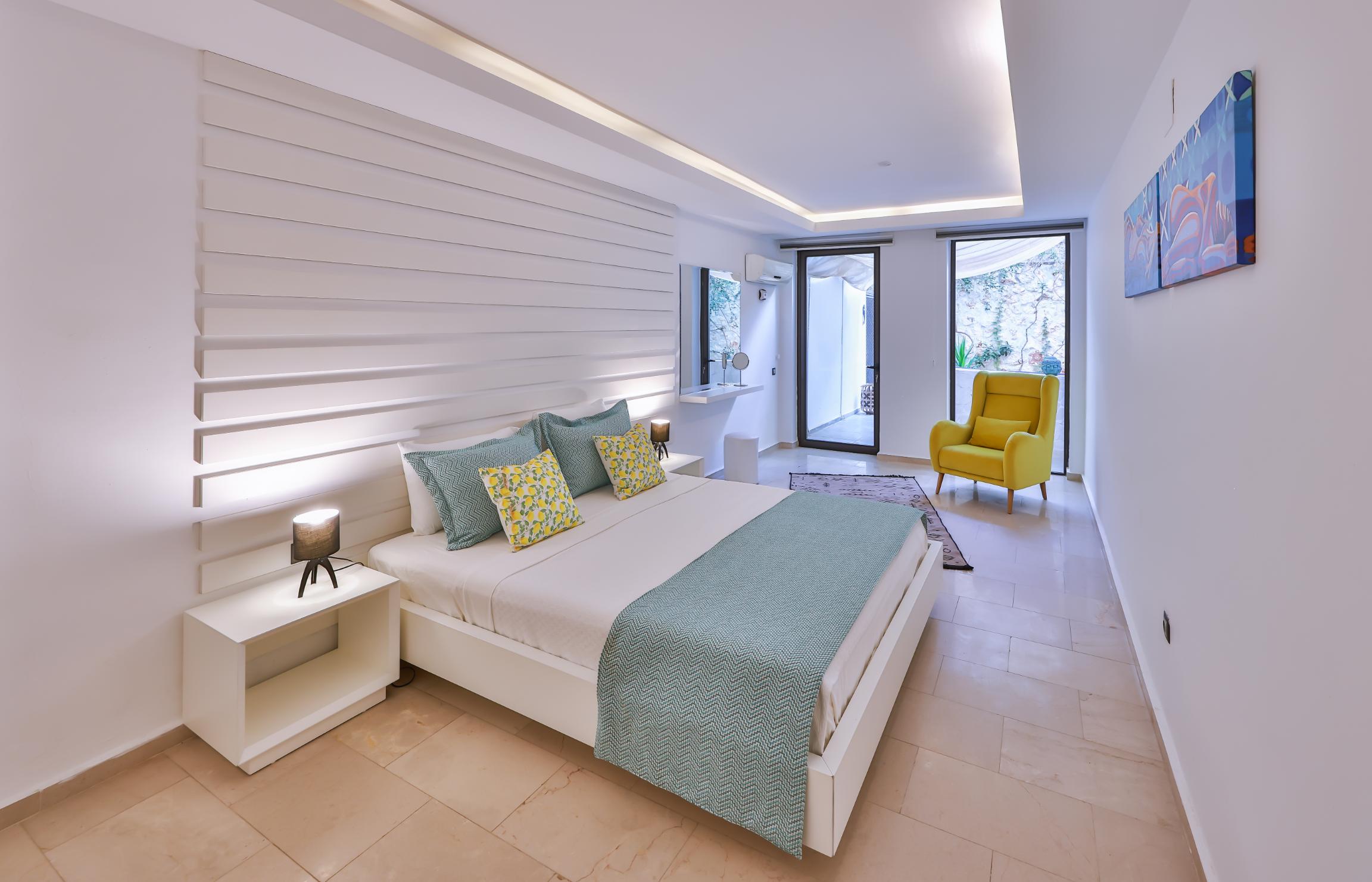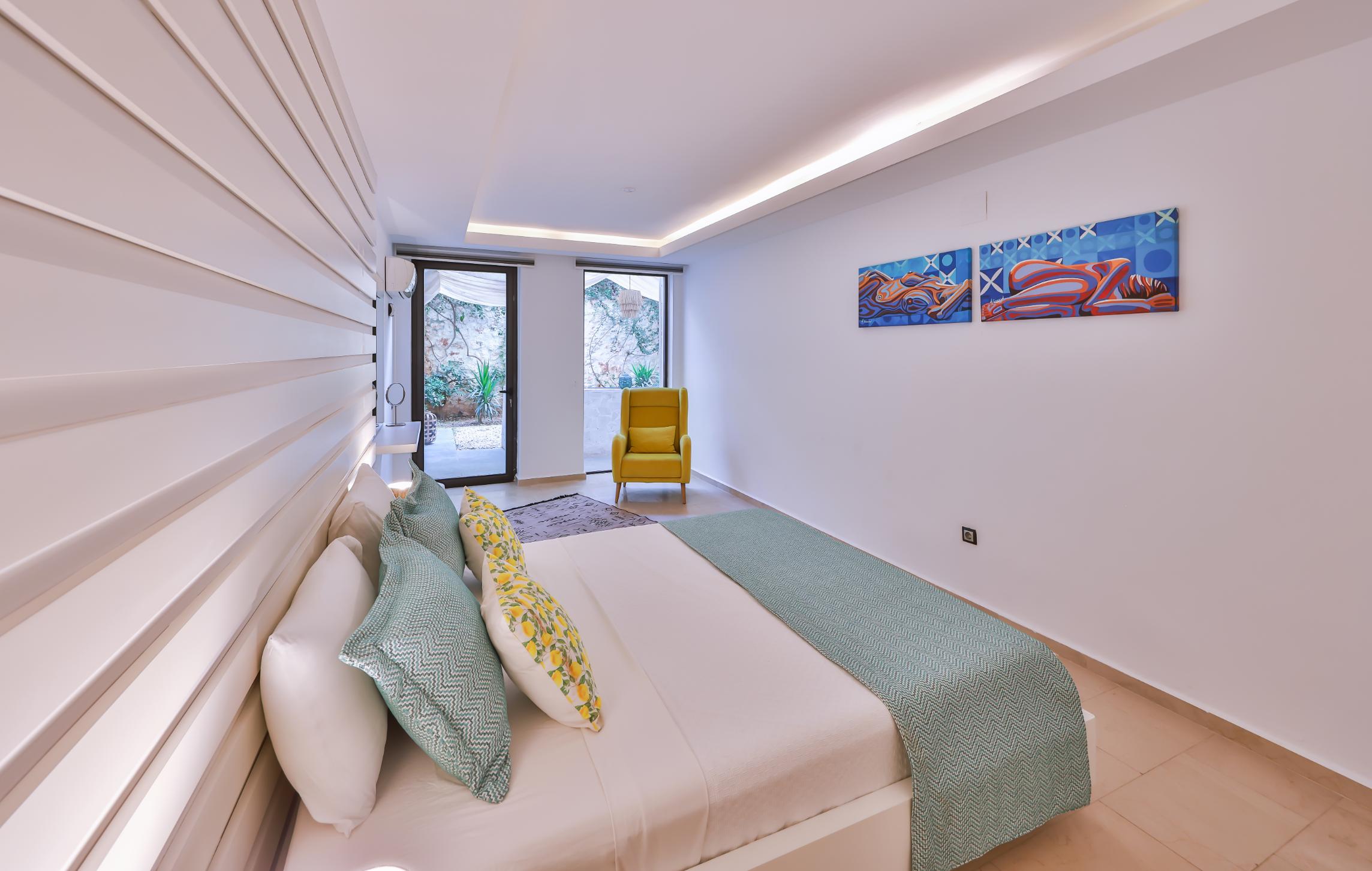 The spacious master bedroom en-suite boasts a king-size bed, fitted wardrobe, comfortable chair, and dressing table. It opens directly onto the lower terrace garden, which is equipped with a circular stone seating area, mini fridge, and bean bags—creating a peaceful oasis within a private fenced garden, perfect for enjoying a drink in the shade in the evening or curling up with a book during the day.