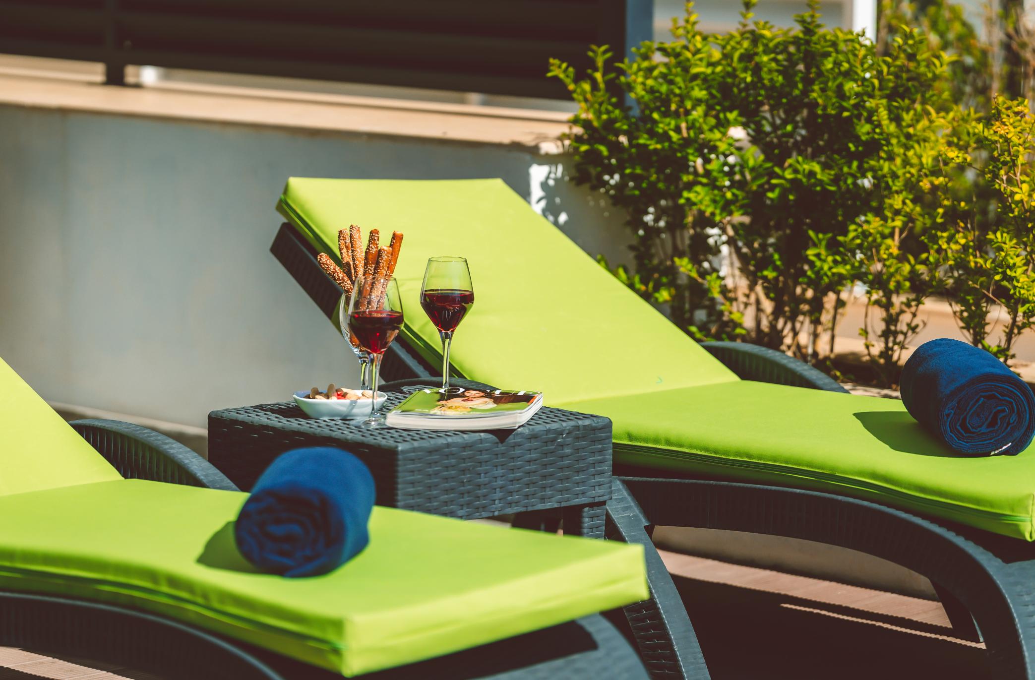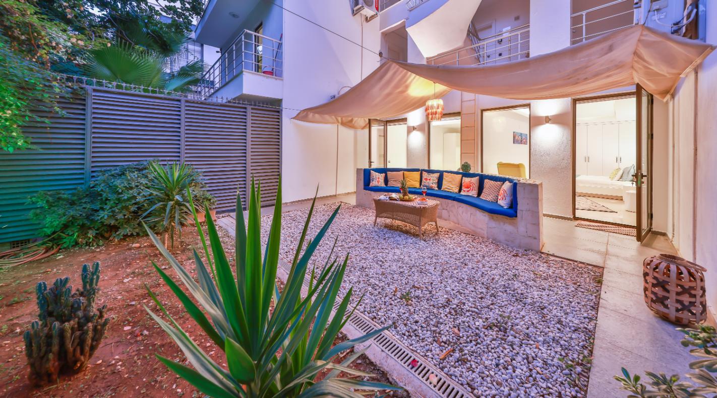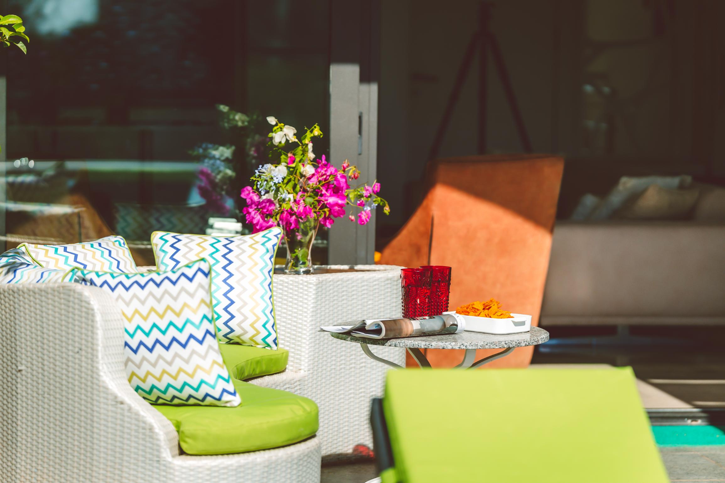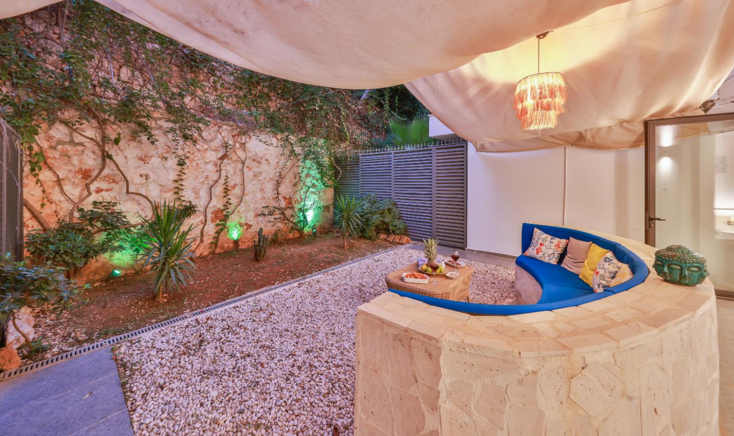 The spacious master bedroom en-suite boasts a king-size bed, fitted wardrobe, comfortable chair, and dressing table. It opens directly onto the lower terrace garden, which is equipped with a circular stone seating area, mini fridge, and bean bags—creating a peaceful oasis within a private fenced garden, perfect for enjoying a drink in the shade in the evening or curling up with a book during the day.