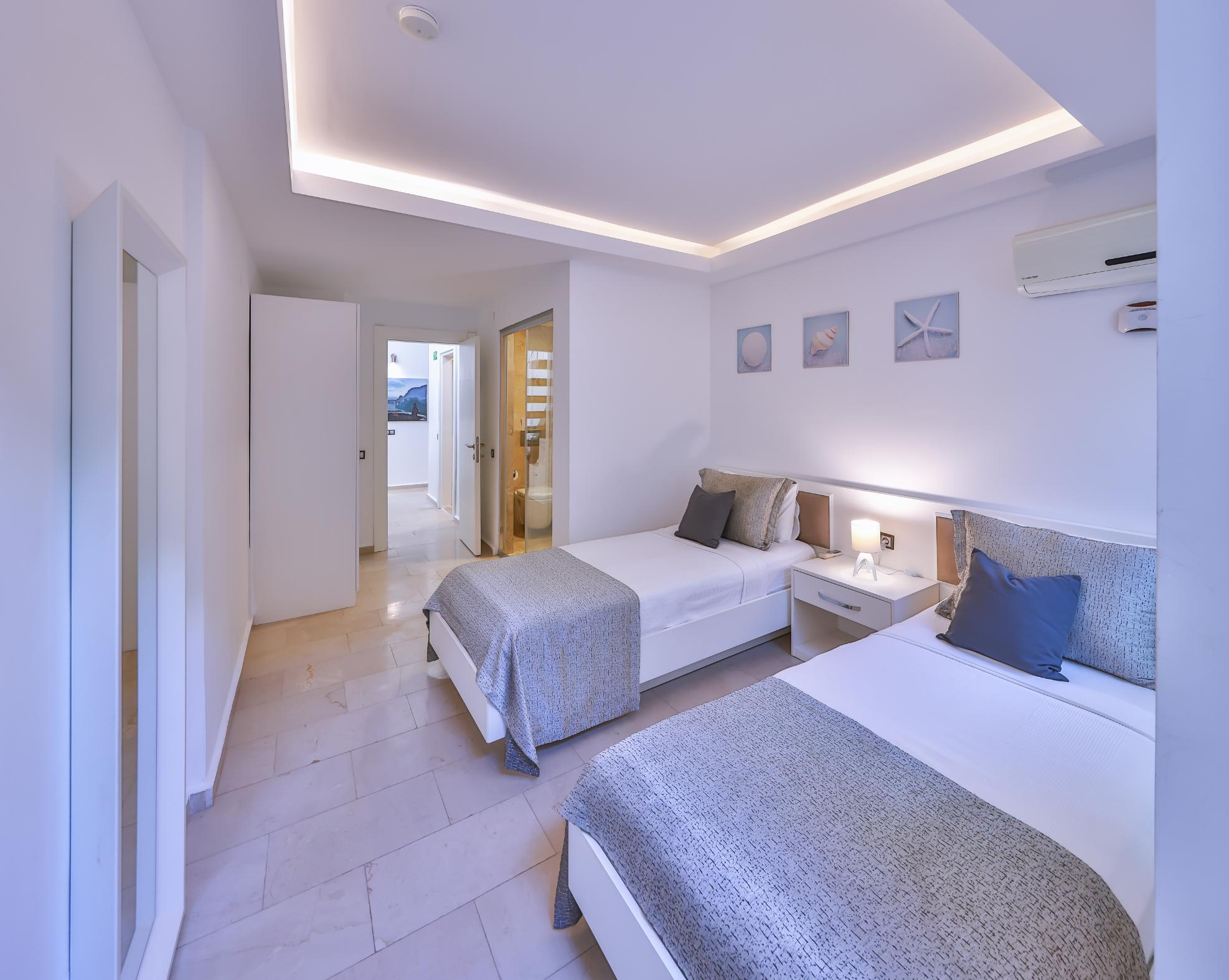The second guest bedroom en-suite features twin beds and also provides access to the lower terrace.