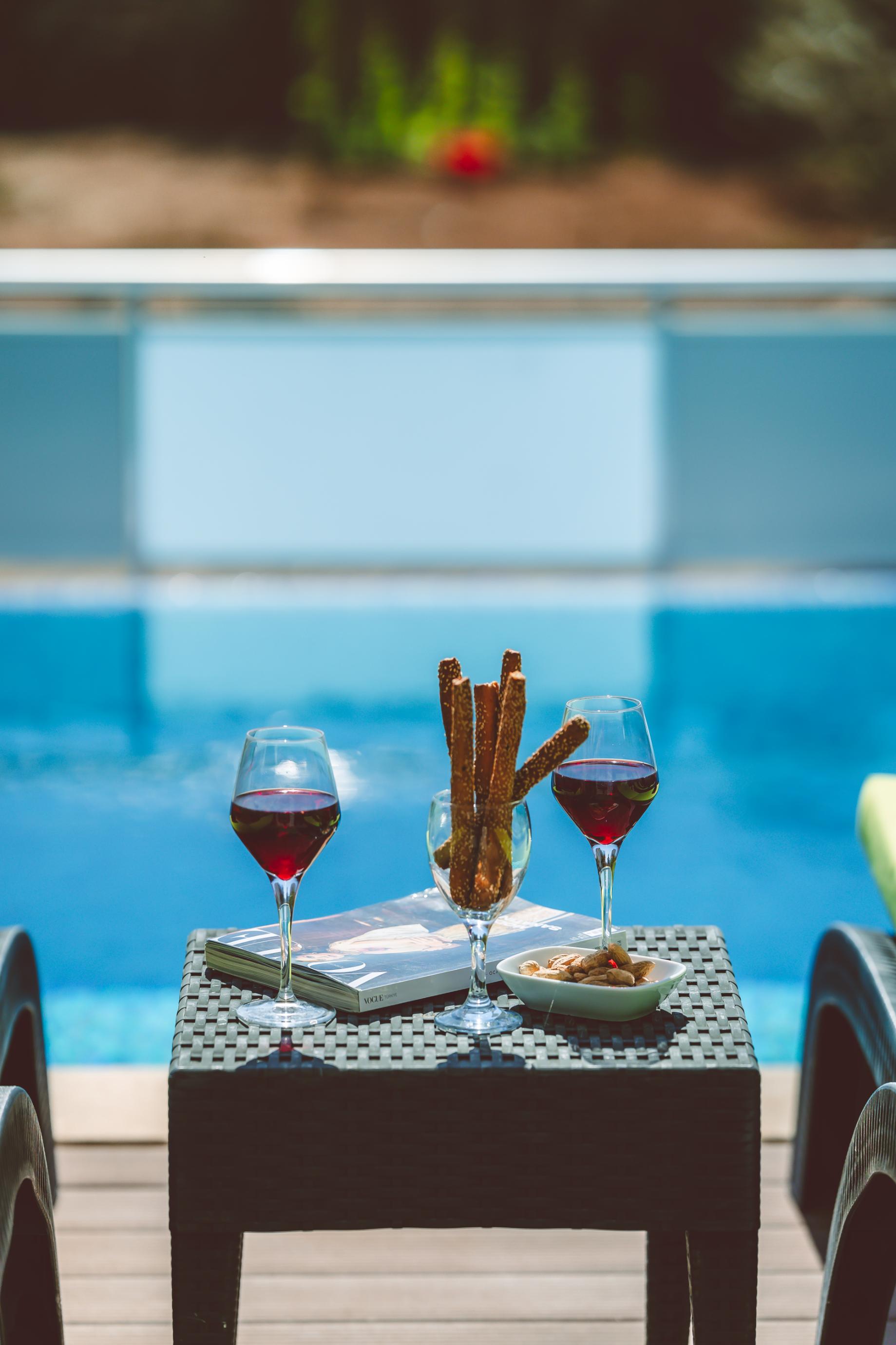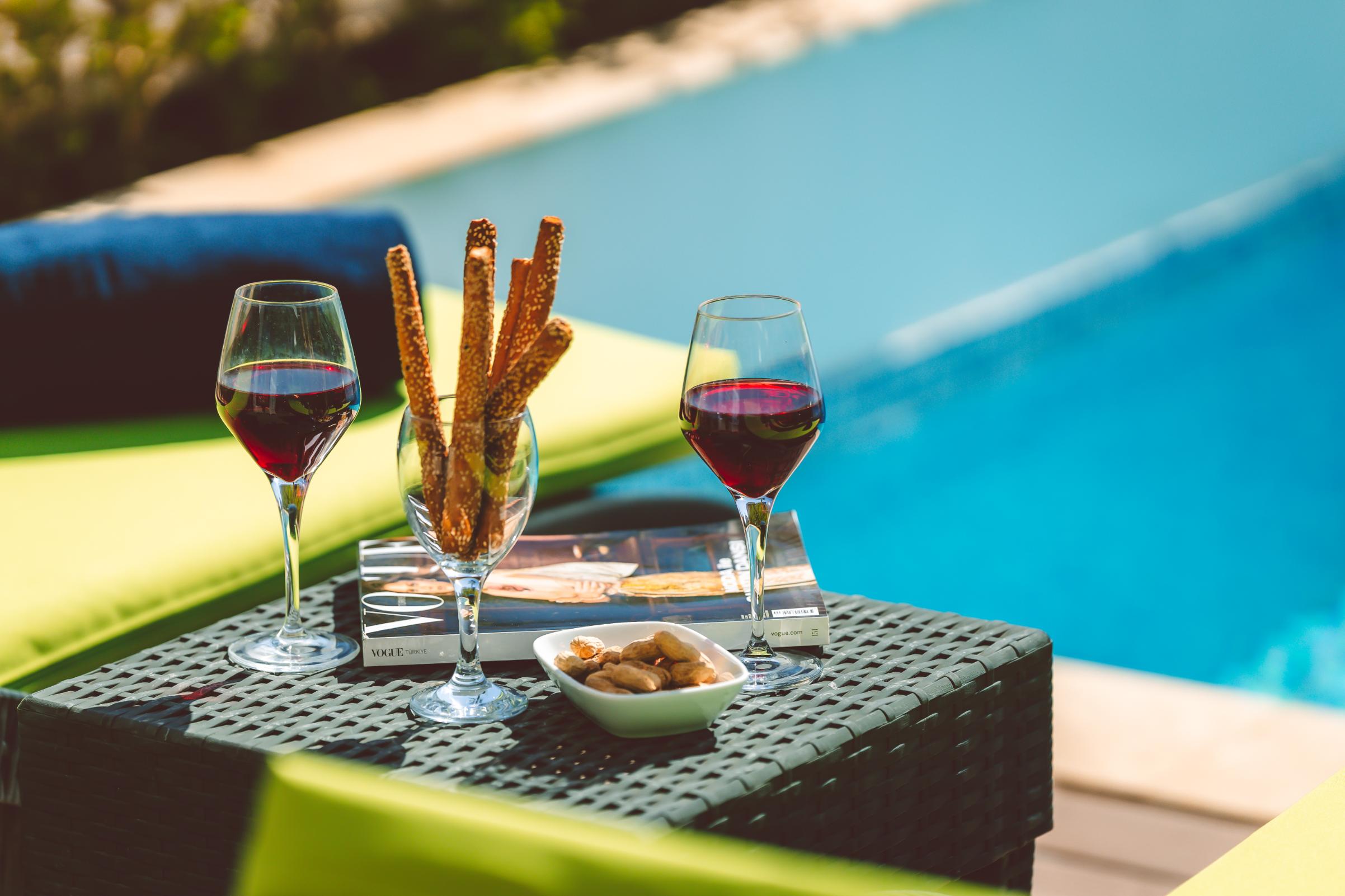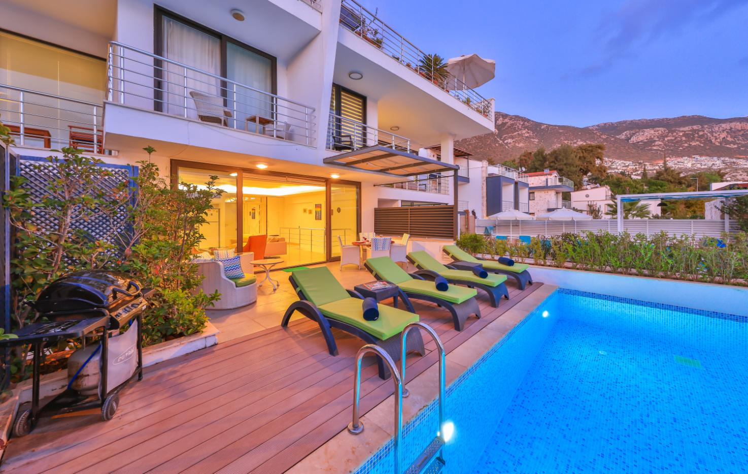 Full-length sliding doors lead to a private pool terrace, which features a shaded dining area and is furnished with plenty of sun loungers.
