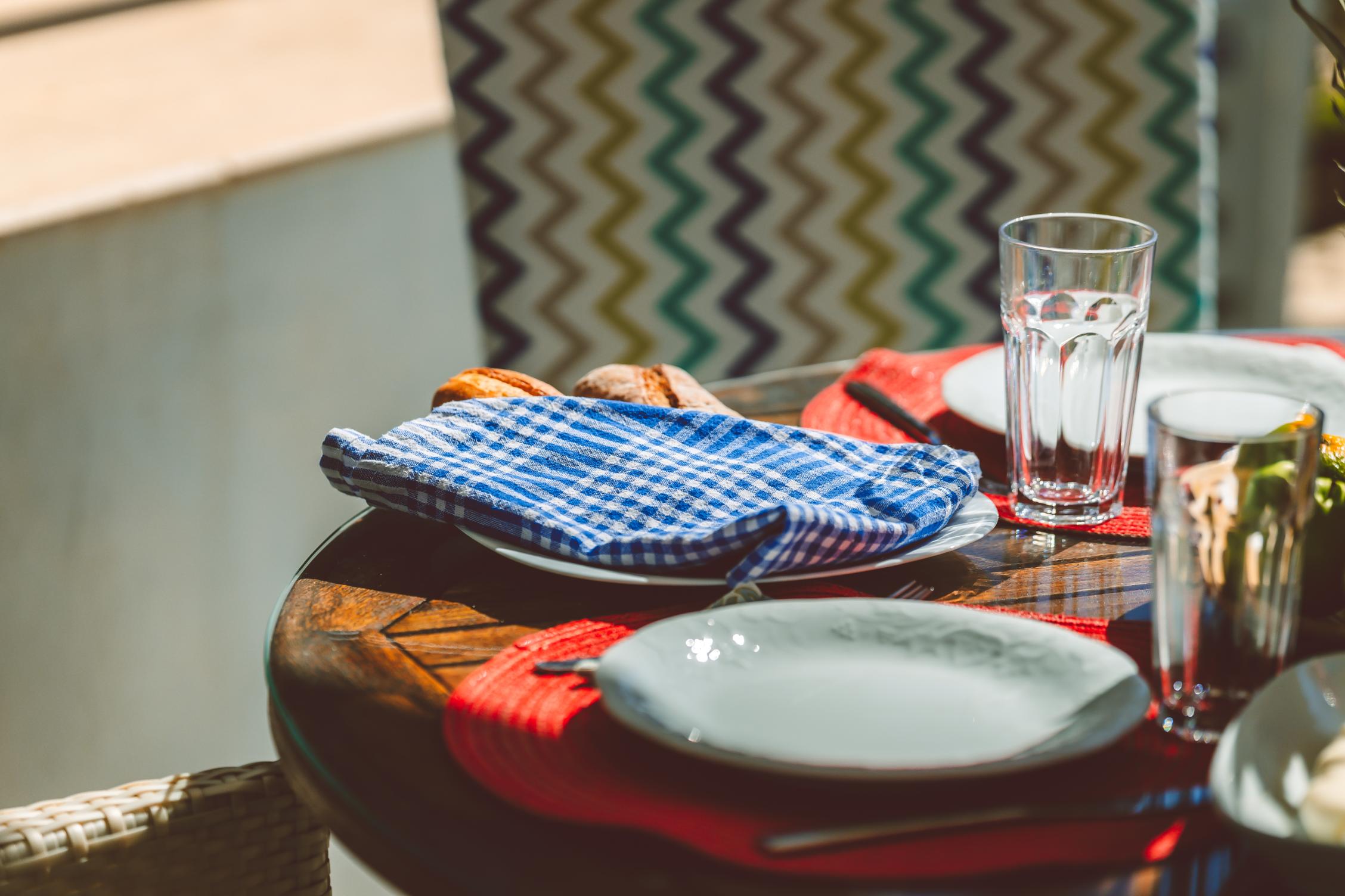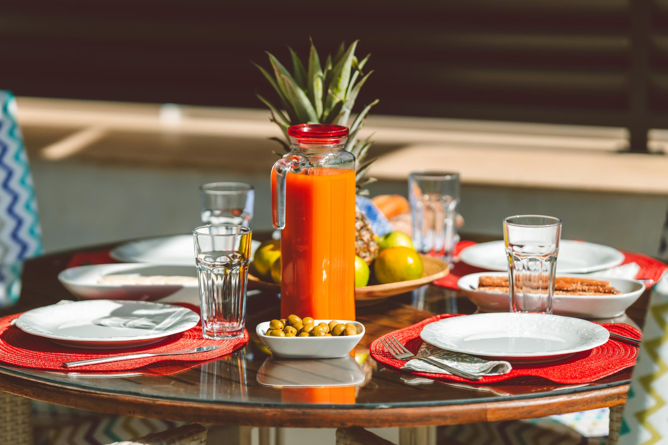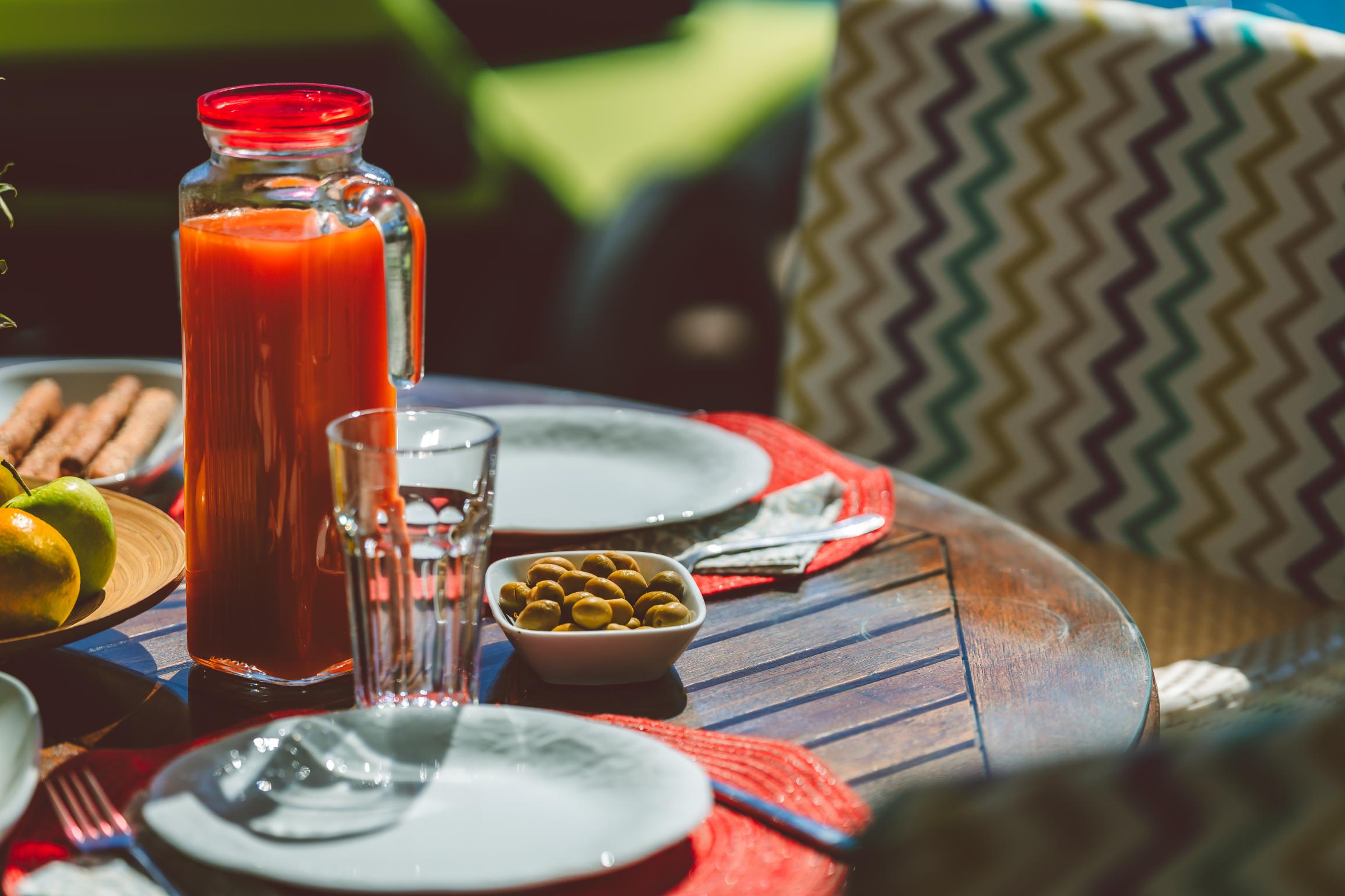 Full-length sliding doors lead to a private pool terrace, which features a shaded dining area and is furnished with plenty of sun loungers.