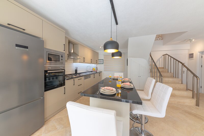 Open-plan living, kitchen and dining area. The kitchen includes a large fridge-freezer, dishwasher, water cooler, oven, hob, extractor and microwave. The living area includes new L shaped sofa, a flat screen smart TV, DVD player and an MP3 docking station.