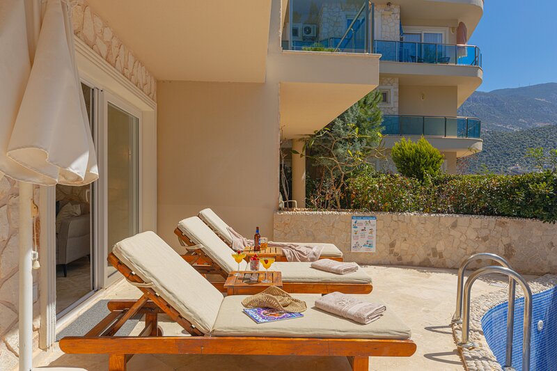 Patio doors from the living area open out onto the apartment's private terrace which is furnished with sunloungers and a dining table and chairs.