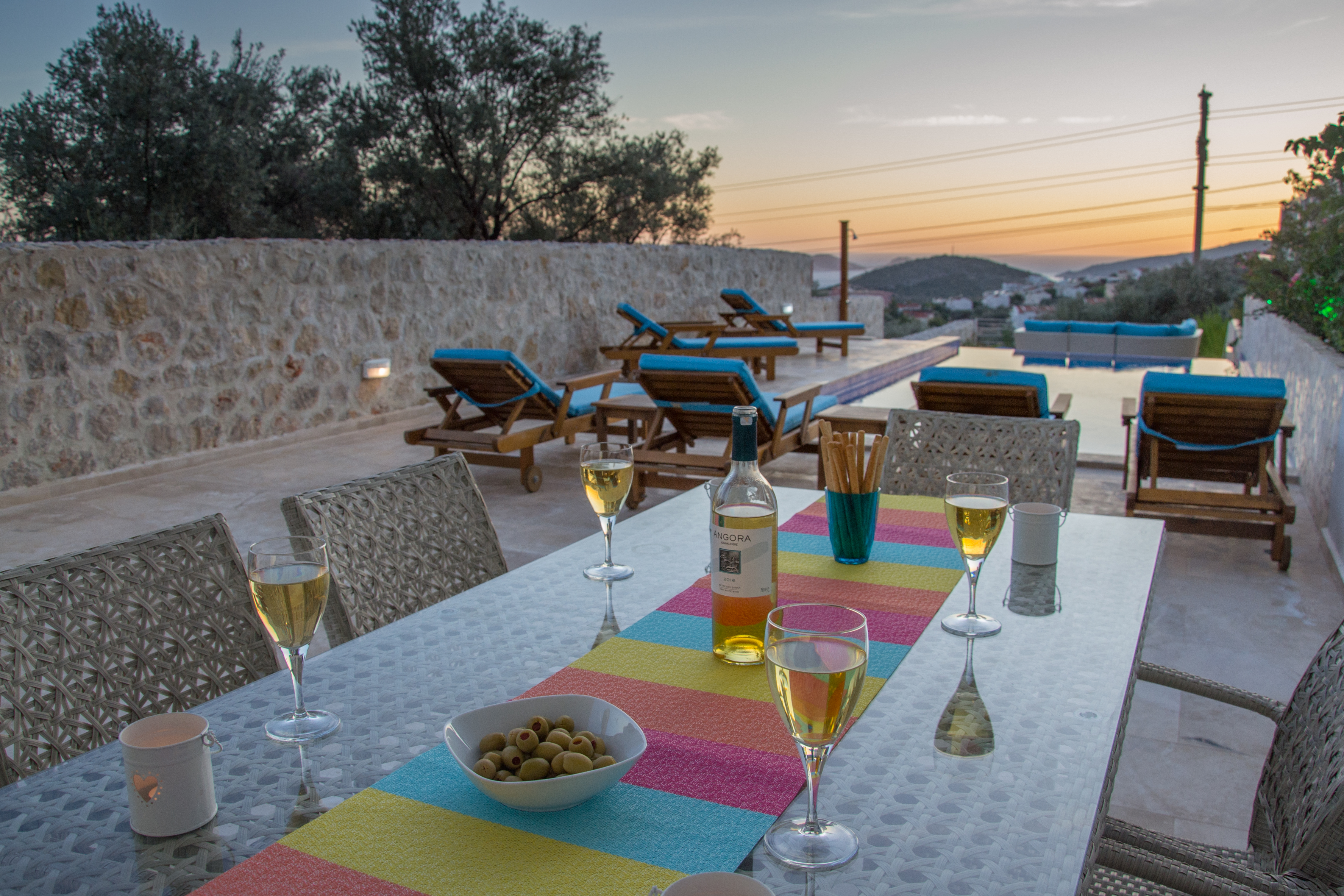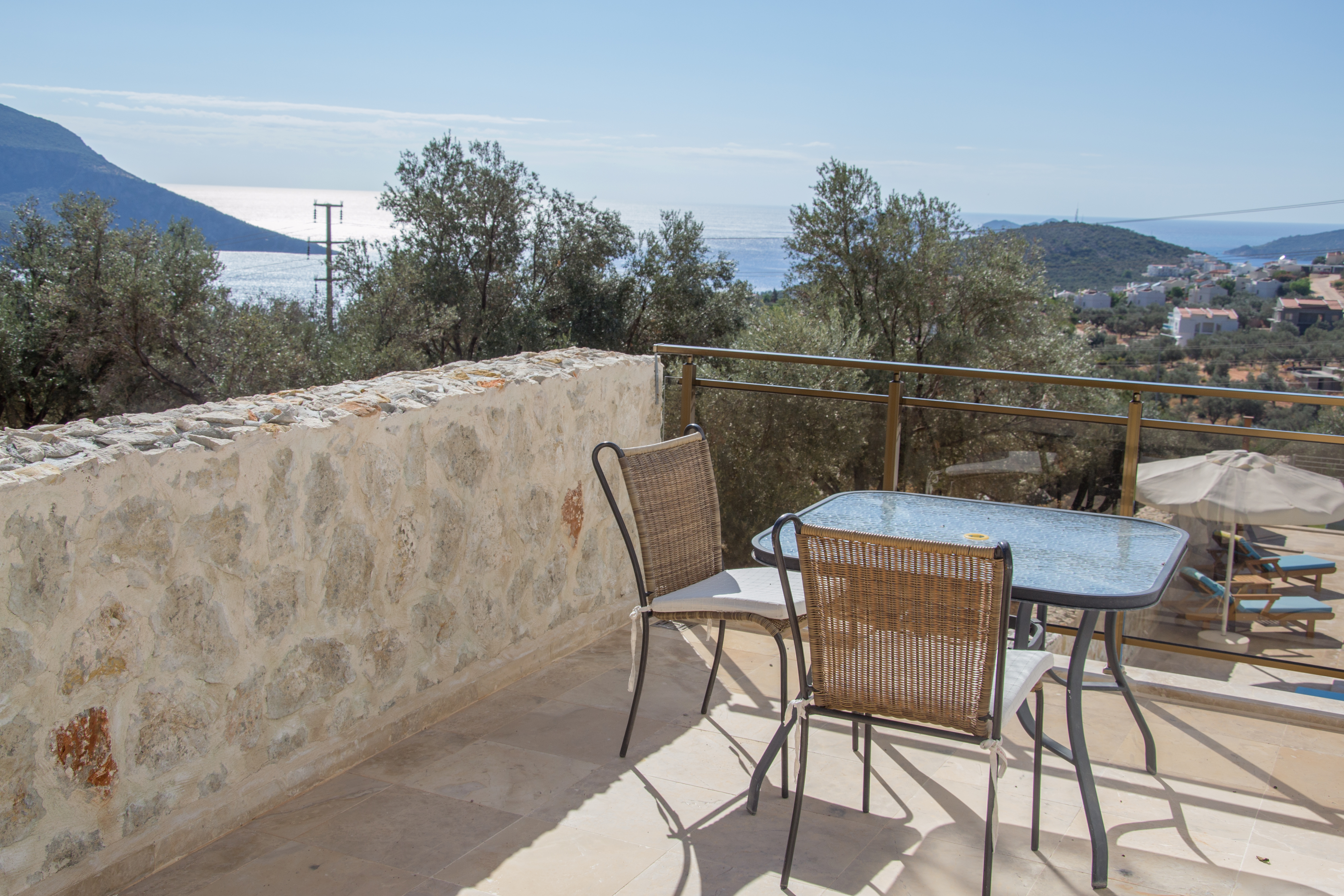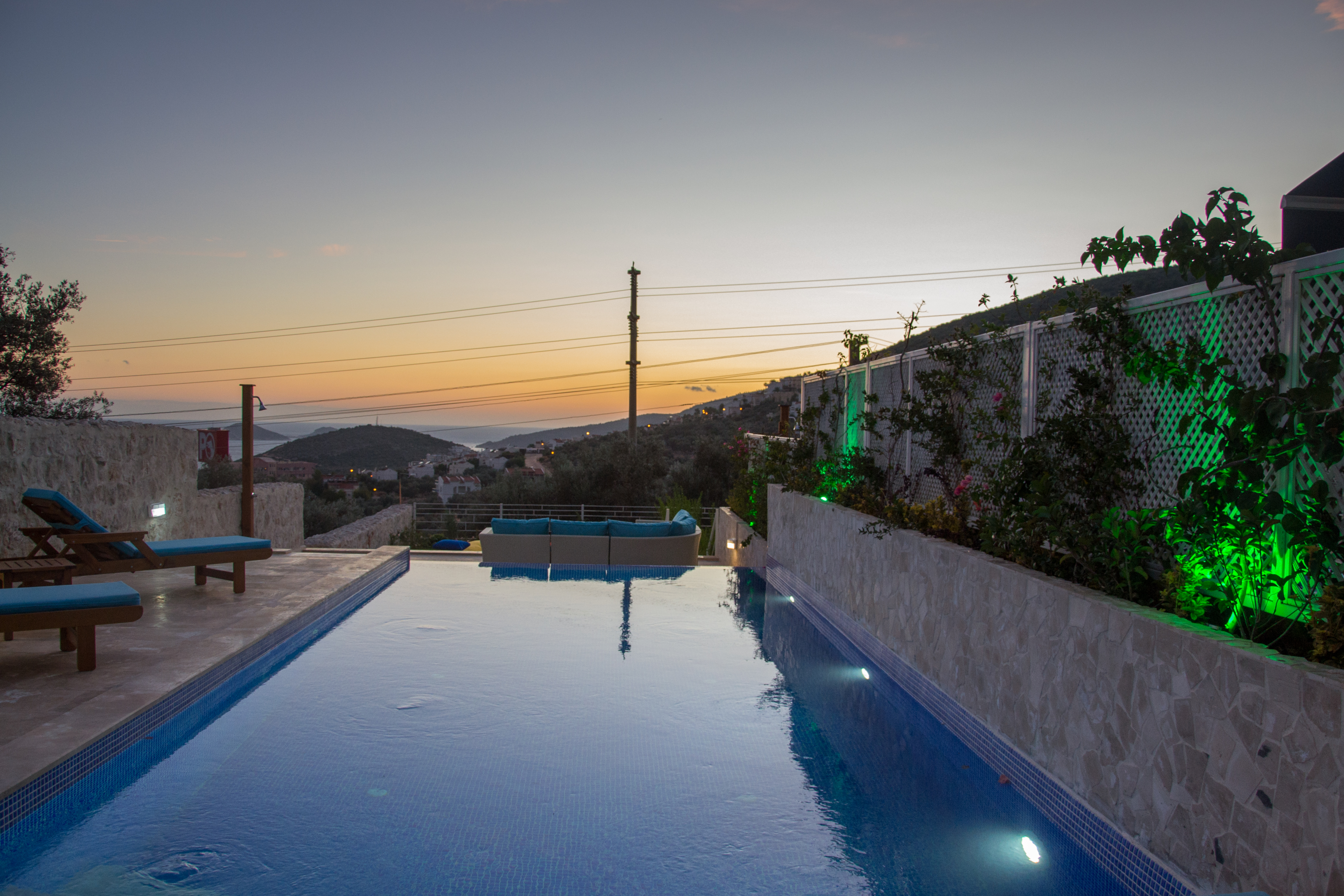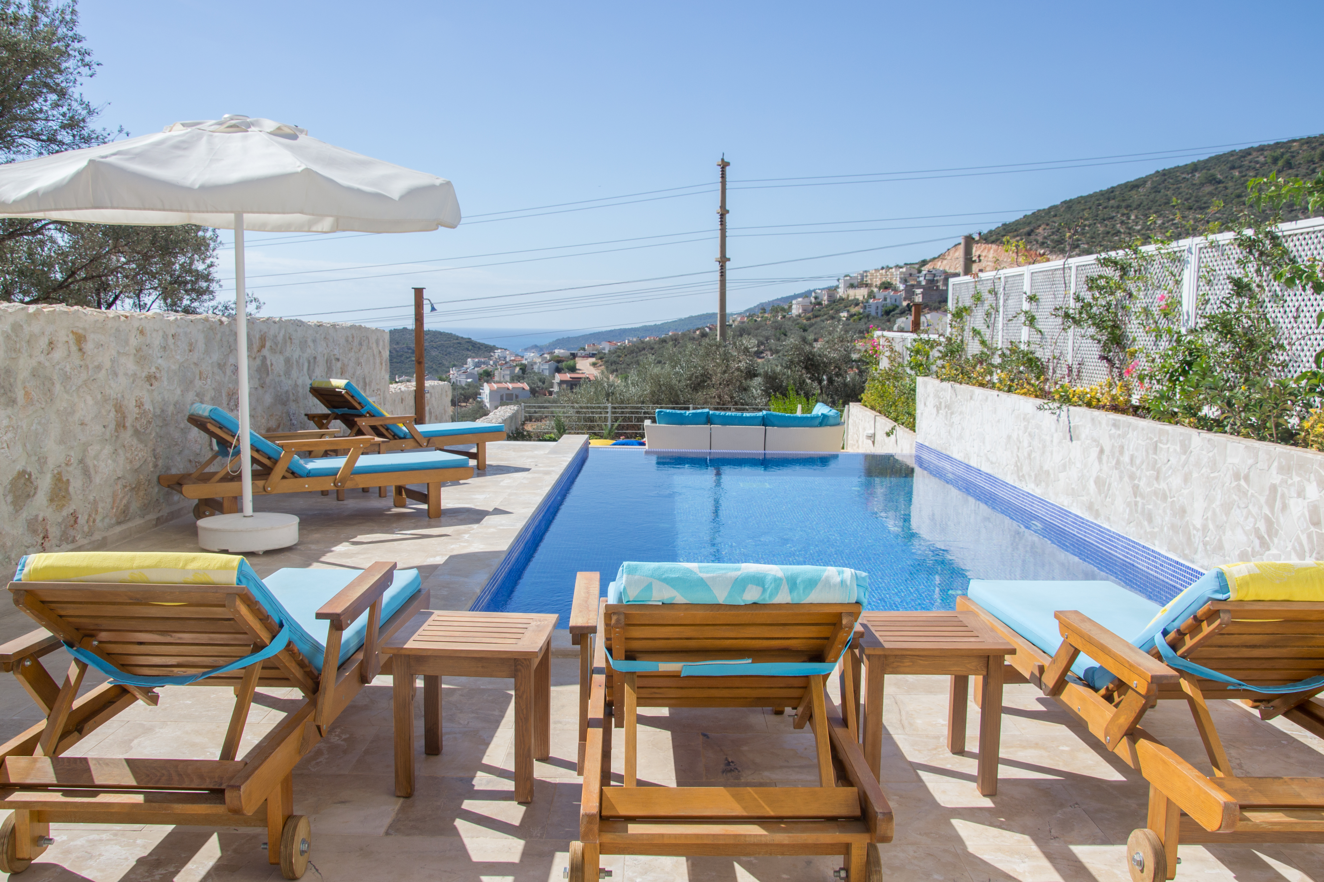 Dalora has a large infinity pool with plenty of space for 6 sunbeds, parasols and beanbags followed by a further terrace with an outside shower and yet more seating area and garden for guests to enjoy the sea or mountain view or the beautiful sunsets in the evening.