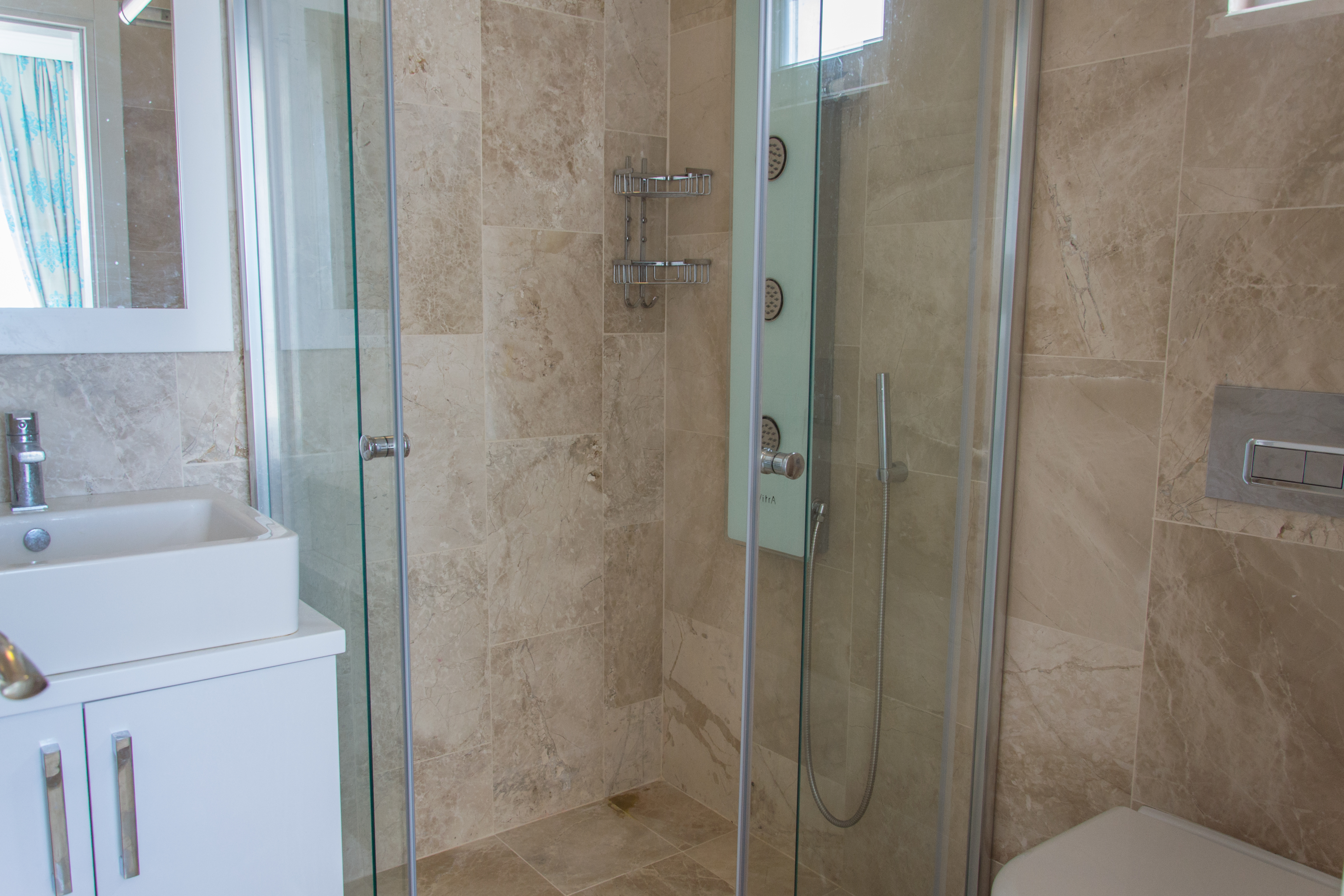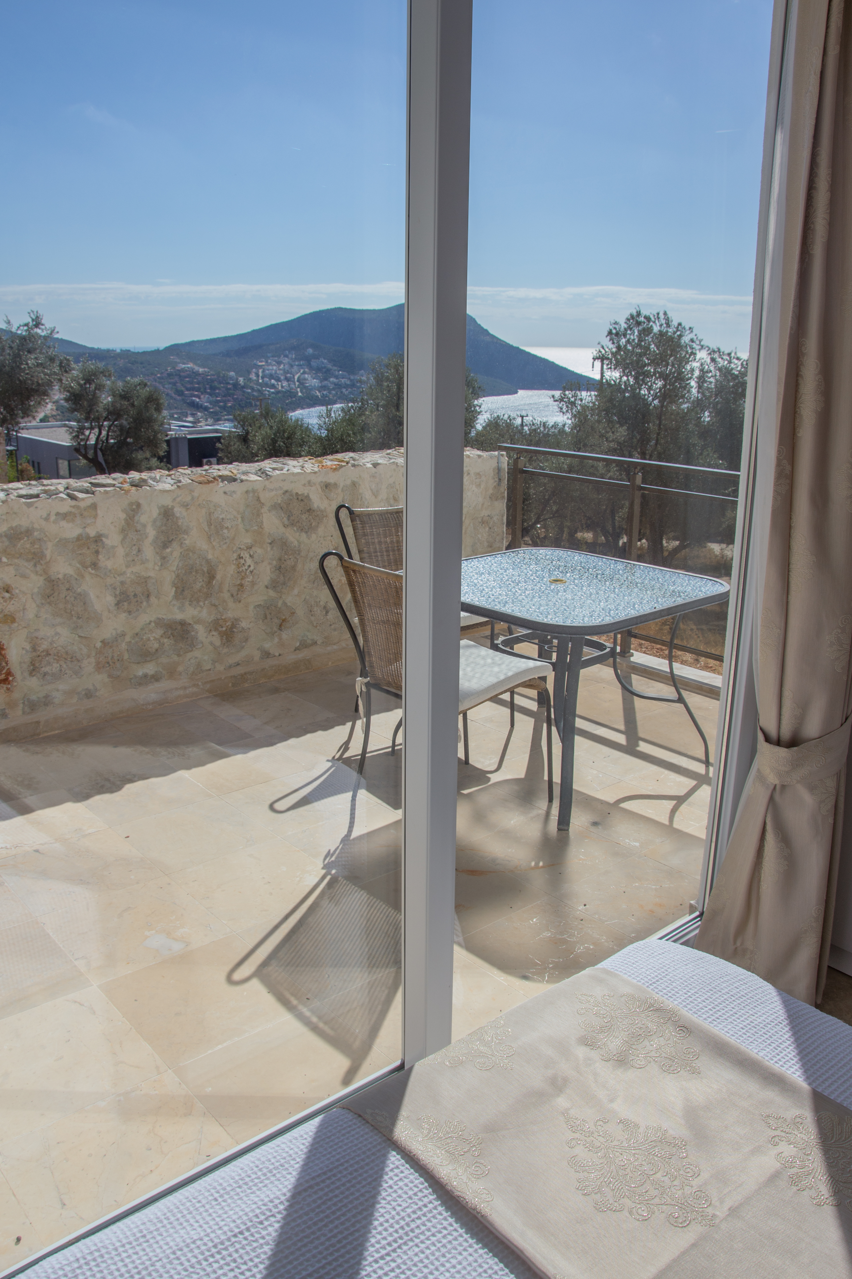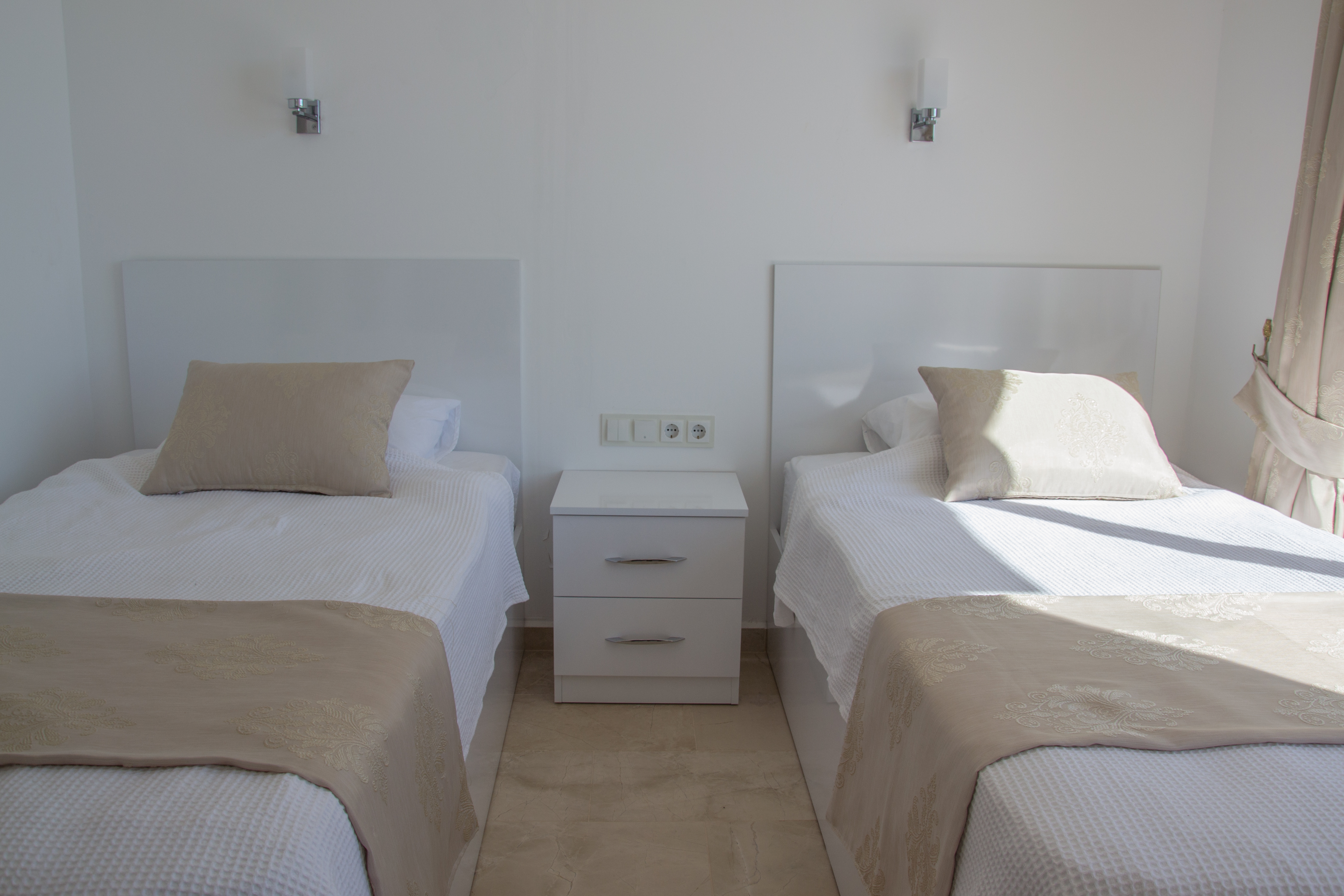 On the upper floor is the second double bedroom which has a balcony, perfect for sitting and enjoying the sea/town views. The twin room is also on this floor and benefits from patio doors opening on to an extensive wraparound terrace with superb sea and mountain views. Hair dryers are supplied in each bedroom, together with linens and beach towels.