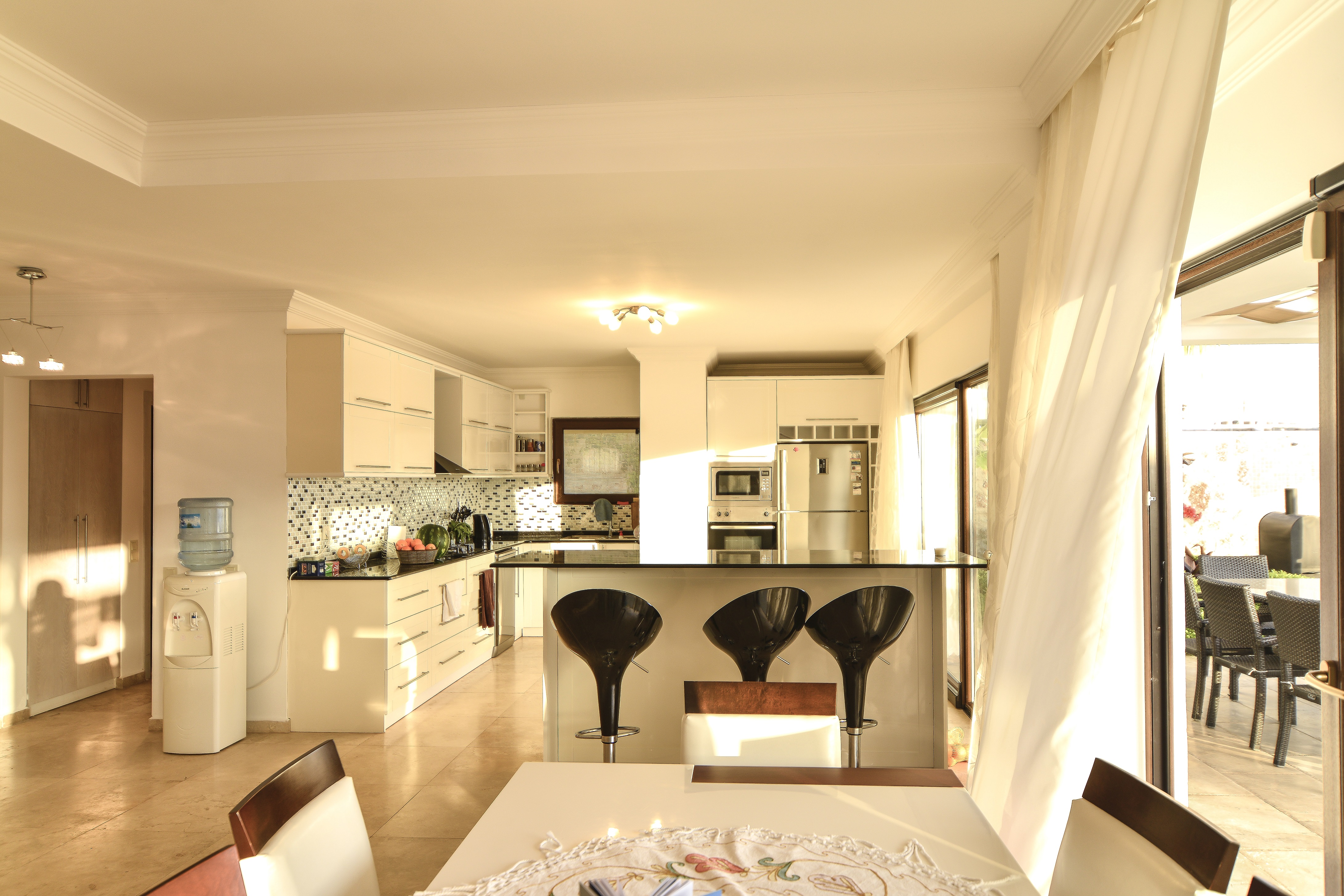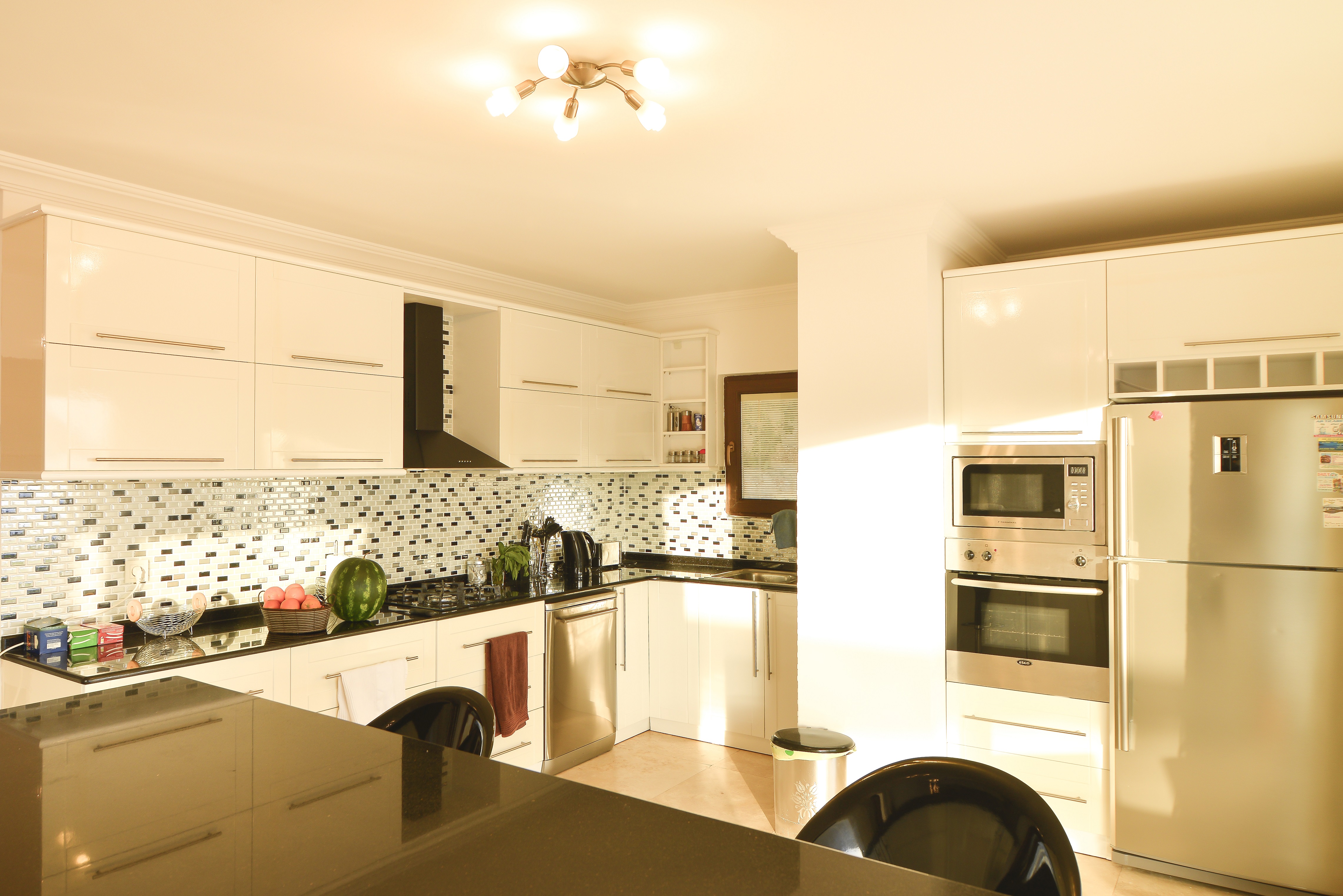 Beautiful hand made high gloss white kitchen with soft close doors and island breakfast table. Including cooker, hob, built in microwave, American fridge freezer, toaster, water dispenser, dishwasher, kettle & Ipod dock