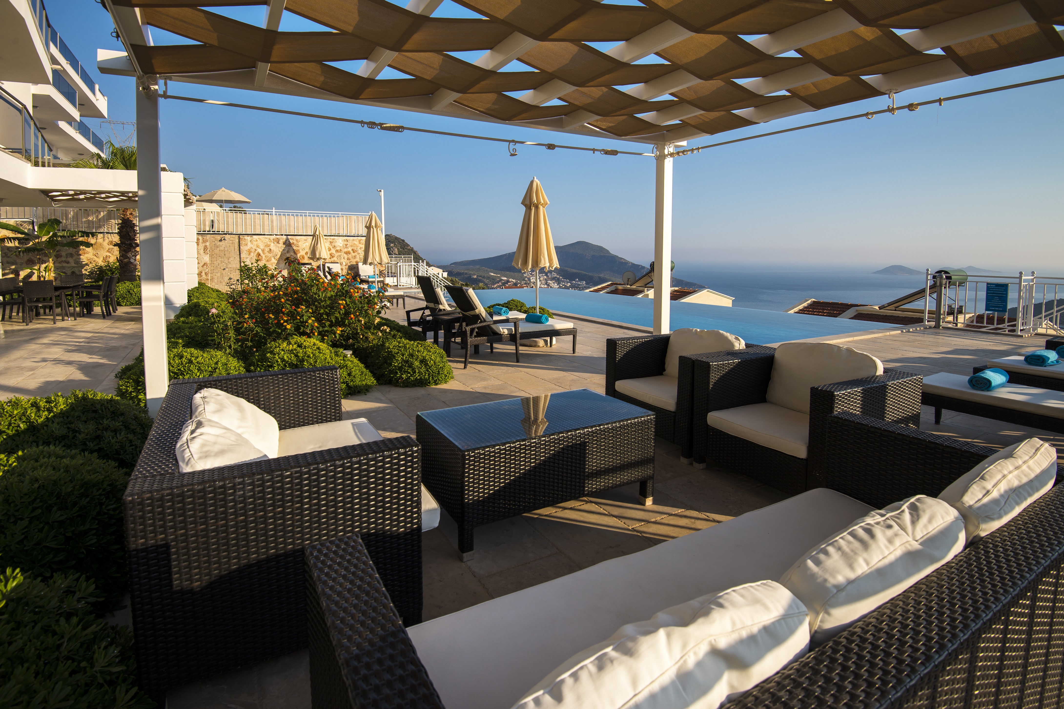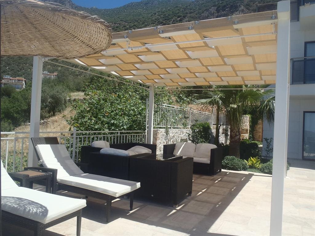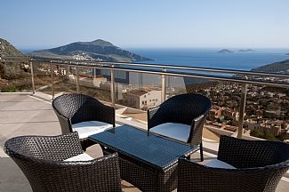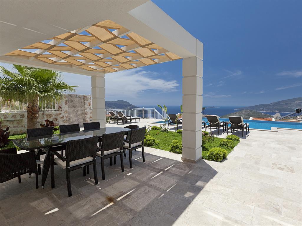 Situated on a peaceful hillside location, a mere 3 min drive/taxi ride into Kalkan. Sleeps 15 (7 bedrooms, plus a sofa bed in the lounge) in total luxury.