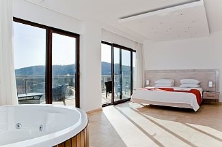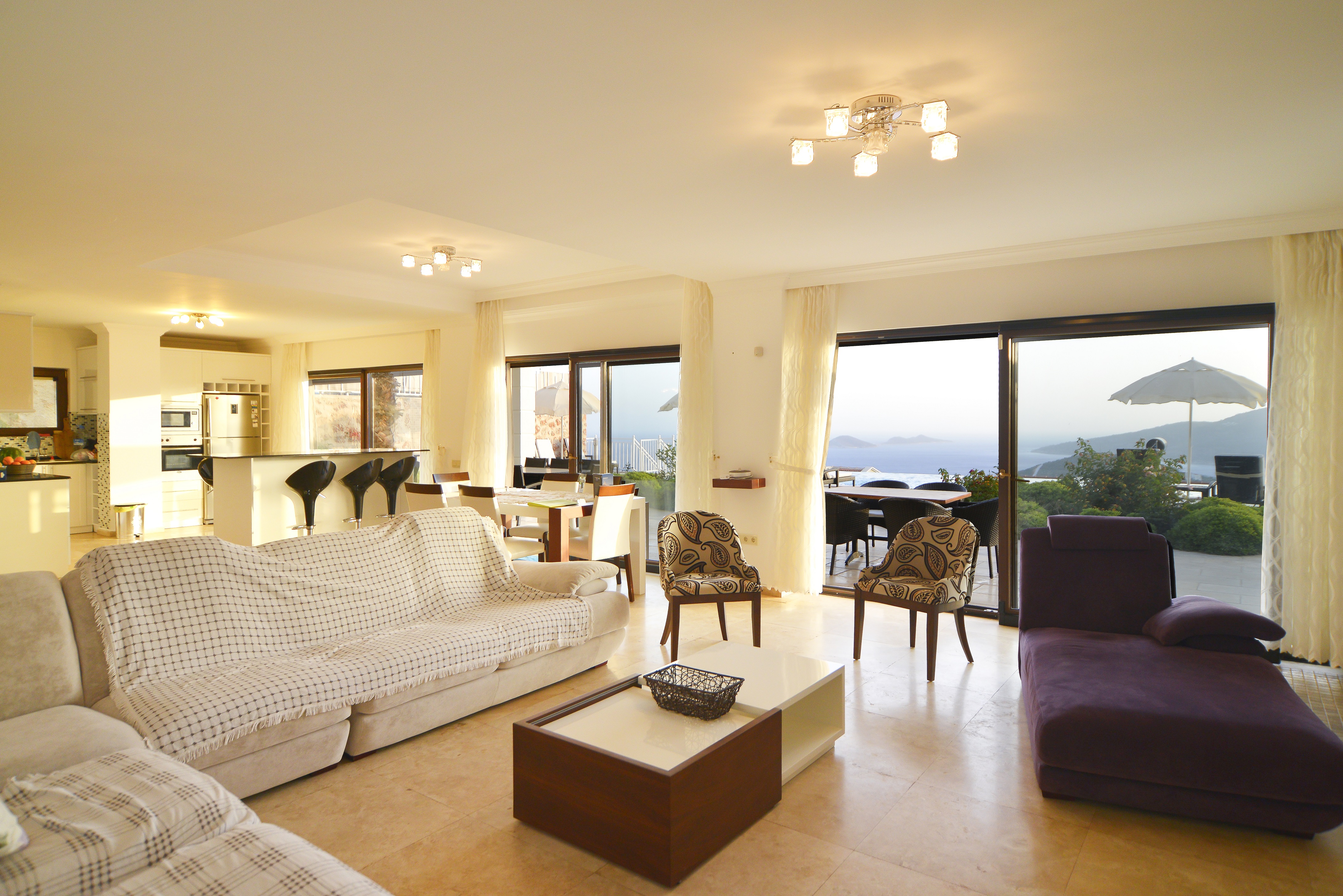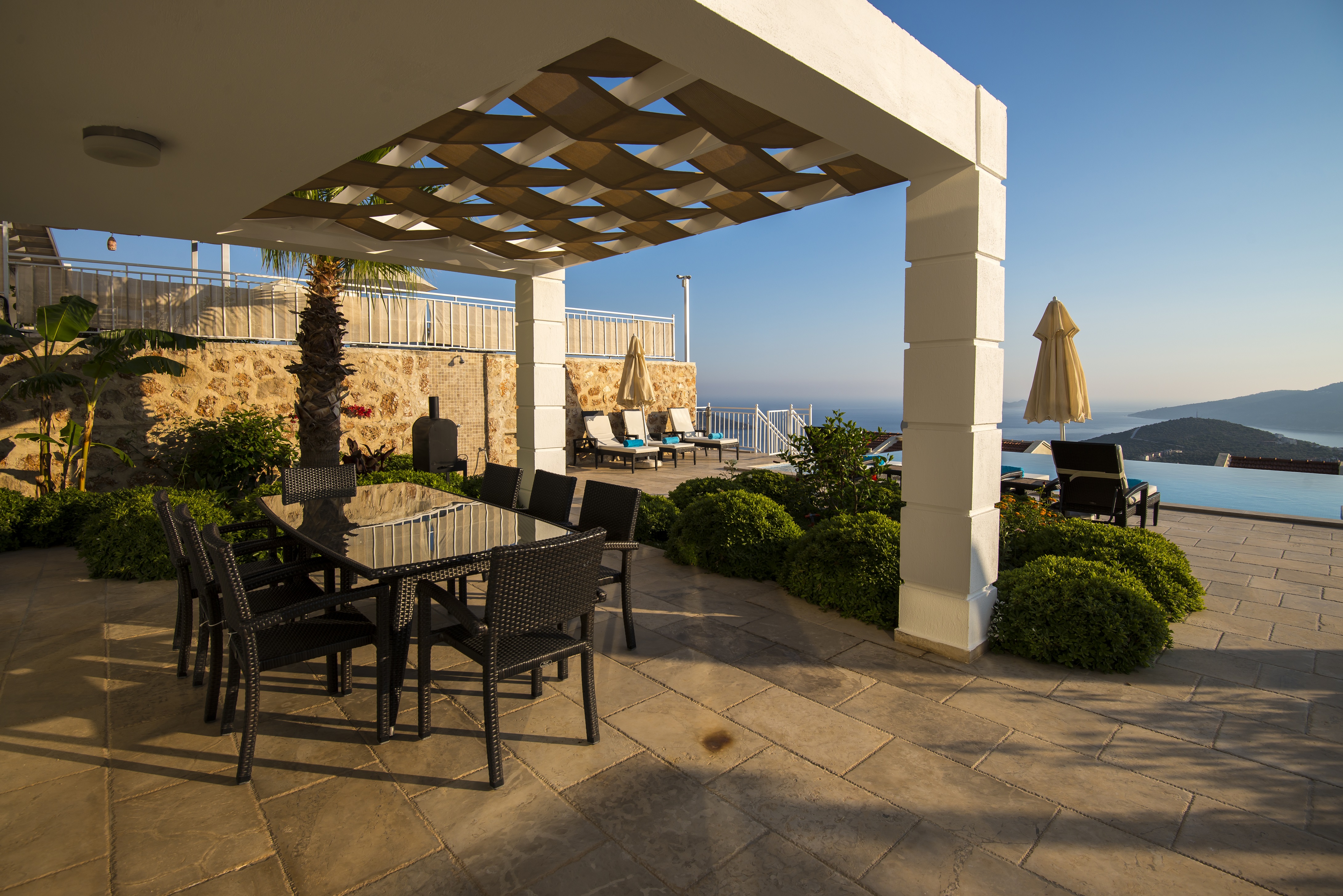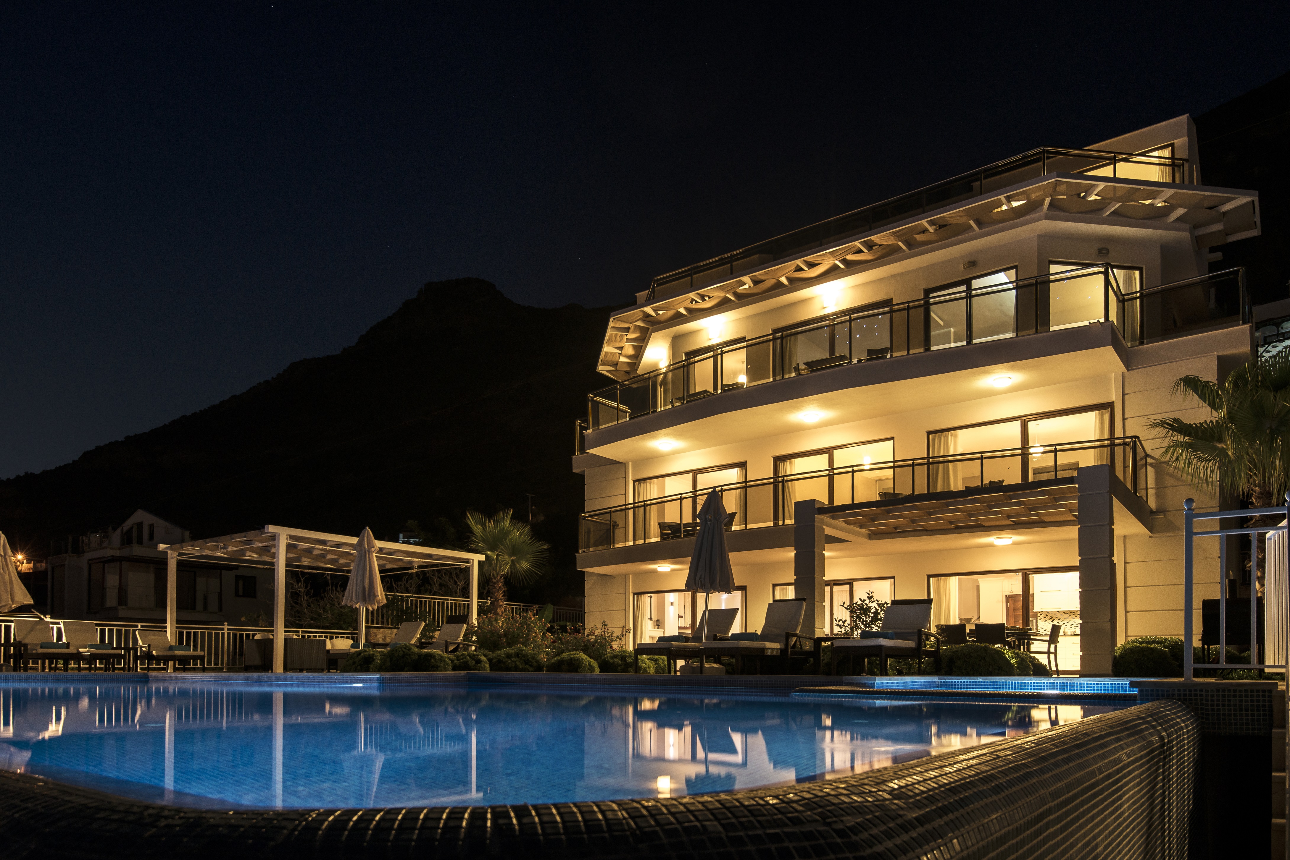 Situated on a peaceful hillside location, a mere 3 min drive/taxi ride into Kalkan. Sleeps 15 (7 bedrooms, plus a sofa bed in the lounge) in total luxury.