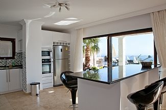The lounge and dining area offer contemporary coordinated open plan space. two French doors out onto the pool area creates light & space. Large satellite TV, DVD, I pod dock & unlimited WIFI provide entertainment. There is plenty of seating for 14 including a sofa bed.