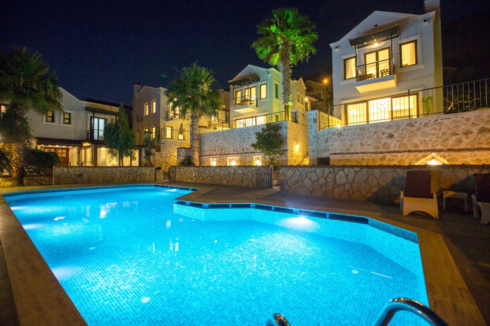 The villas share a large communal pool, 16m long and 8m wide with a shallow end. There are ample sun loungers and pool side tables by the pool.