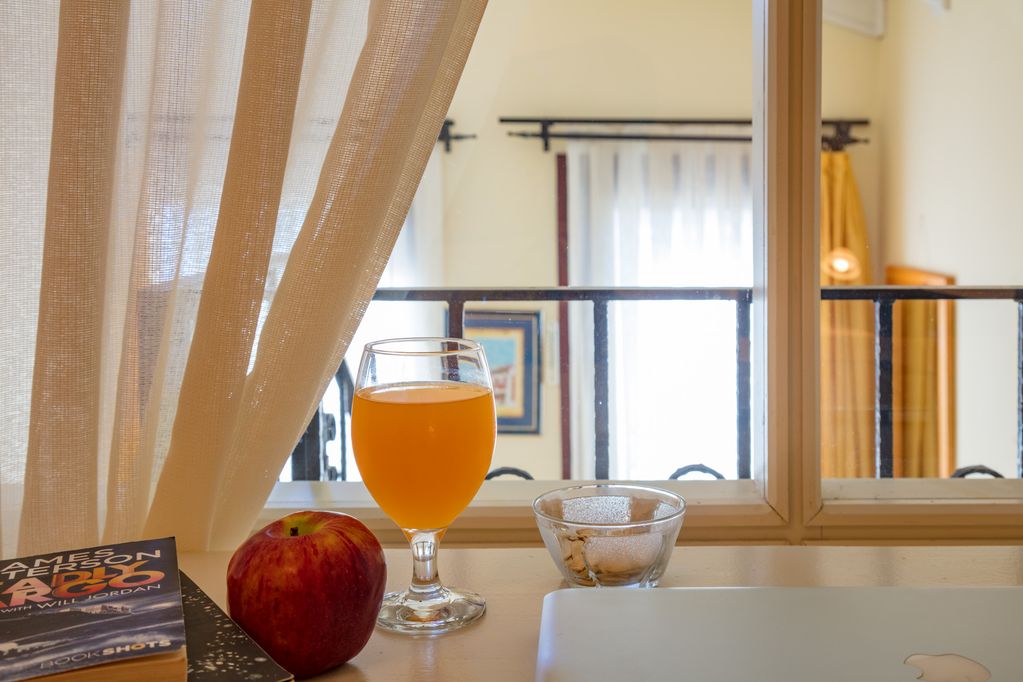 As you enter the apartment it opens out into the open plan lounge and kitchen. The lounge area has a flat screen TV with limited English channels, but does have a DVD player for you to hook up to, plus free wi-fi. The kitchen is sufficiently stocked, with a coffee machine, toaster and plenty of plates/glasses for preparing light meals.