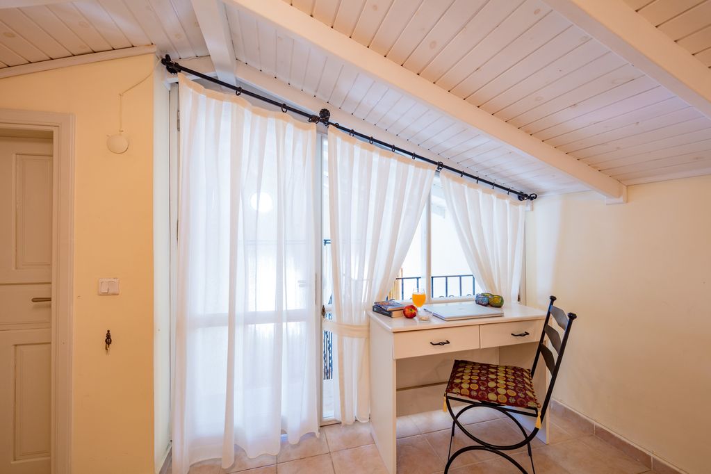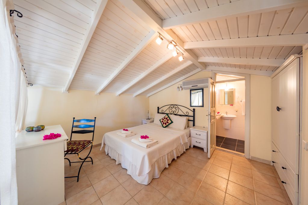 Up the stairs and to the left is the master en-suite bedroom with sloping roof. To the right off the stairs is the wonderful sea view roof terrace with 4 sunbeds, table and 6 chairs and BBQ.