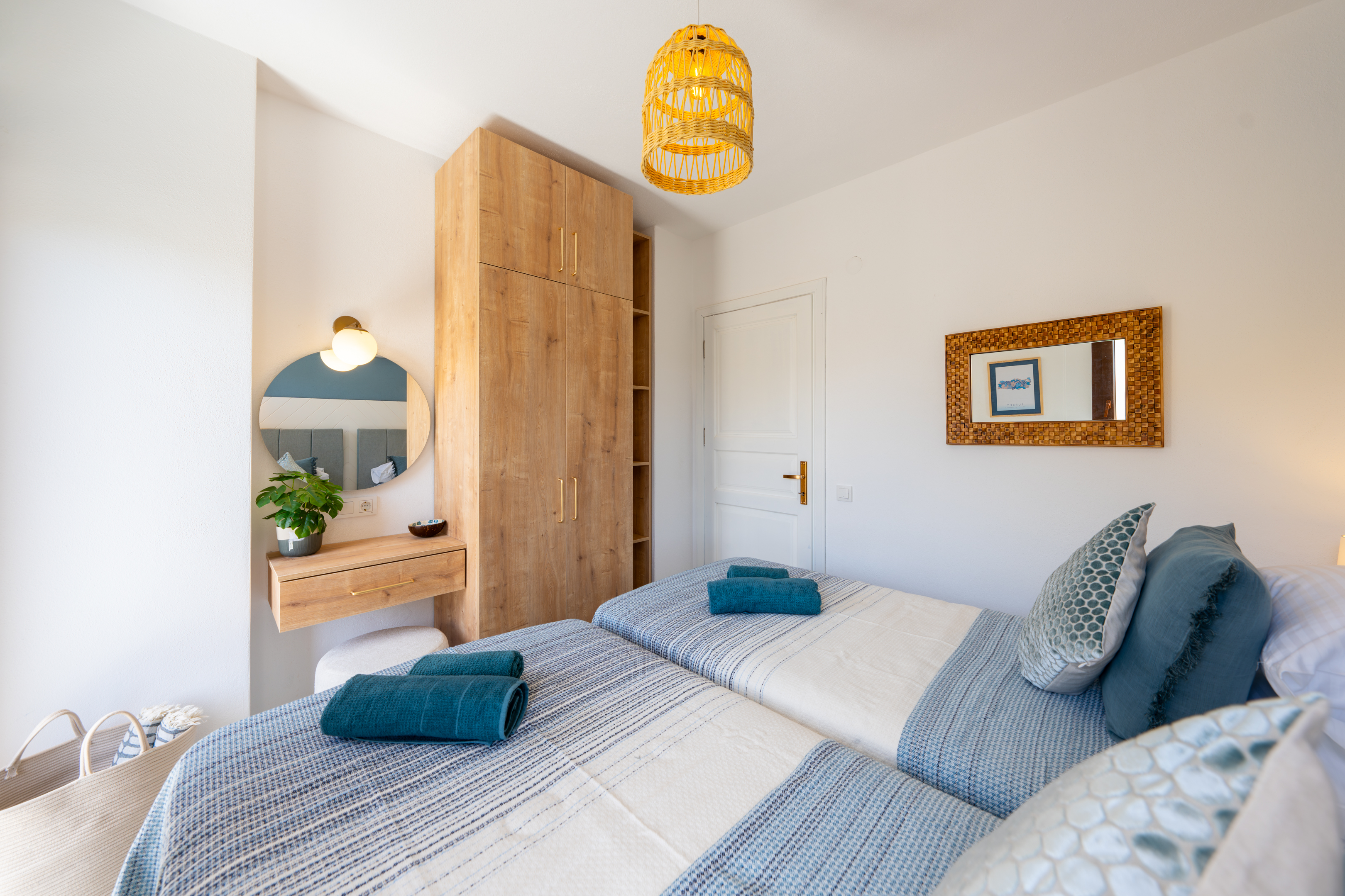 Bedroom 2 (twin/double) – this bedroom offers flexible sleeping accommodation, as it can be configured with either twin beds, or a king size bed. The beds are brand new, and have comfortable mattresses, and a padded headboard, & bedside tables with lamps. Fitted wardrobe & open shelves, plus separate vanity unit with mirror. Door which connects with the balcony