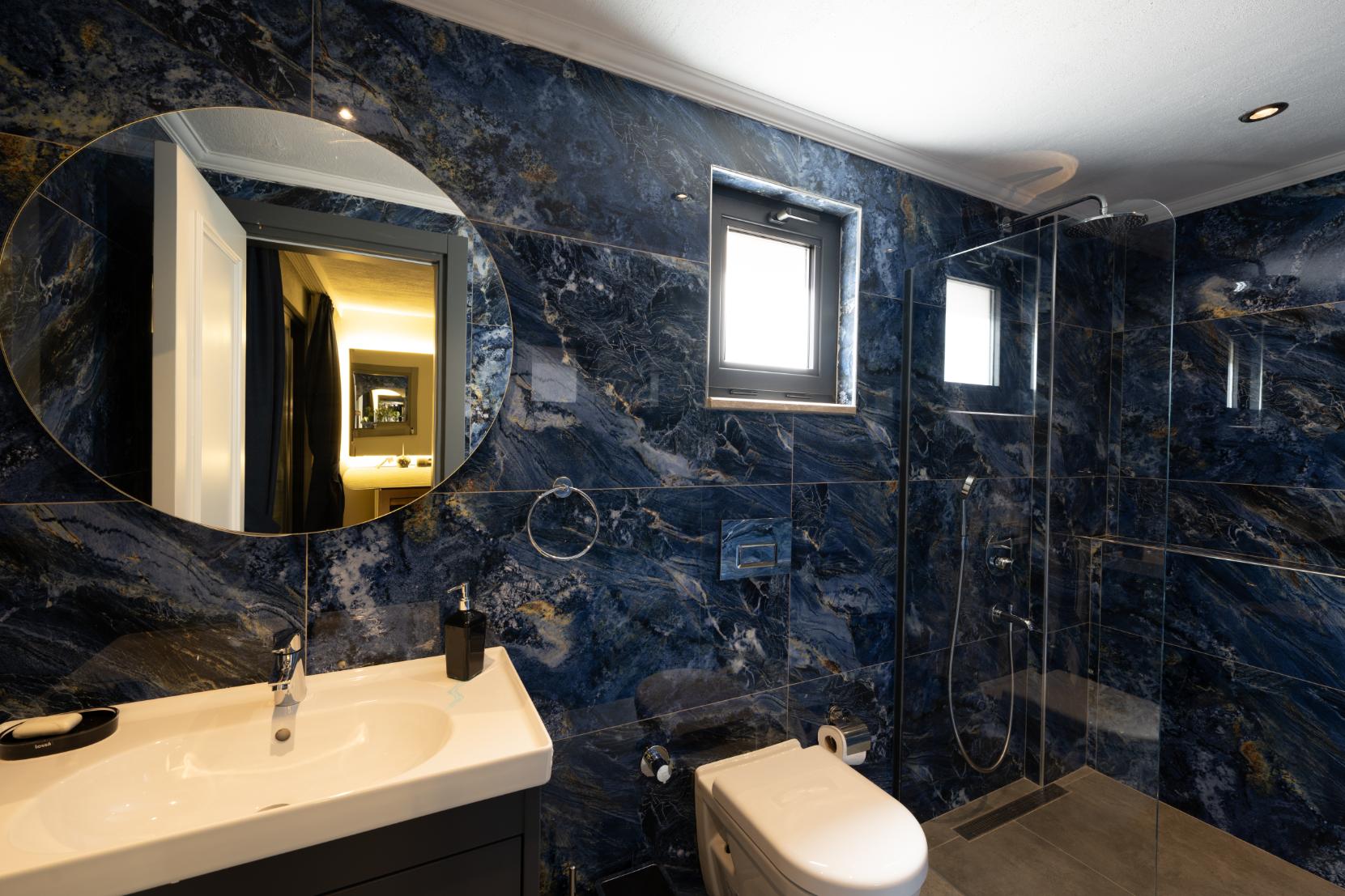 - Large double bedroom with en‑suite shower, wardrobe and dressing table; glass door leads to stairs down to the indoor pool.