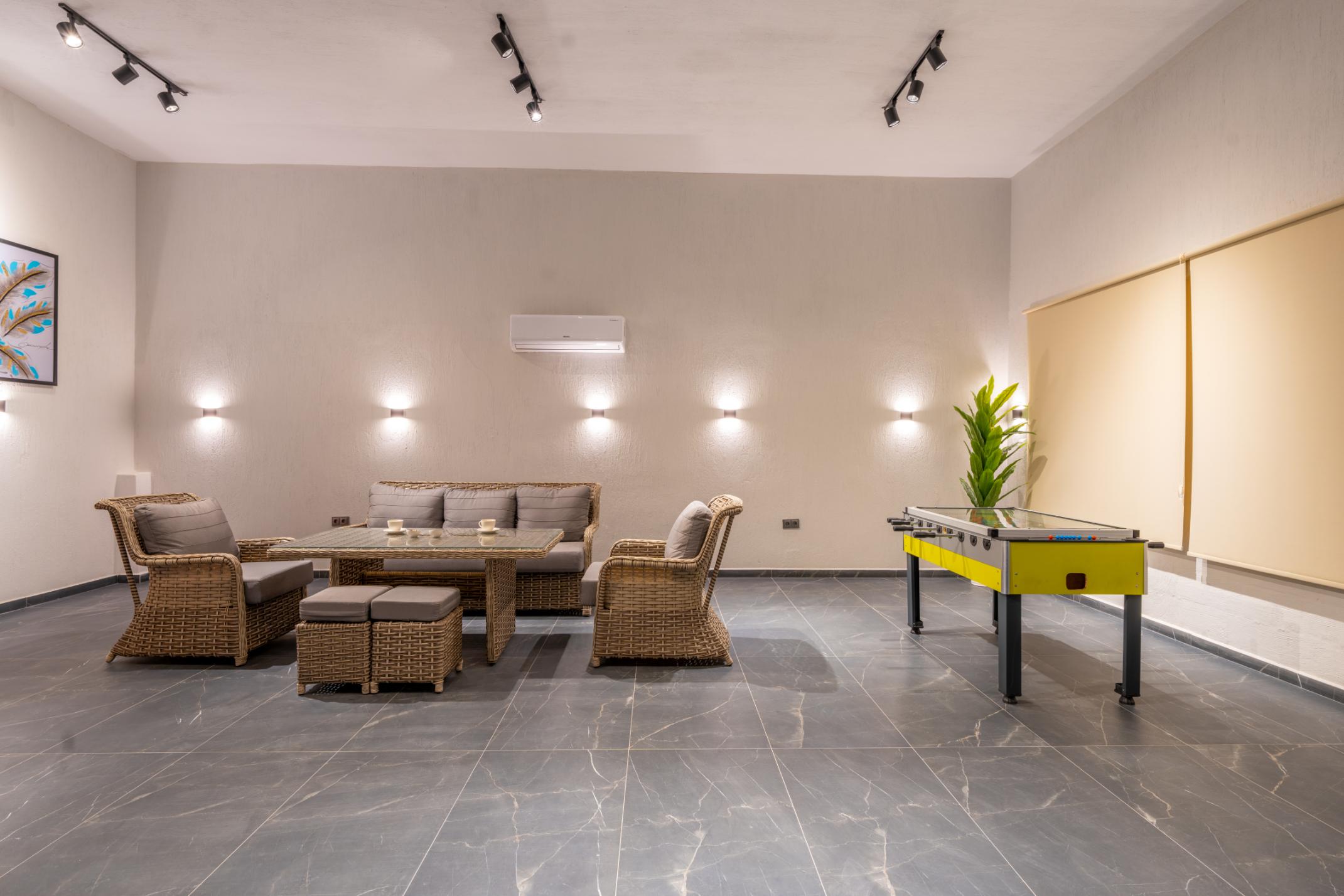 - Lower split level: large wicker sofa set, children’s slide and swing, and table football.