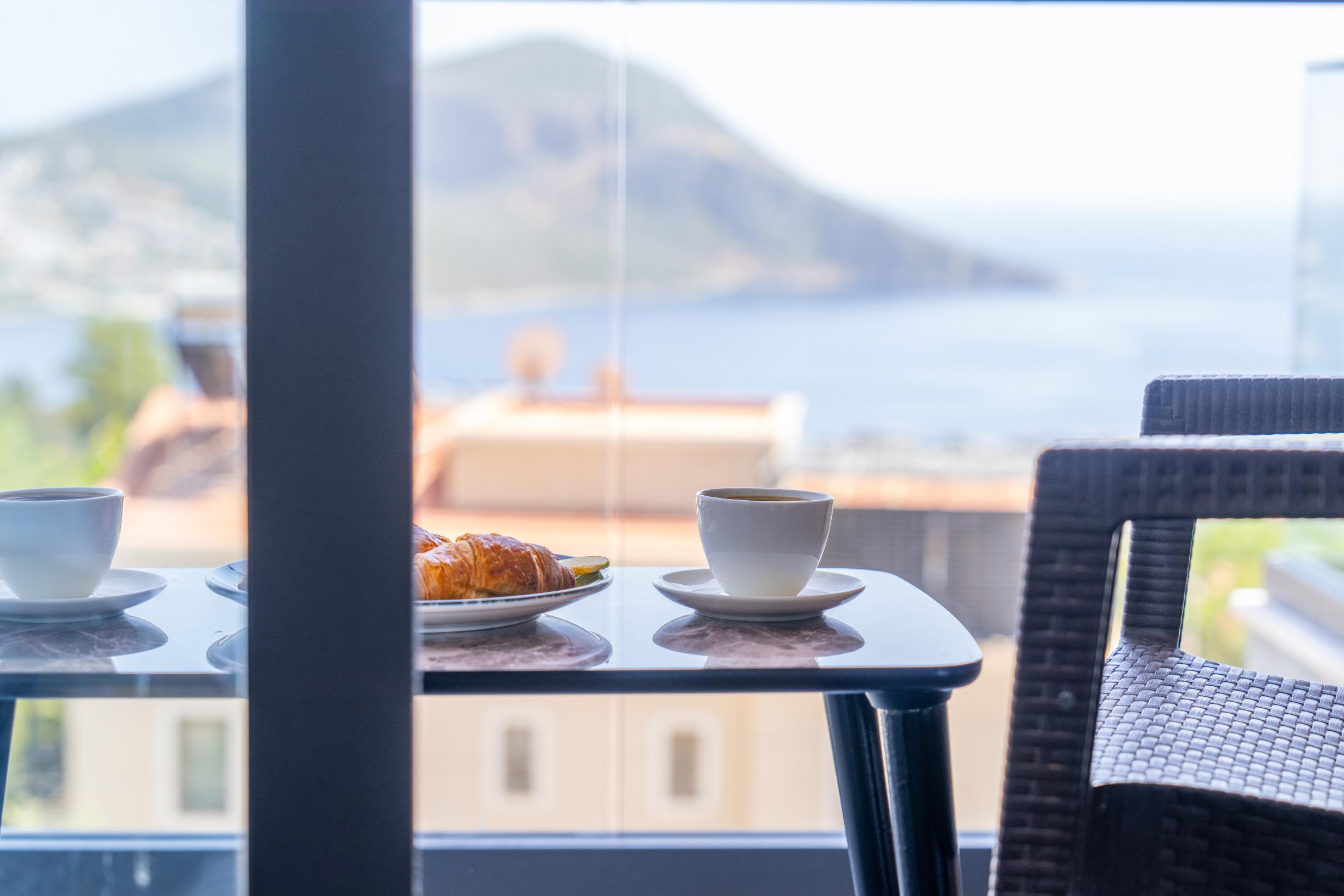 - Two double bedrooms. The left bedroom has an en‑suite shower and a private balcony with two chairs and sea views; it also has a wardrobe and dressing table with stool.