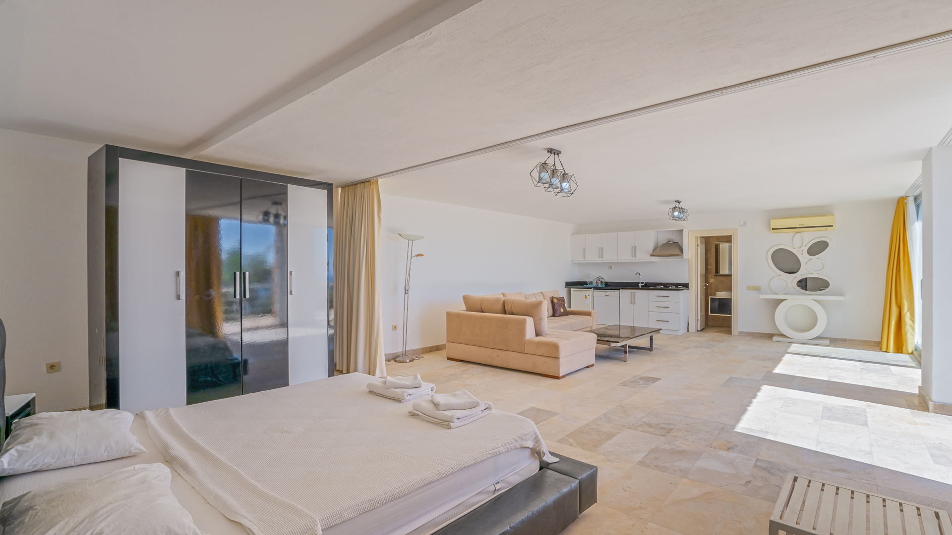 The open-plan living room is bright and welcoming, featuring two comfortable sofas, armchairs, a flat-screen TV, DVD player, and coffee table. A dining table seats ten, and floor-to-ceiling glass doors open directly onto the terrace, framing the panoramic sea view. There is also a guest WC and utility room with a washing machine, iron and ironing board. Complimentary Wi-Fi and air conditioning are provided throughout.