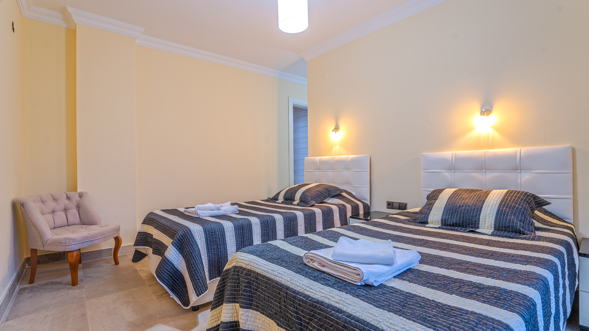 Bedroom 3 – First Floor: Twin beds, air conditioning, wardrobe, vanity table, en-suite bathroom and WC.