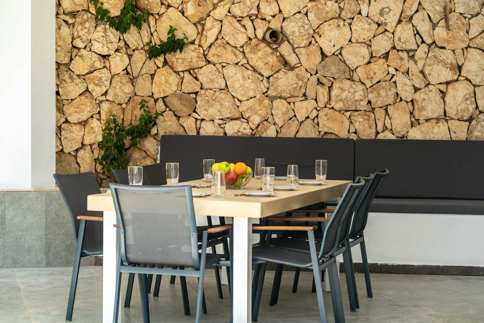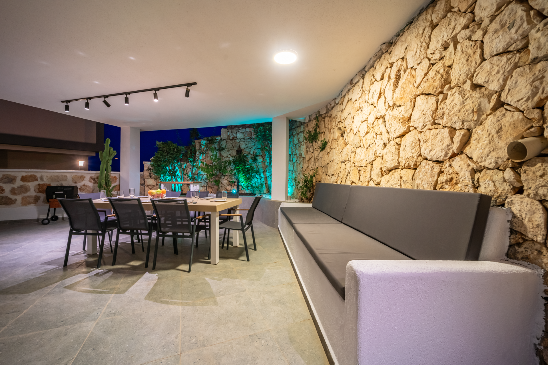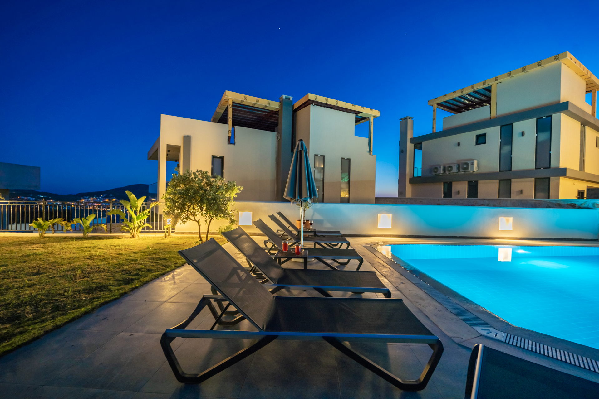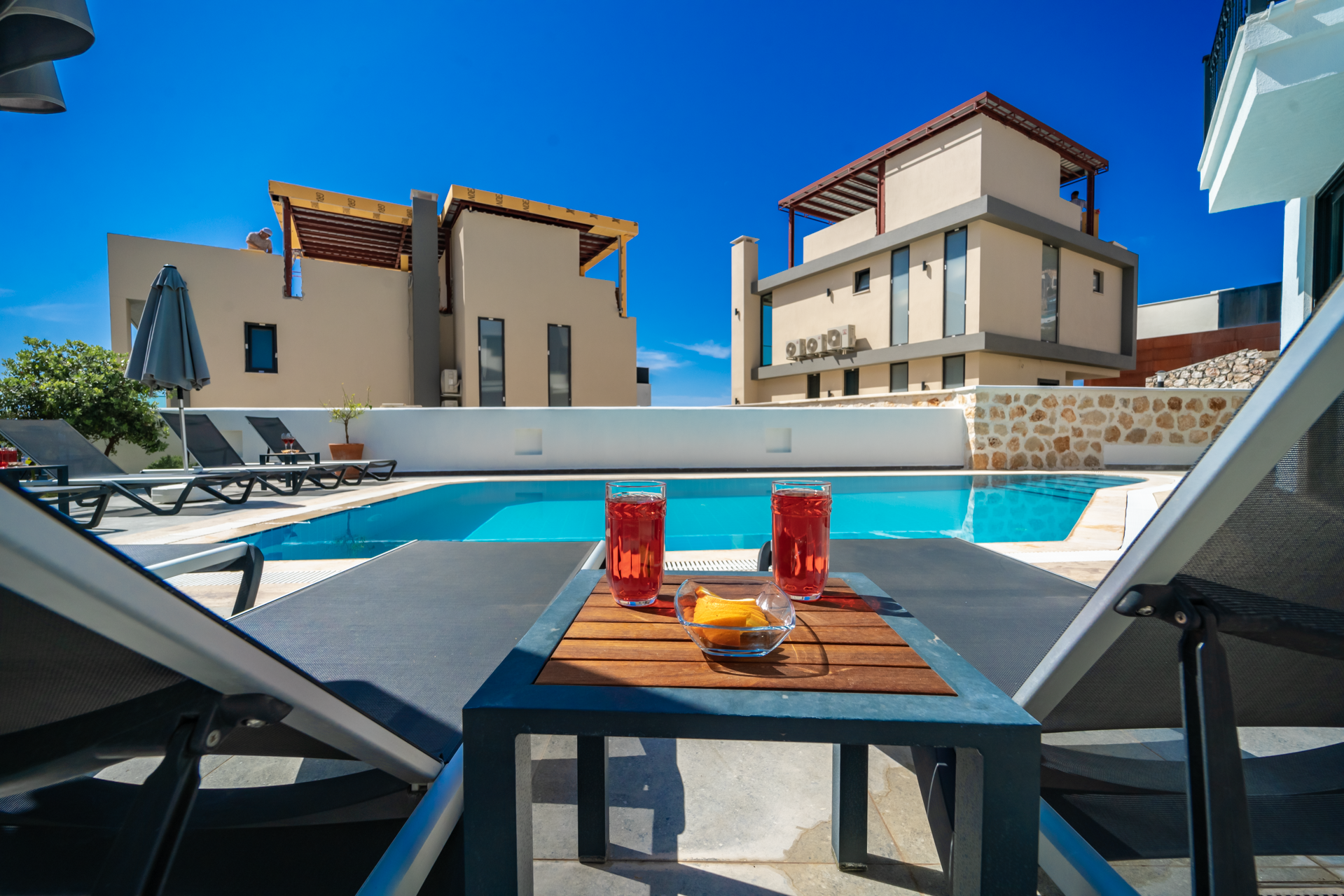 The villa has been furnished in a modern style and offers plenty of space for your party within the villa and outside and even has an elevated seating area with sea views.