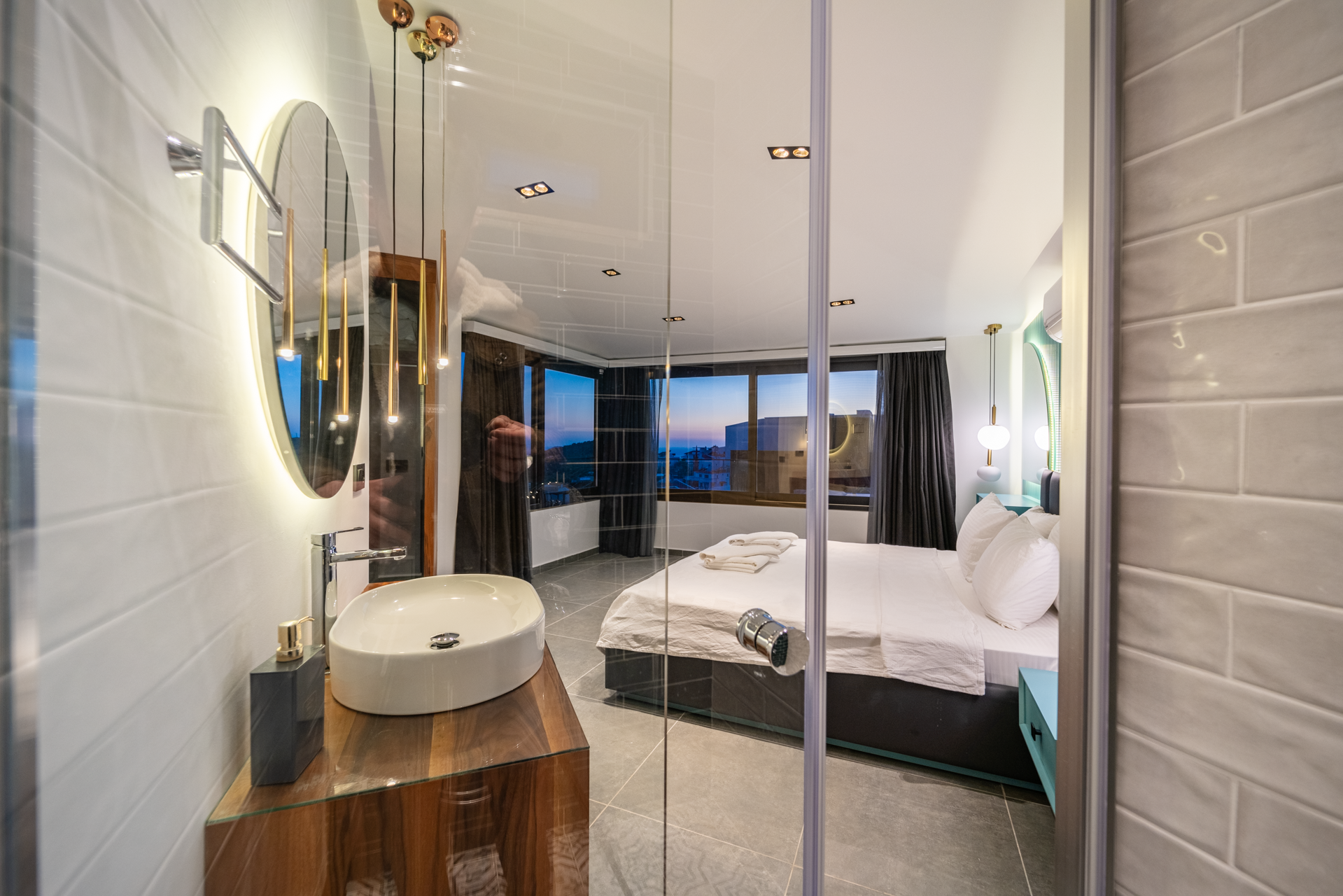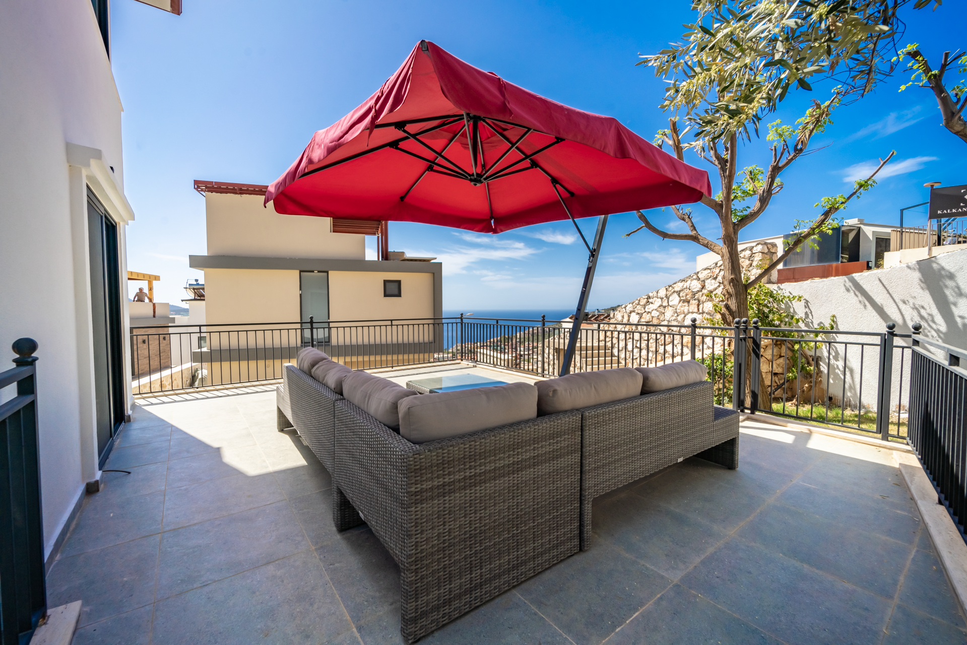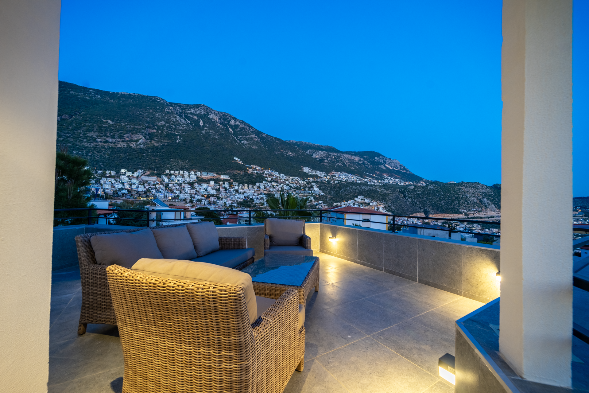 At the top of the stairs is a glass door that leads to out to the roof terrace which is furnished with a comfy sofa set and has views across the town towards Kalkan Bay.