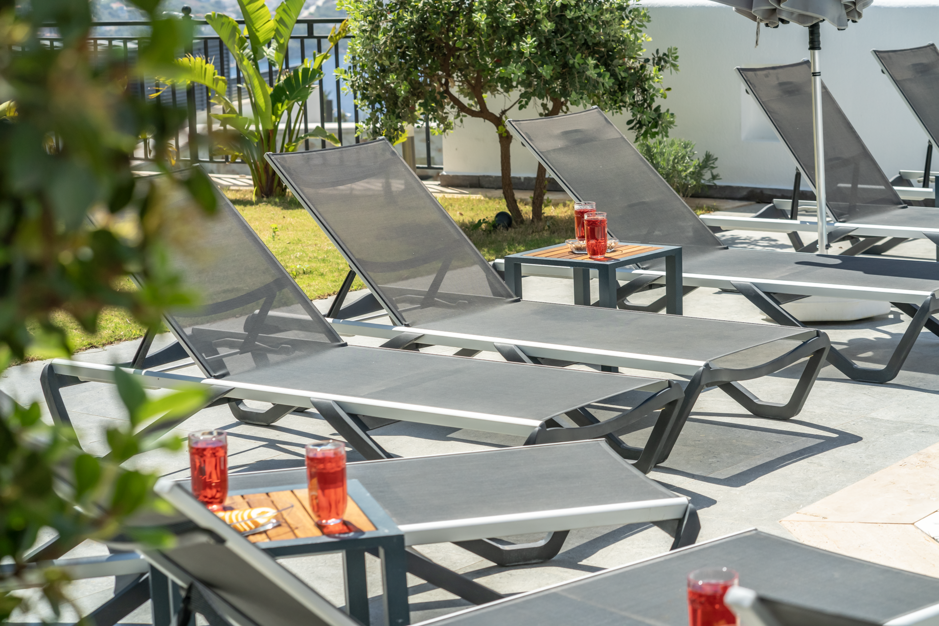Separate steps lead up to the elevated seating area offering sea views, which is furnished with an L-shaped sofa set around a coffee. A cantilevered parasol provides shade if needed.