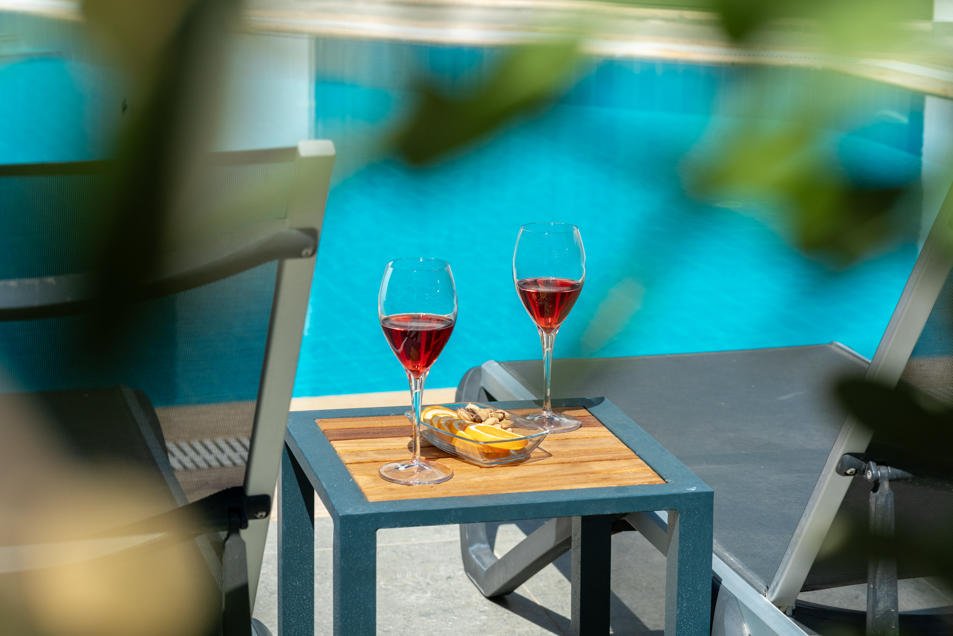 The pool is square in shape and has steps leading into the water. There are 10 mesh sun loungers spaced around the pool and grassed area with side tables and two parasols.
