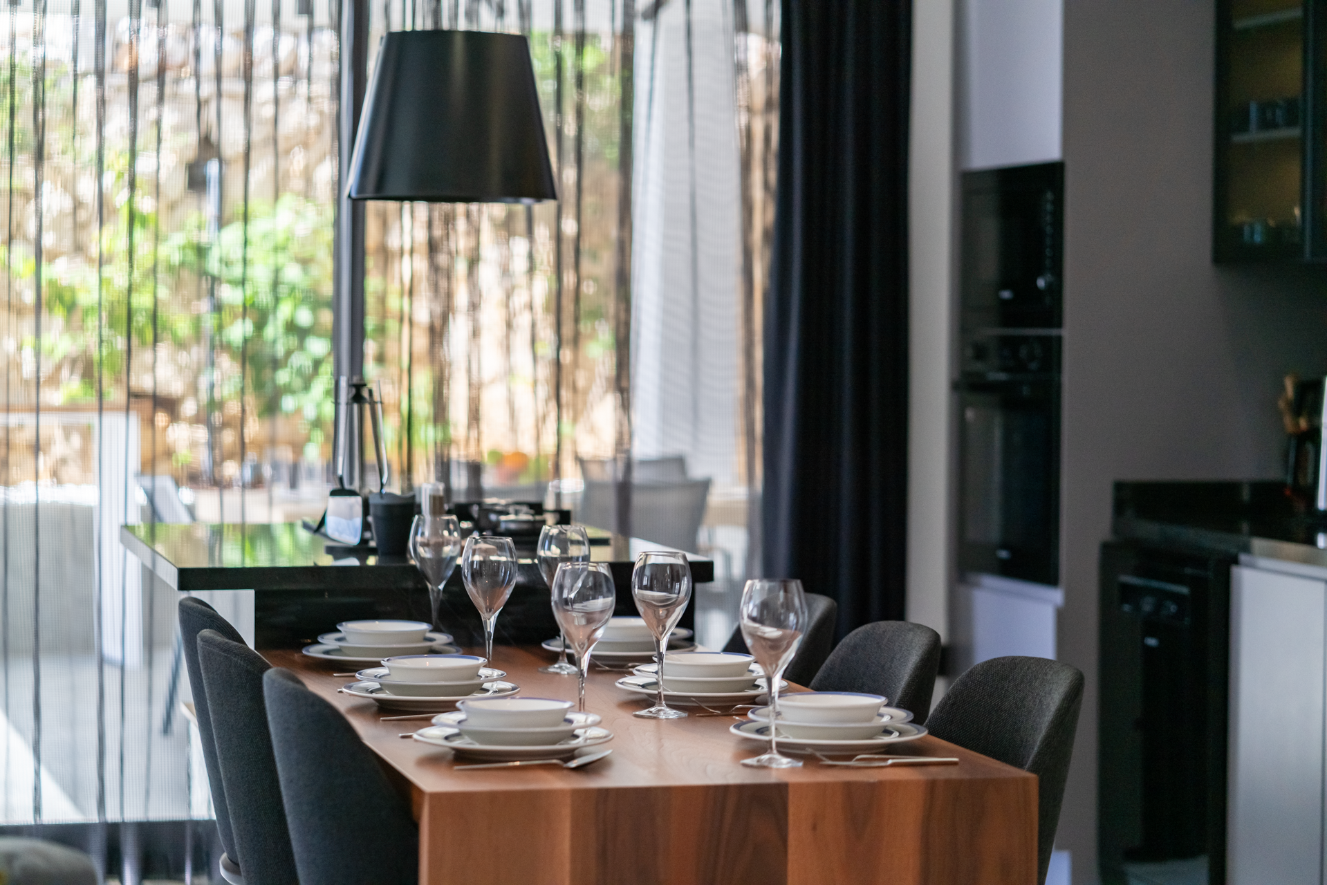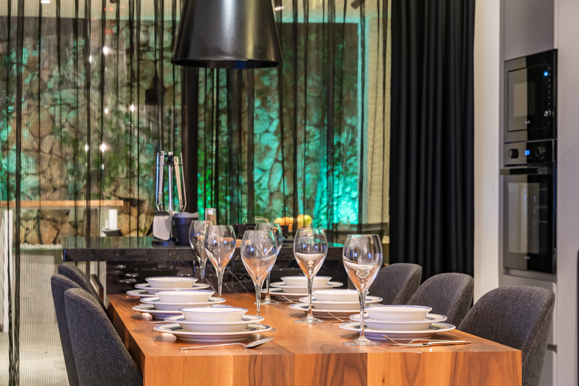 Access to the pool terrace can be gained through sliding doors from the living room and from the kitchen that leads to the outside dining table under the elevated platform.