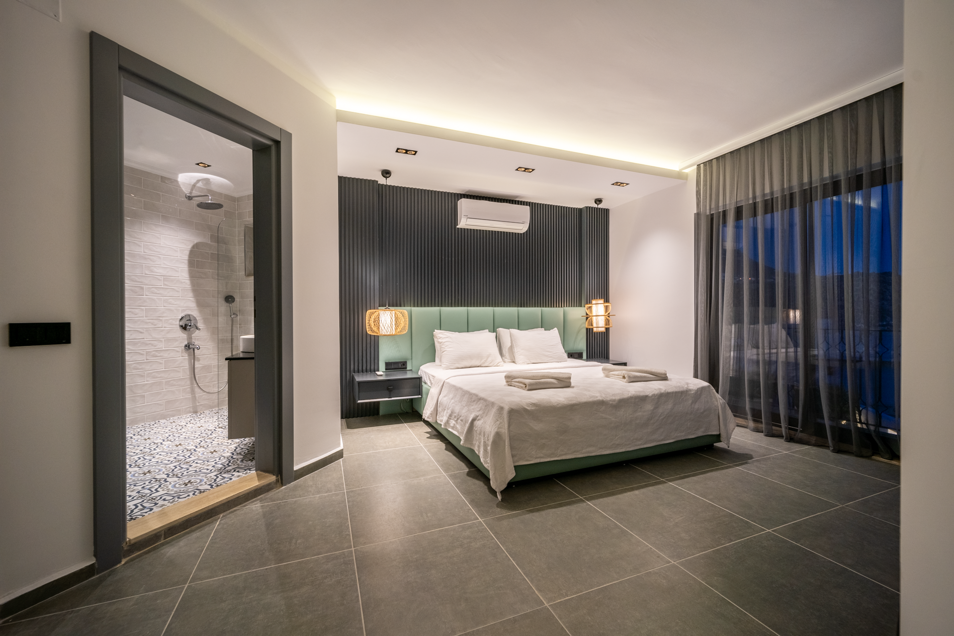 The first double bedroom with adjacent shower room is located on this level. The bedroom has direct access out onto the pool terrace via sliding doors. Within the room is a built-in wardrobe and dressing table with stool.