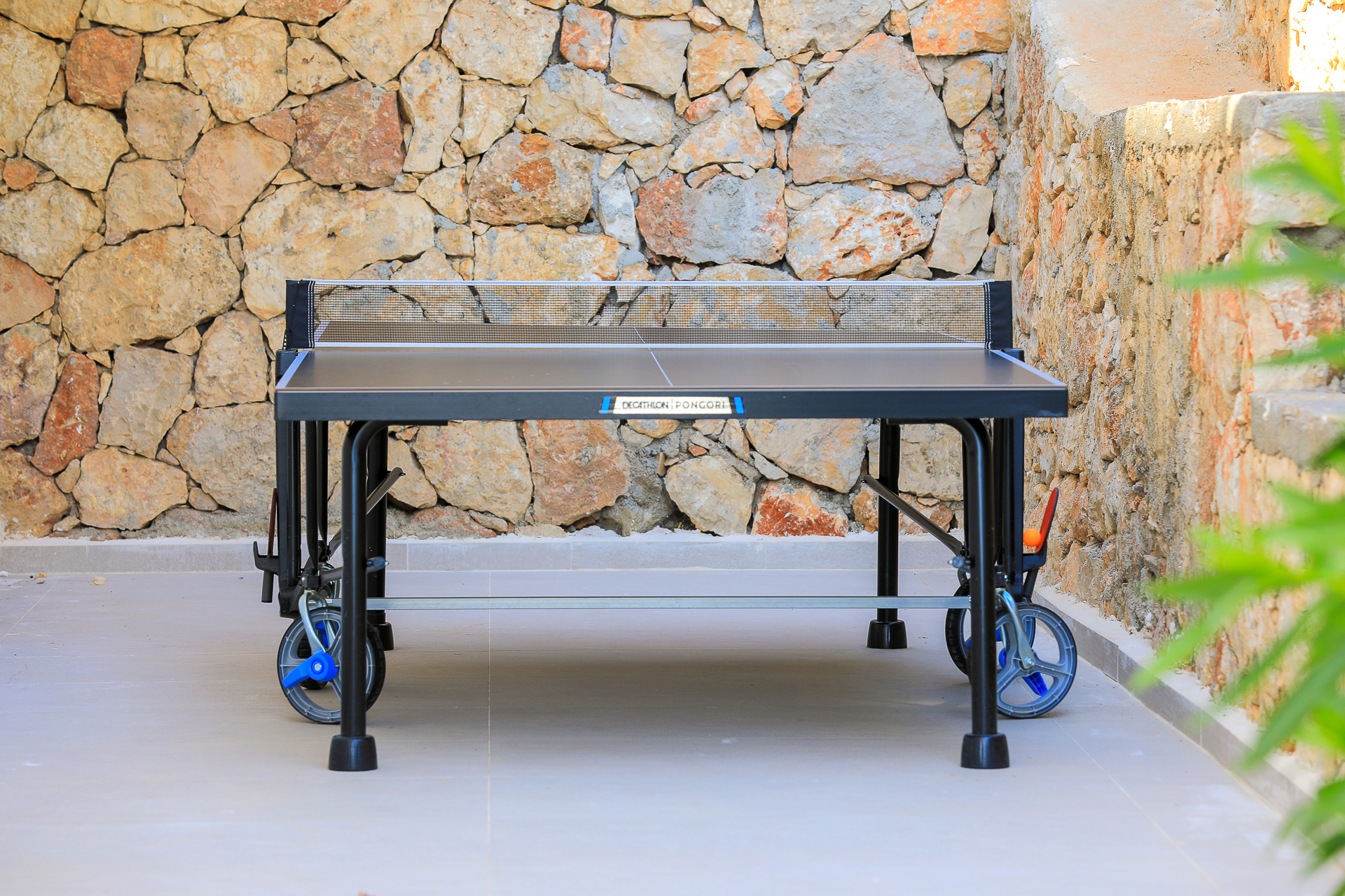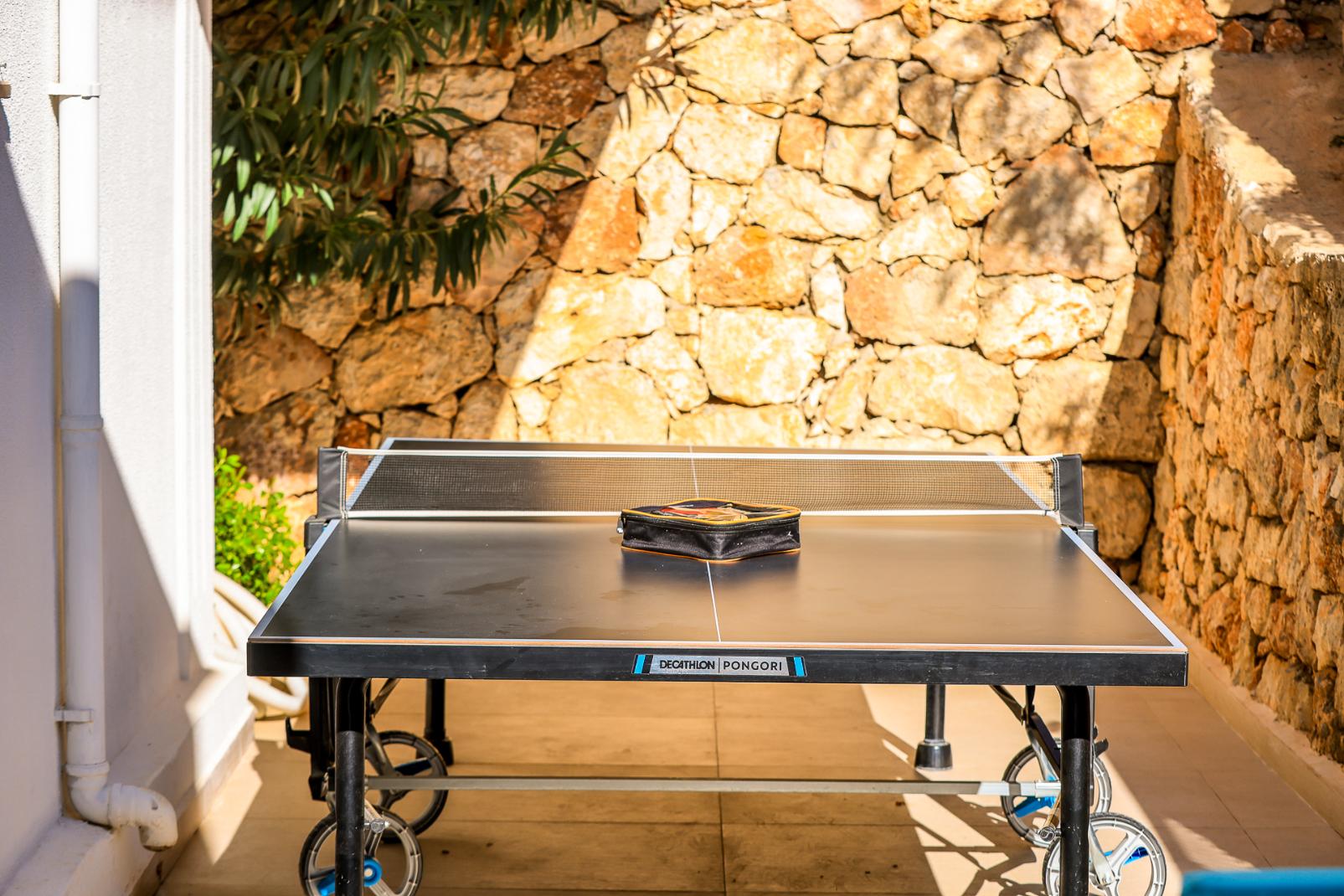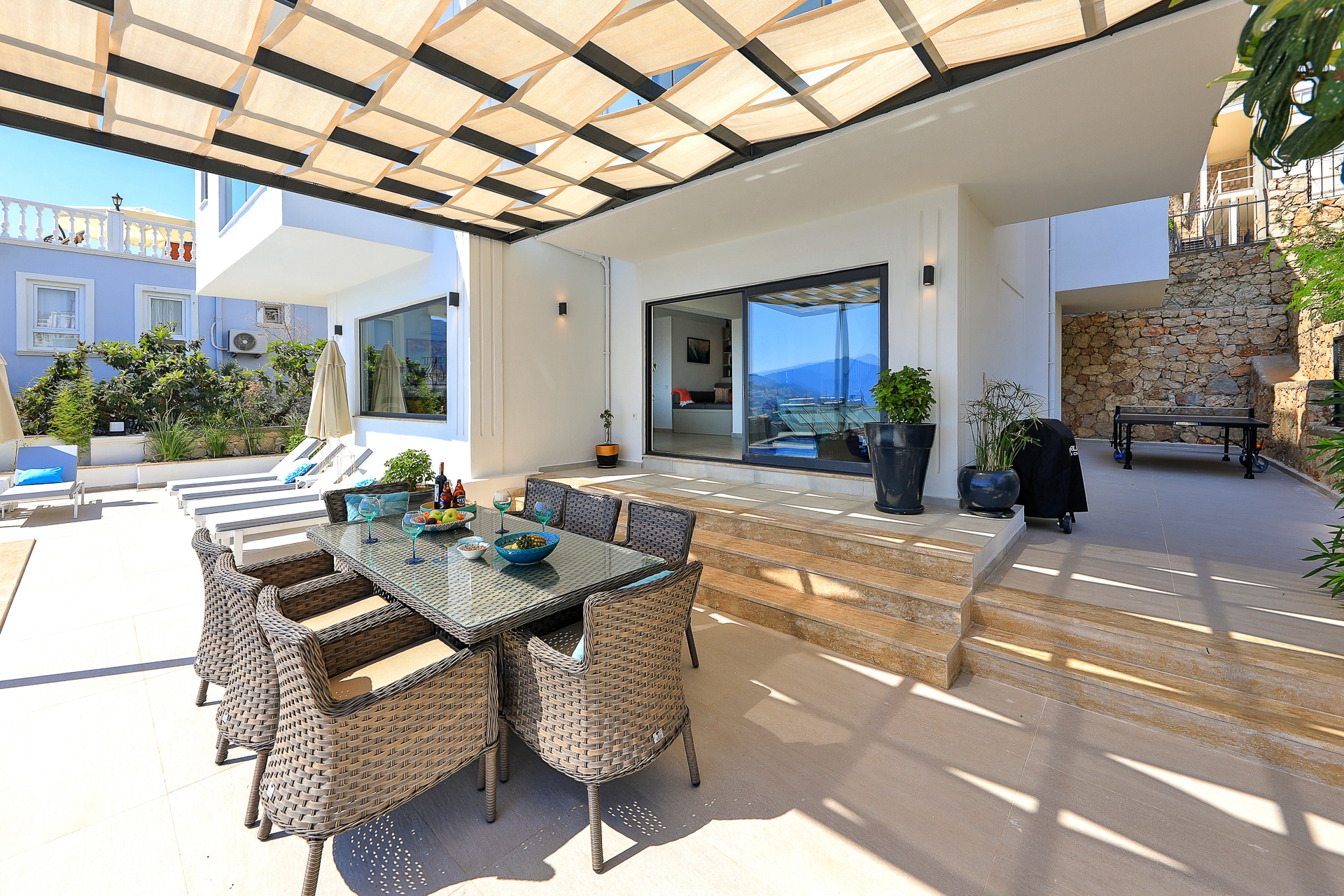 Ground floor: spacious terrace area and large swimming pool (there is easy access to the latter via roman steps) A large al-fresco dining area is covered with a shady pergola, cushioned sun loungers and parasols are provided for relaxing, and another comfortable seating group is located at the edge of the pool terrace. There is a BBQ and a table tennis table located to the side of the terrace.