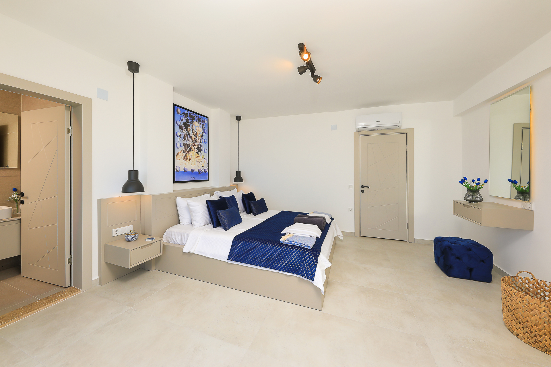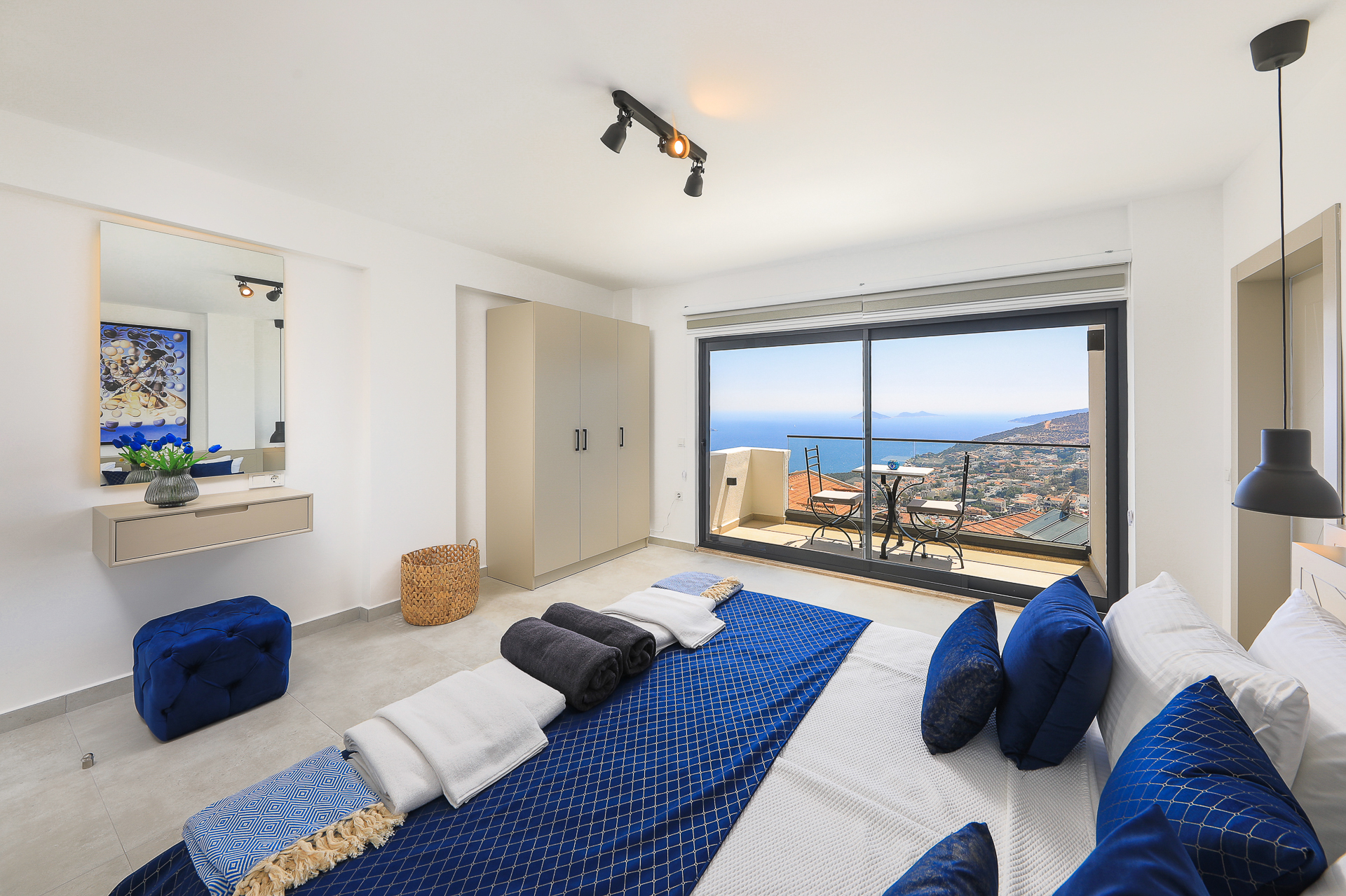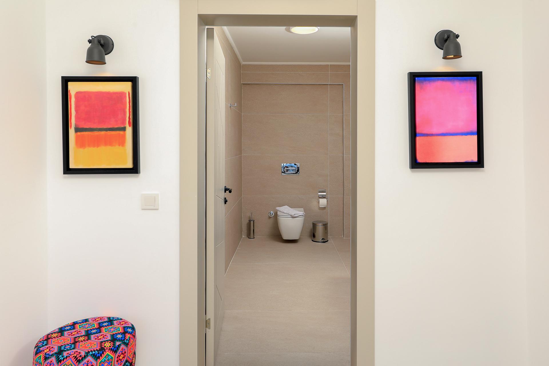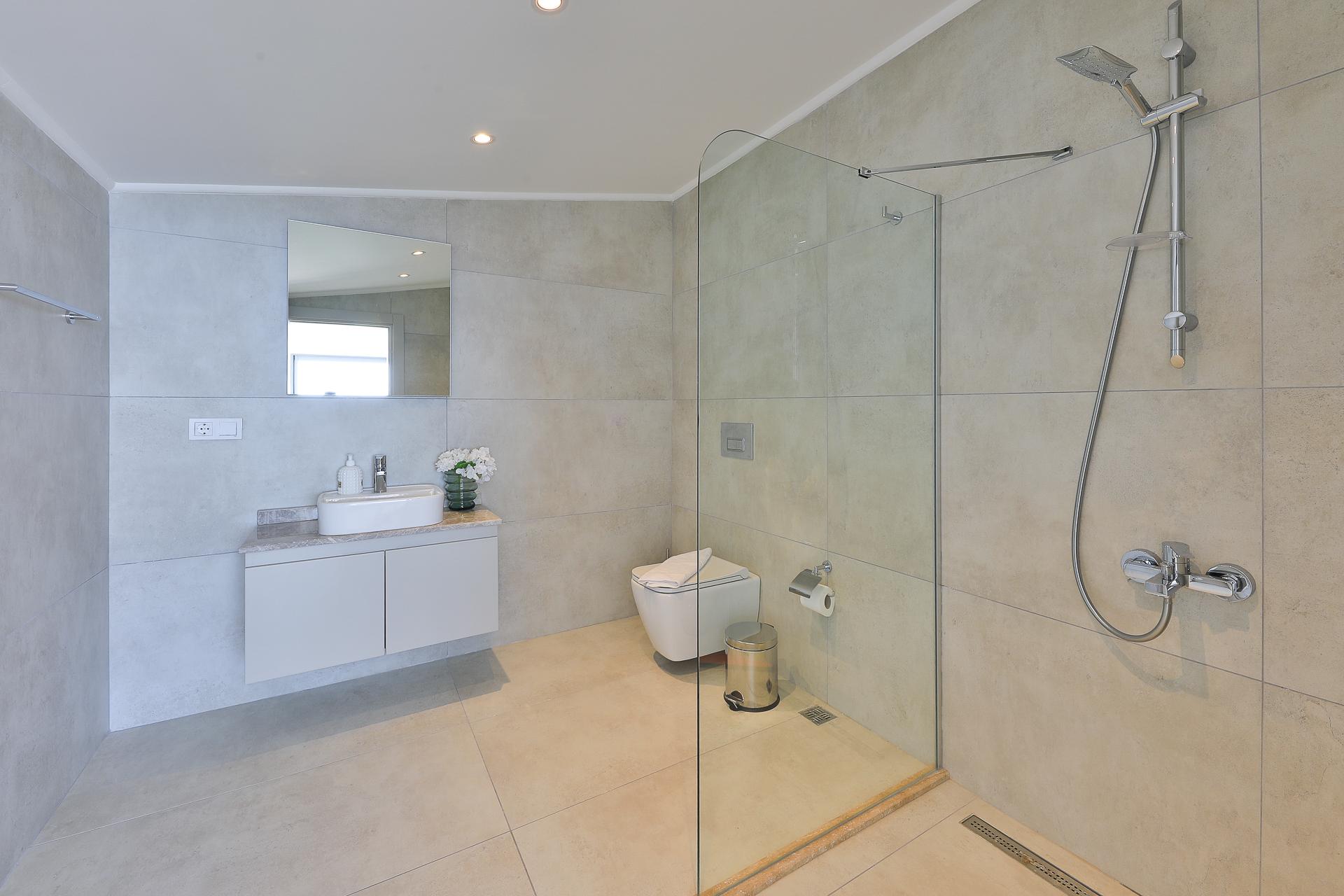 On this level there are three bedrooms – two spacious doubles and a twin bedroom, all of which have their own ensuite shower rooms. Both double bedrooms have sea view private balconies, furnished with a table and chairs (bedroom 1 also has an egg chair on the balcony). The twin bedroom has an ensuite shower room with W/C.