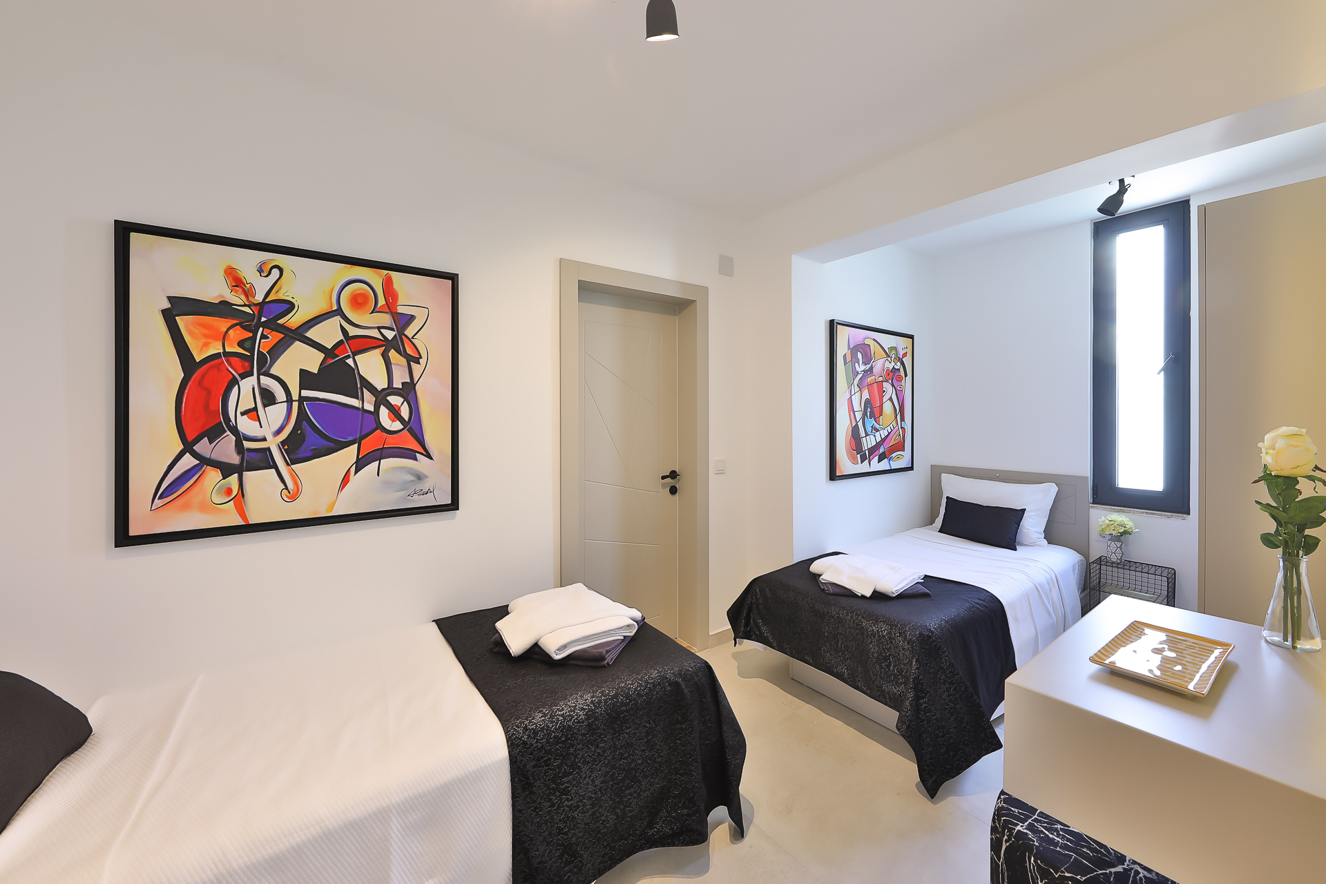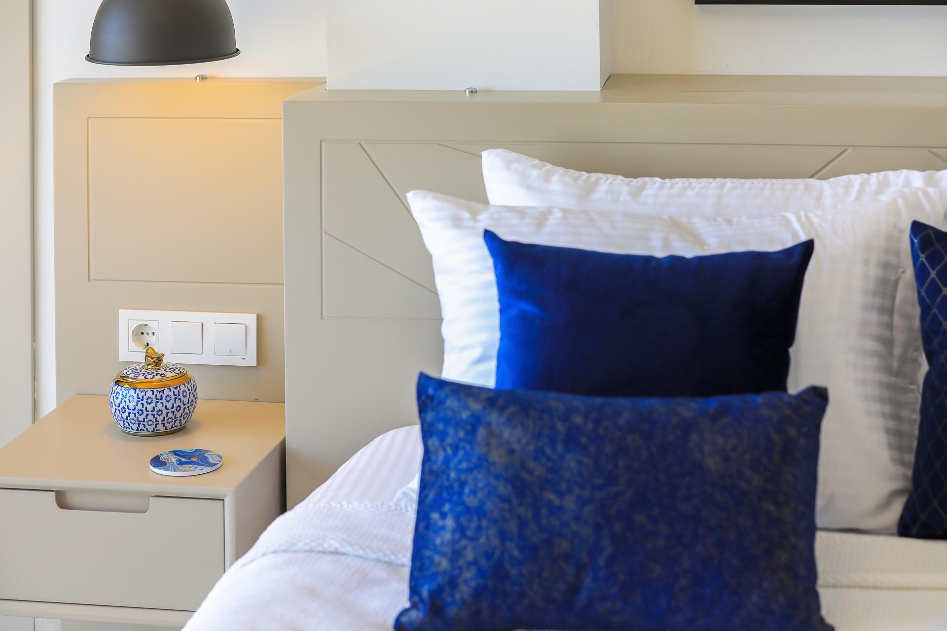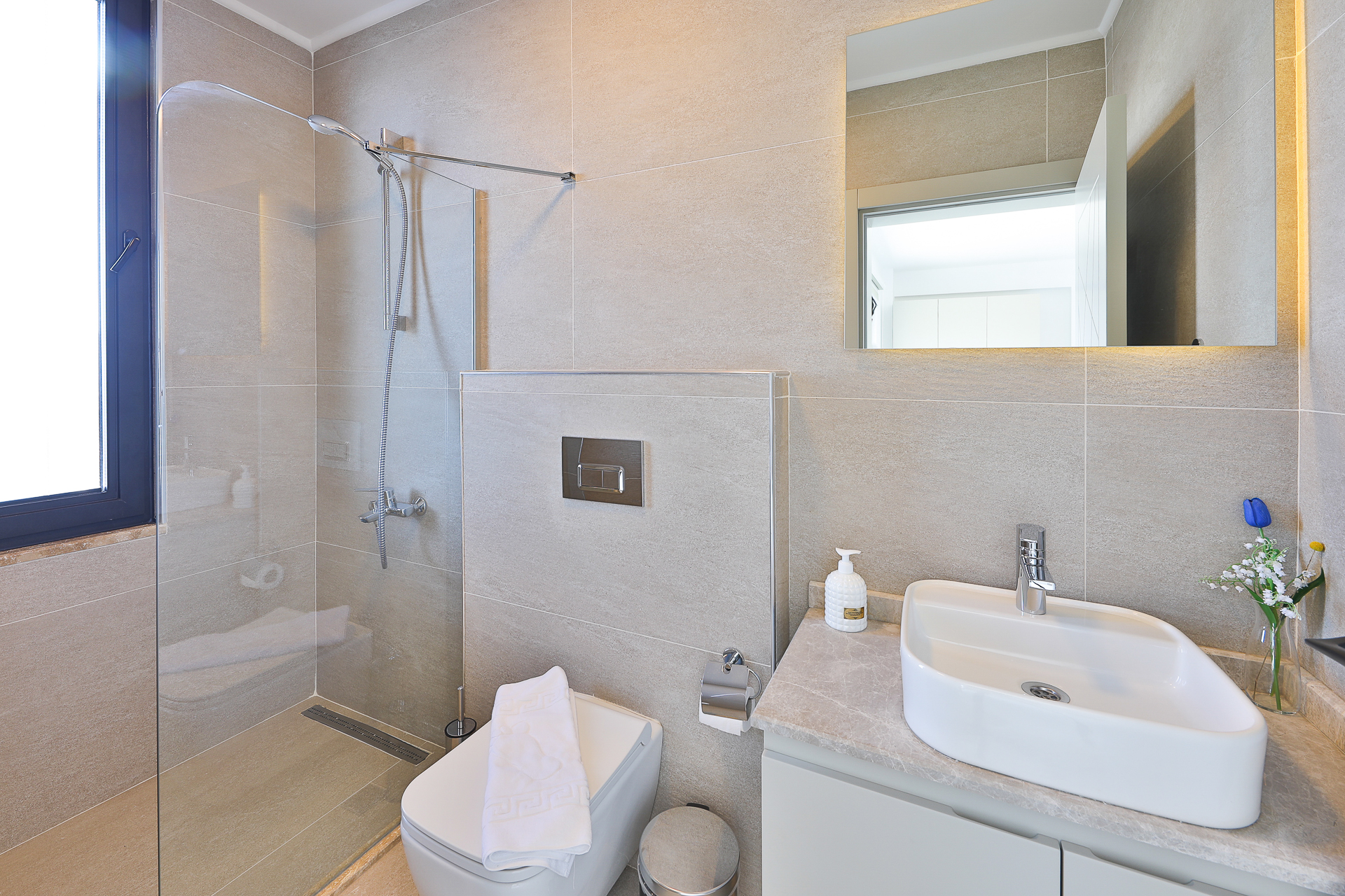 On this level there are three bedrooms – two spacious doubles and a twin bedroom, all of which have their own ensuite shower rooms. Both double bedrooms have sea view private balconies, furnished with a table and chairs (bedroom 1 also has an egg chair on the balcony). The twin bedroom has an ensuite shower room with W/C.