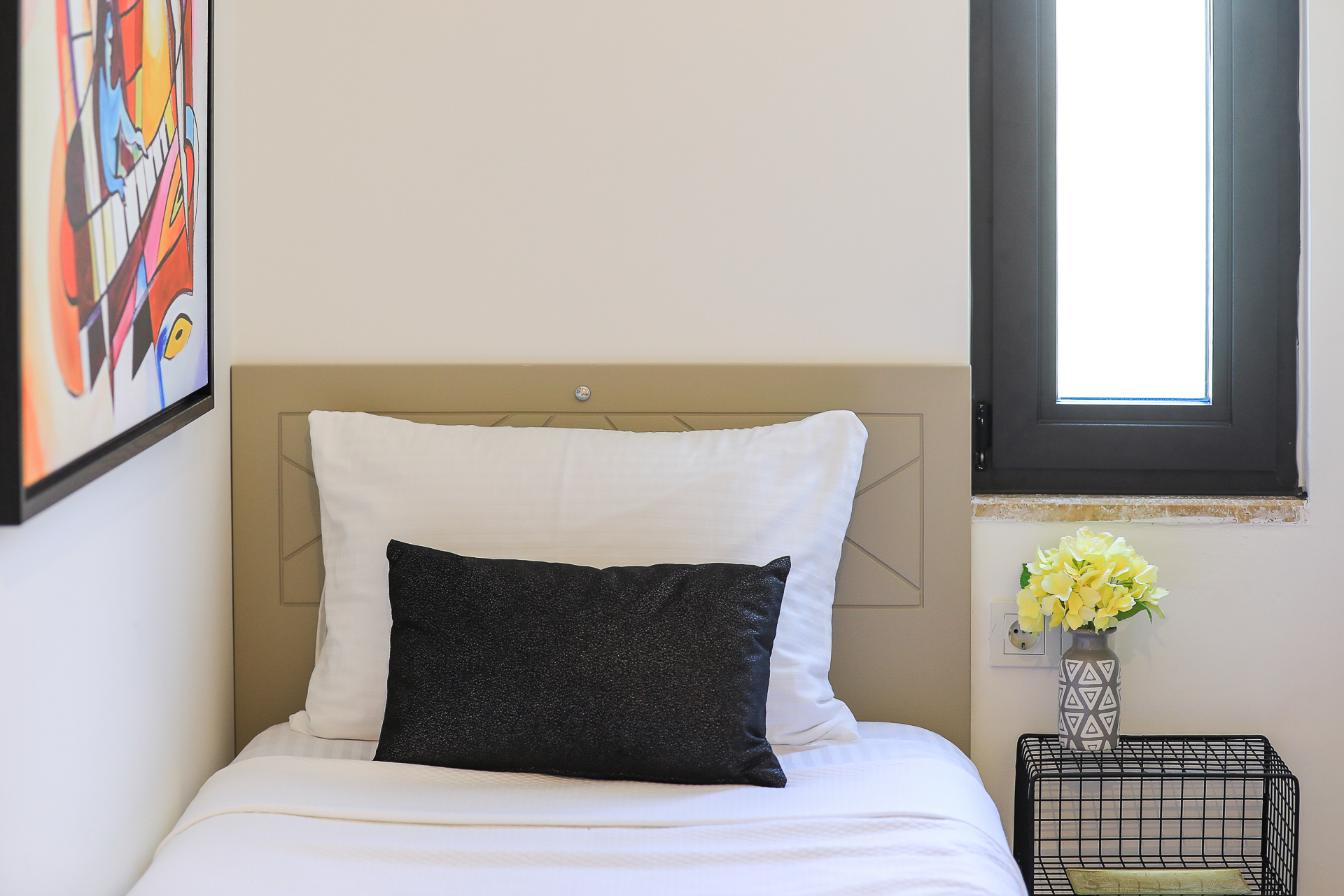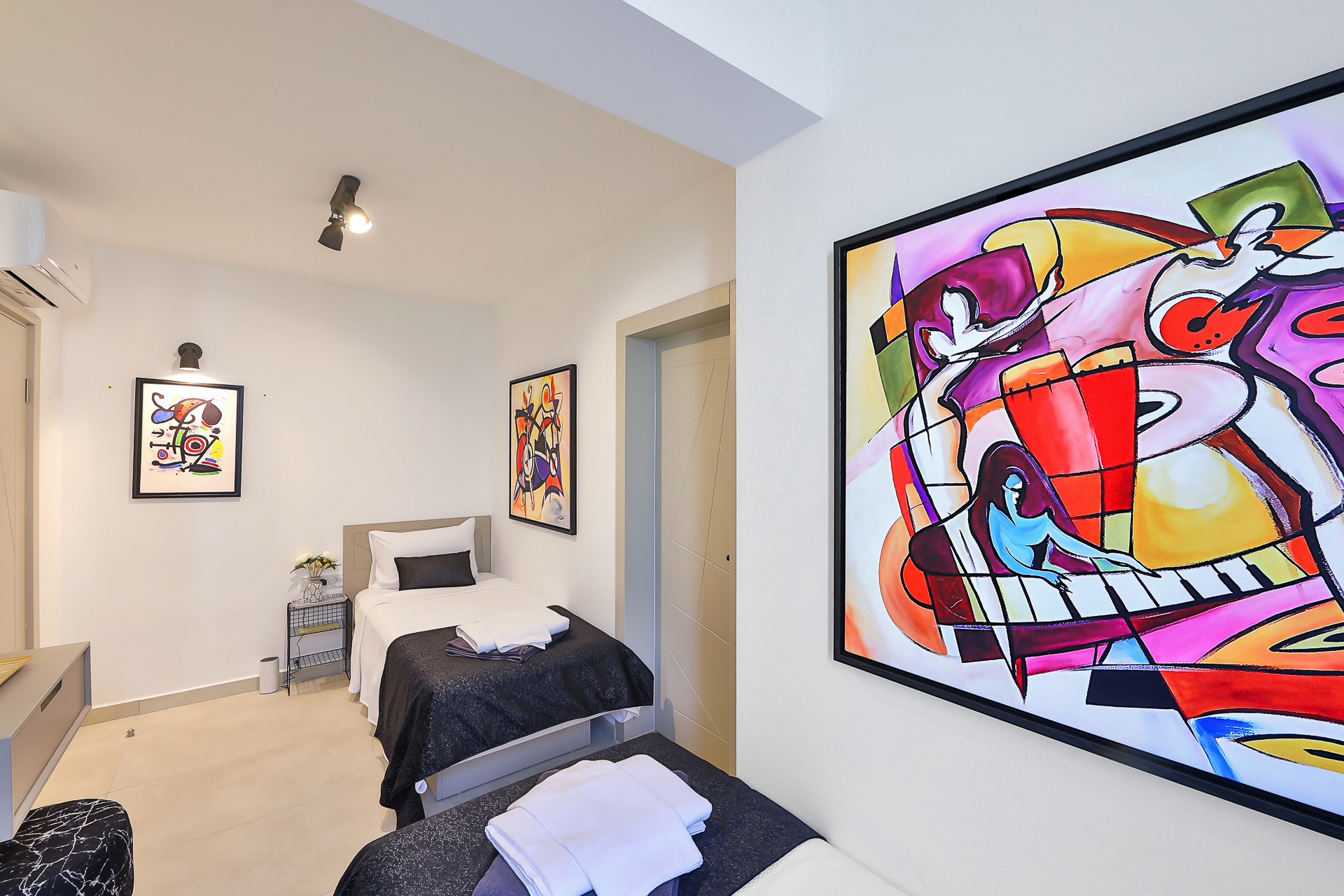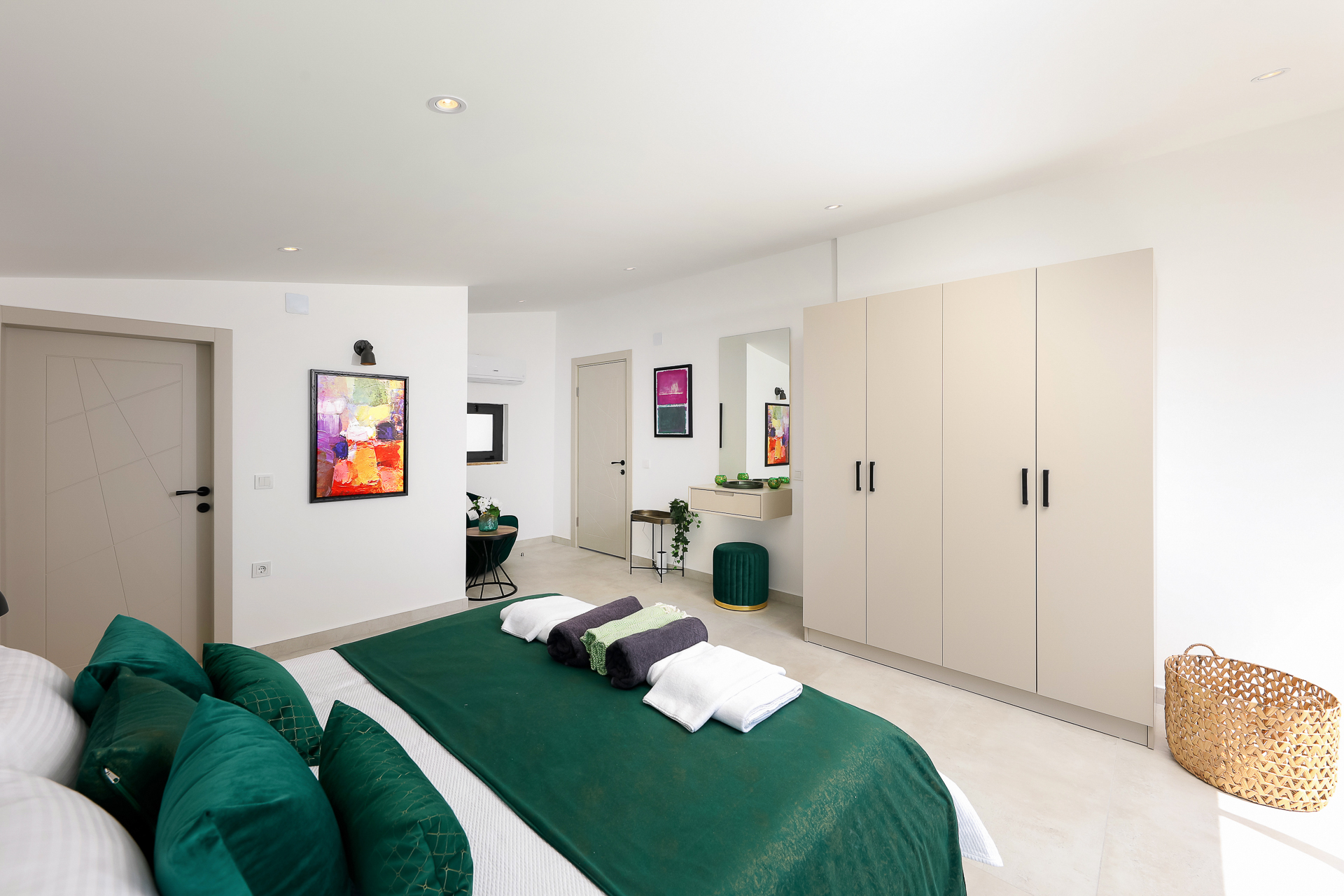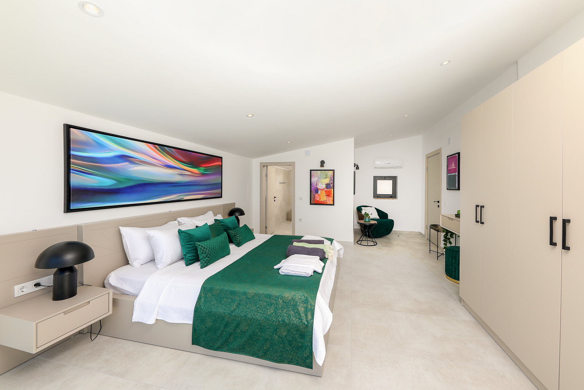 On this level there are three bedrooms – two spacious doubles and a twin bedroom, all of which have their own ensuite shower rooms. Both double bedrooms have sea view private balconies, furnished with a table and chairs (bedroom 1 also has an egg chair on the balcony). The twin bedroom has an ensuite shower room with W/C.