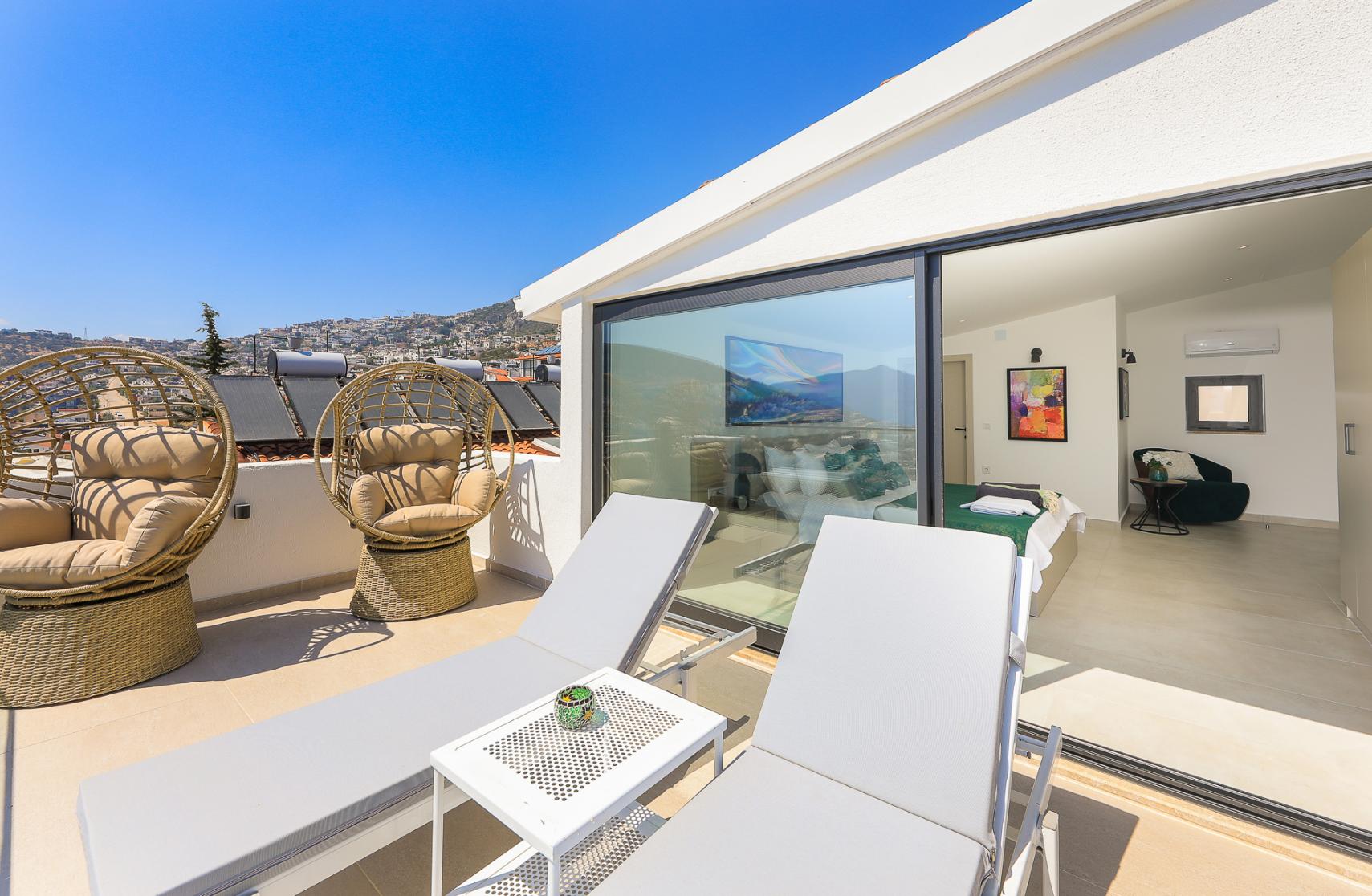 Bedroom 4 - The master bedroom suite occupies the whole of the top floor, with a double bed and en-suite shower room. The room has direct access to unforgettable sea views from the private furnished roof terrace, with its own sun loungers, and two comfortable rattan ‘egg’ chairs.
