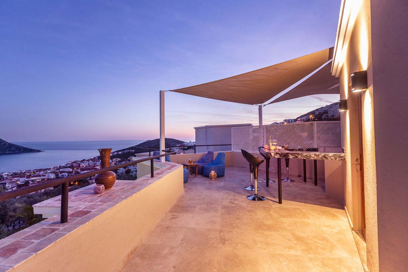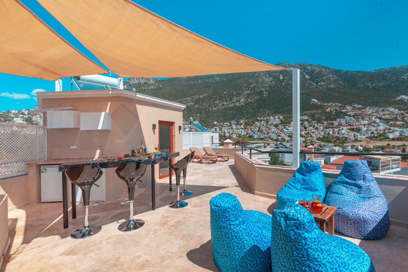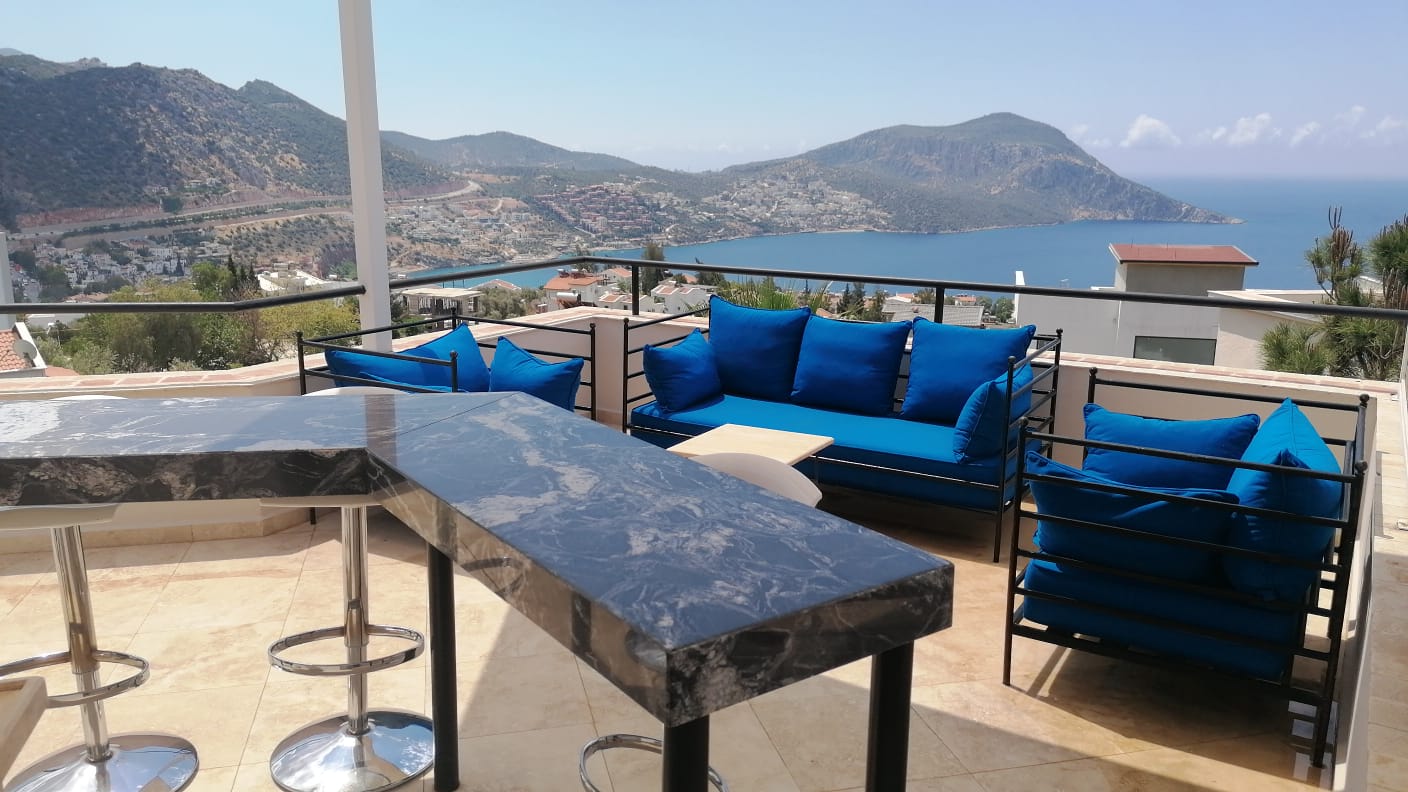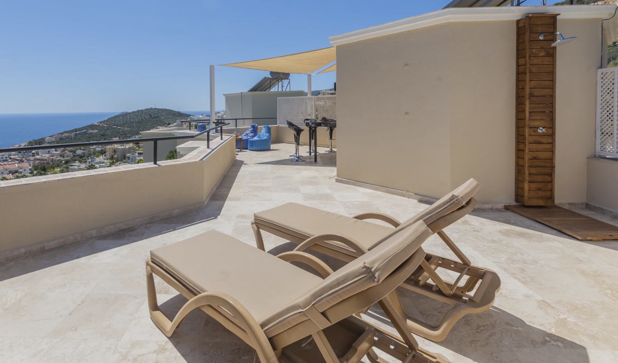 The villa offers a large pool, mature grounds, al fresco dining area and 3 double bedrooms. The star attraction of the villa is the roof terrace, complete with a rooftop bar and offering beautiful sea views. The villa is an easy 10-15 minute walk to the centre of Kalkan.