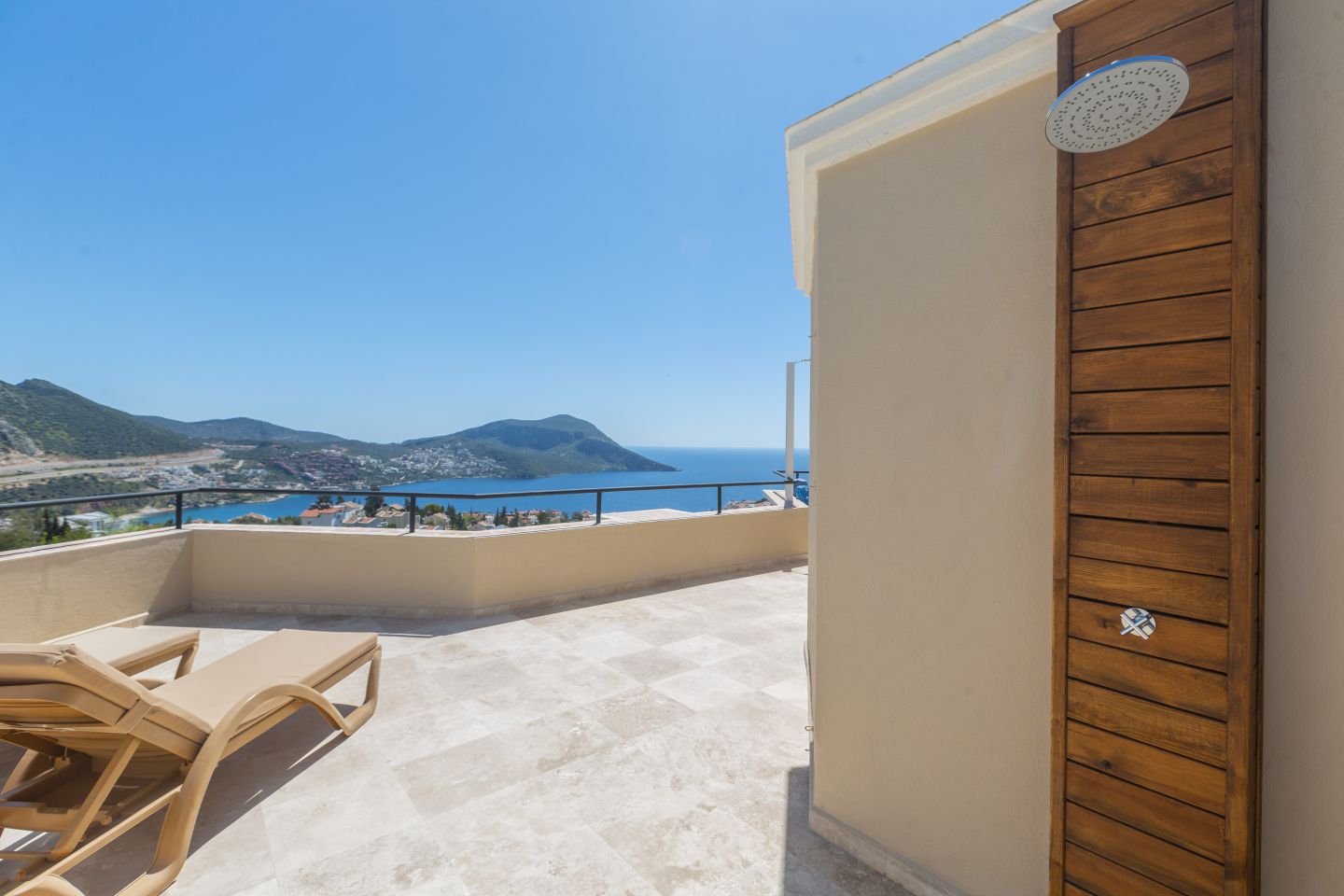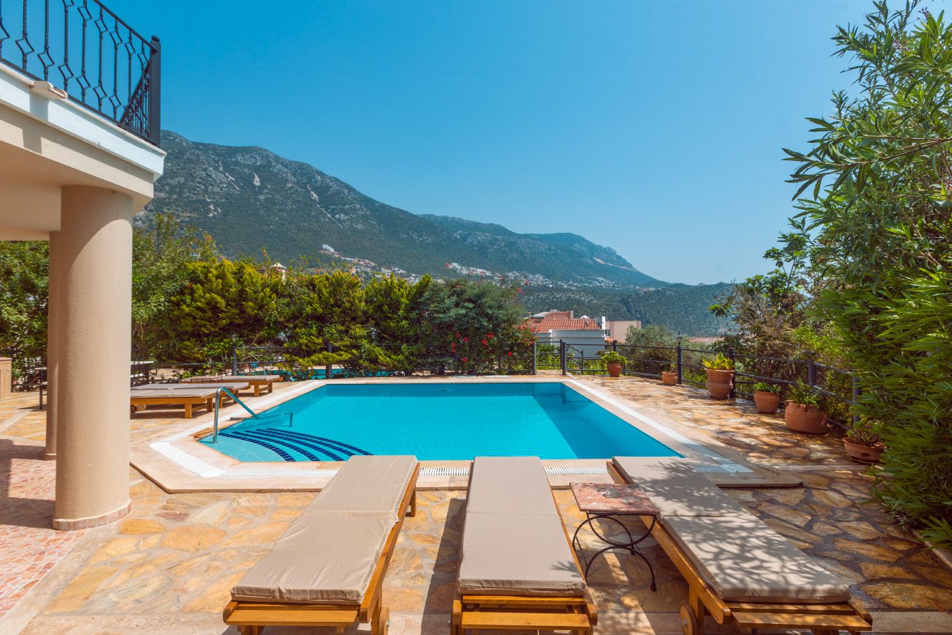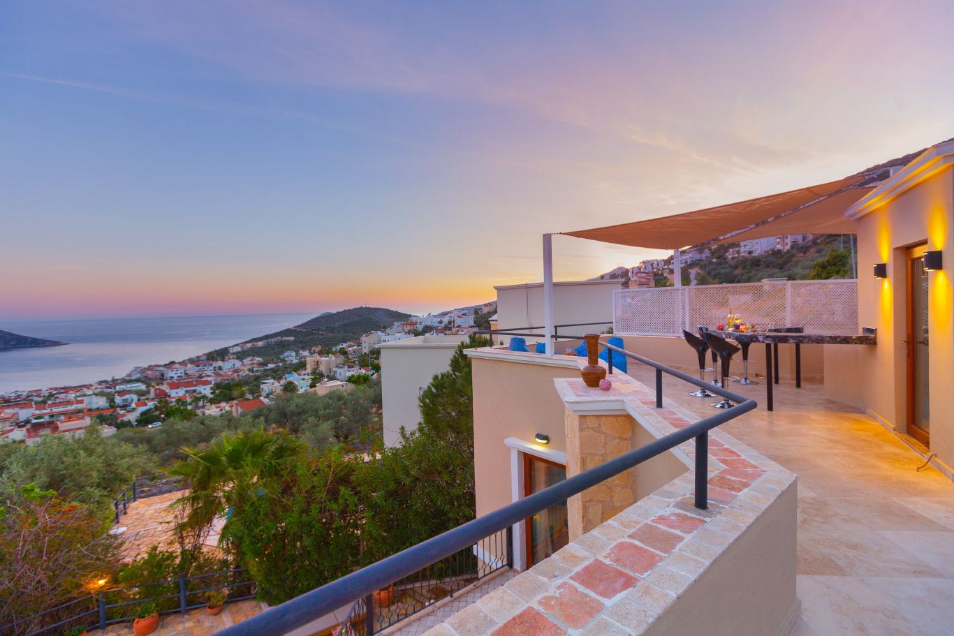 The villa offers a large pool, mature grounds, al fresco dining area and 3 double bedrooms. The star attraction of the villa is the roof terrace, complete with a rooftop bar and offering beautiful sea views. The villa is an easy 10-15 minute walk to the centre of Kalkan.