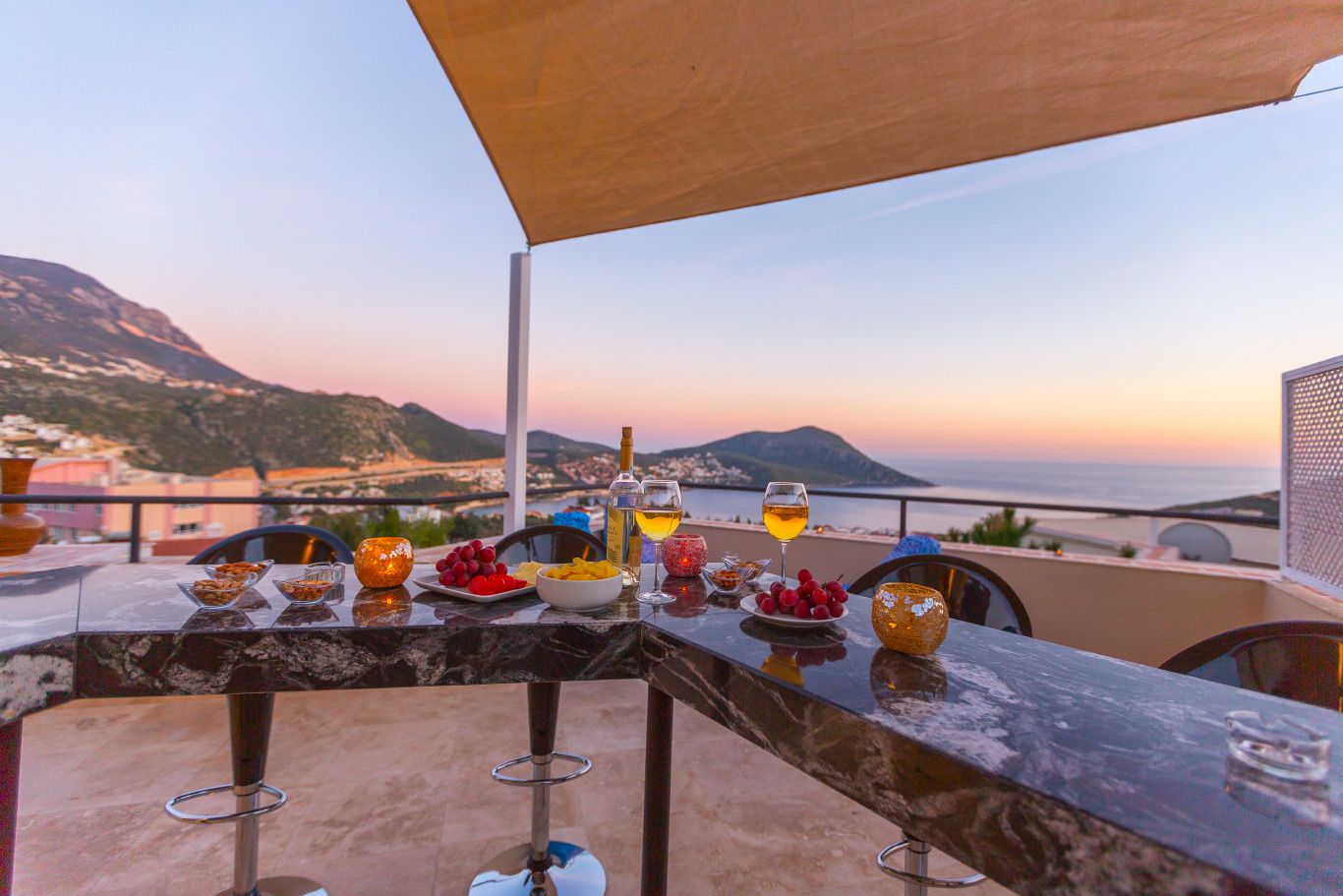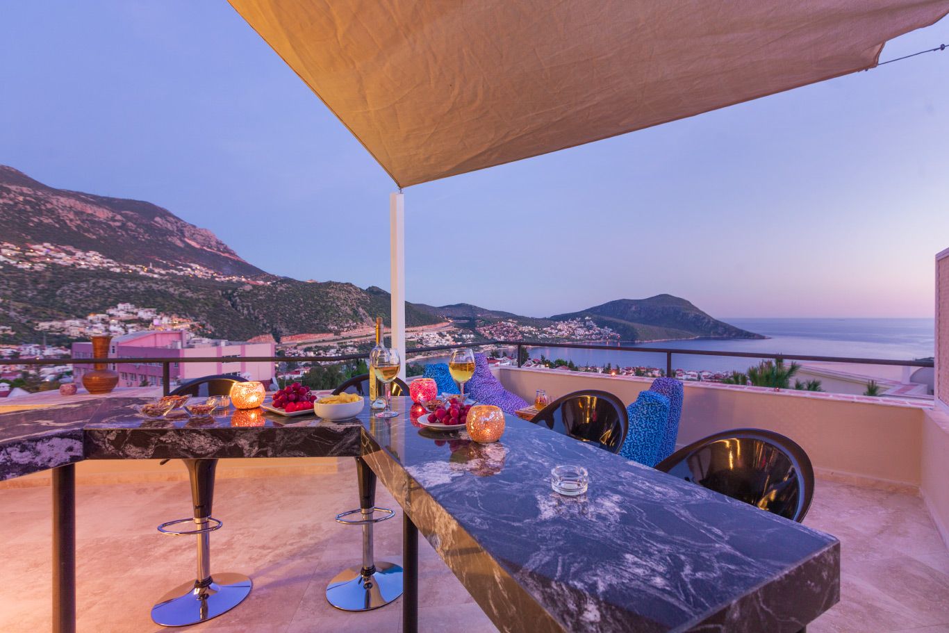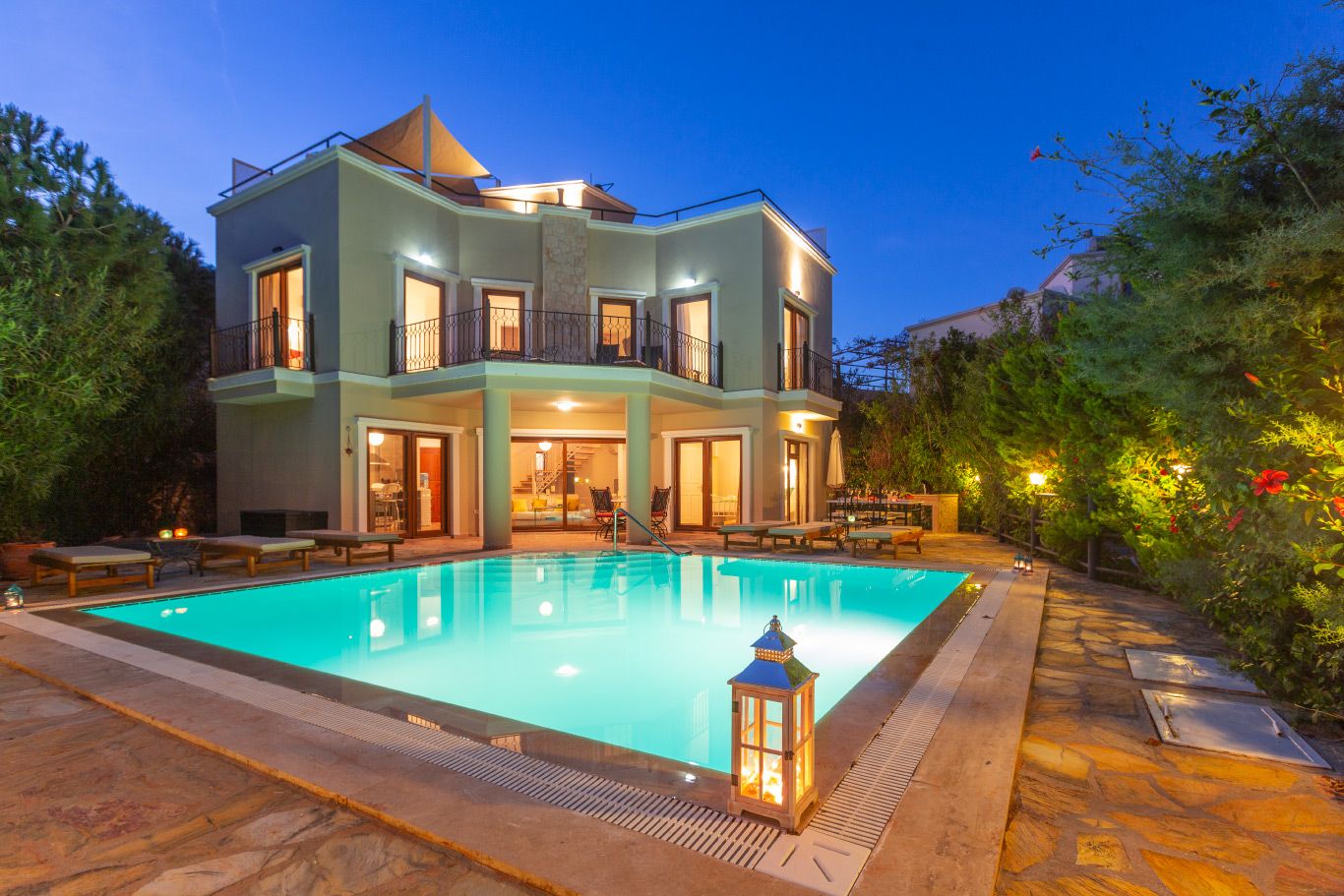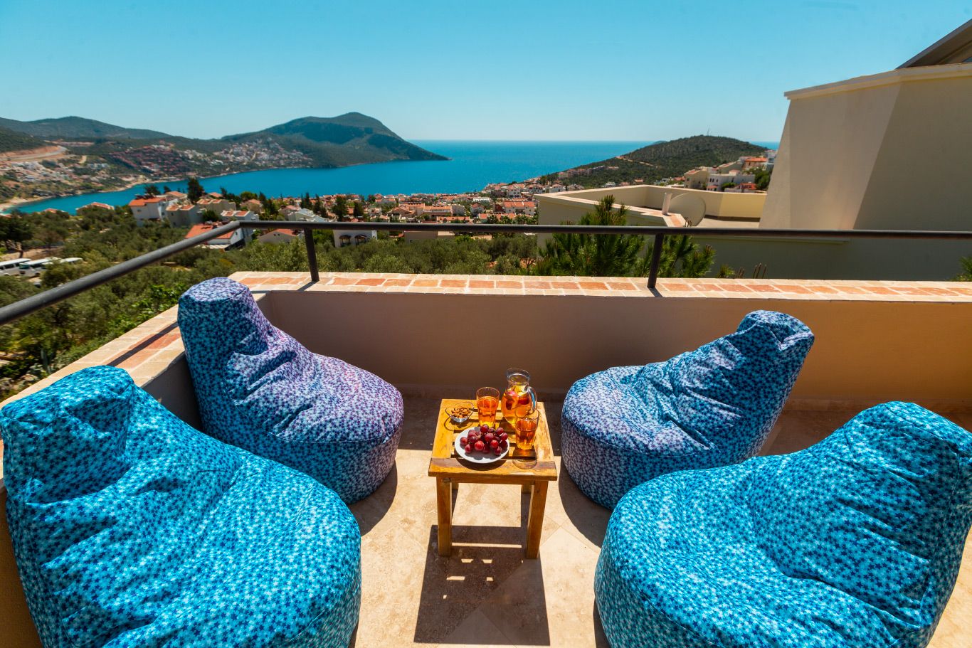 The villa offers a large pool, mature grounds, al fresco dining area and 3 double bedrooms. The star attraction of the villa is the roof terrace, complete with a rooftop bar and offering beautiful sea views. The villa is an easy 10-15 minute walk to the centre of Kalkan.