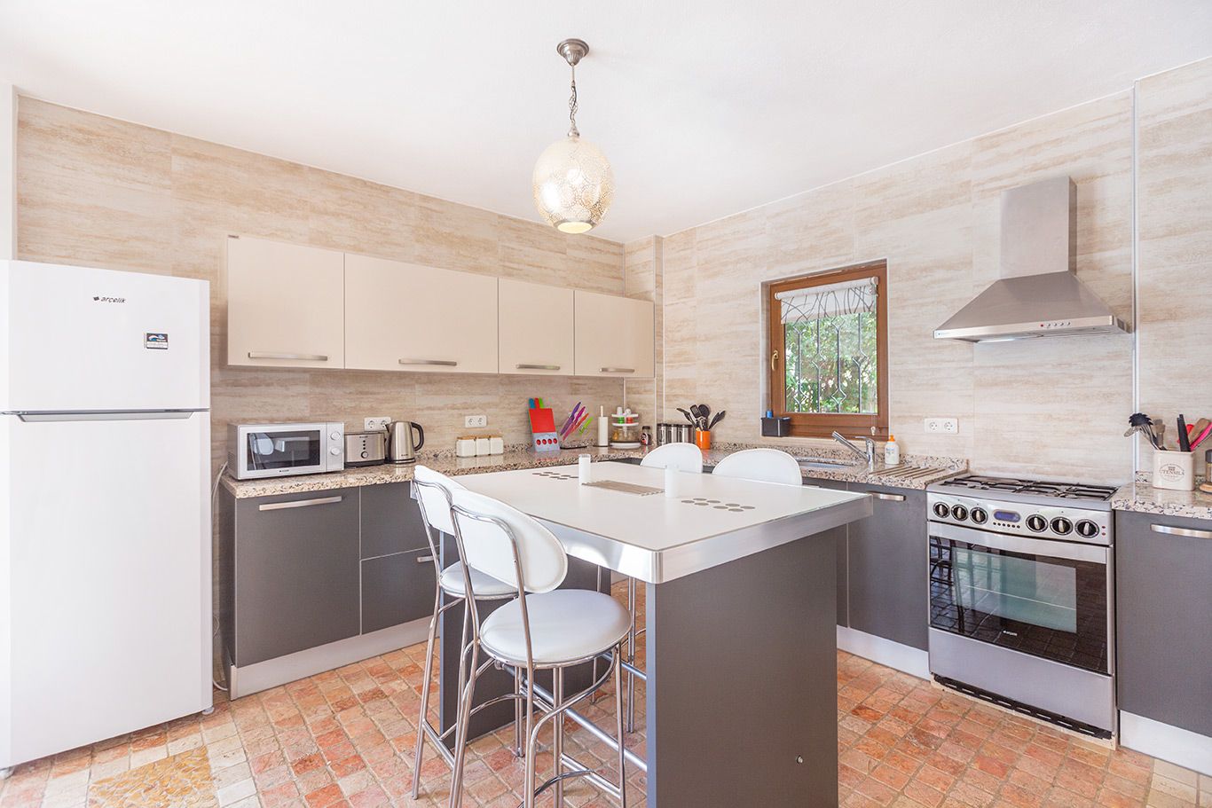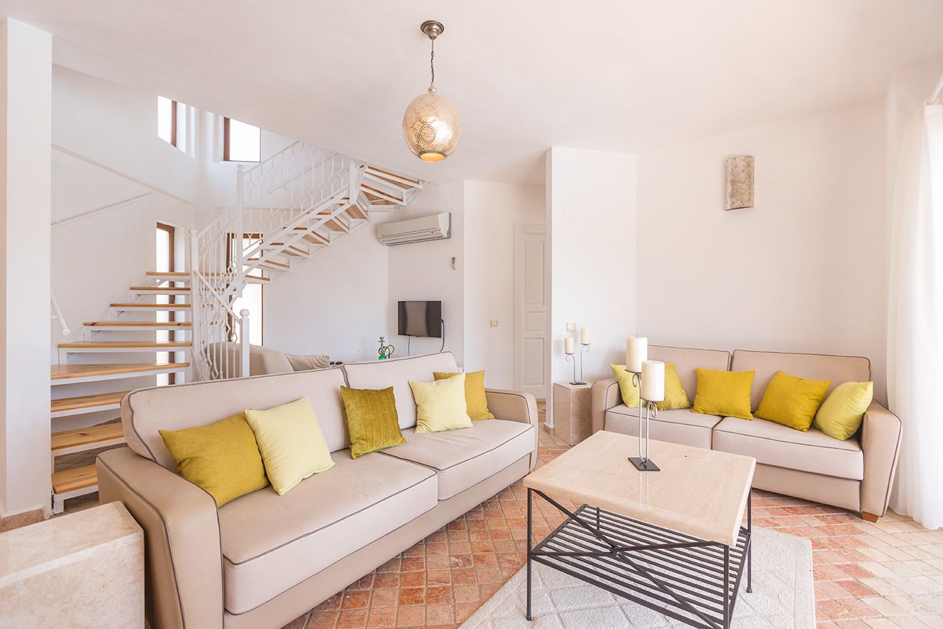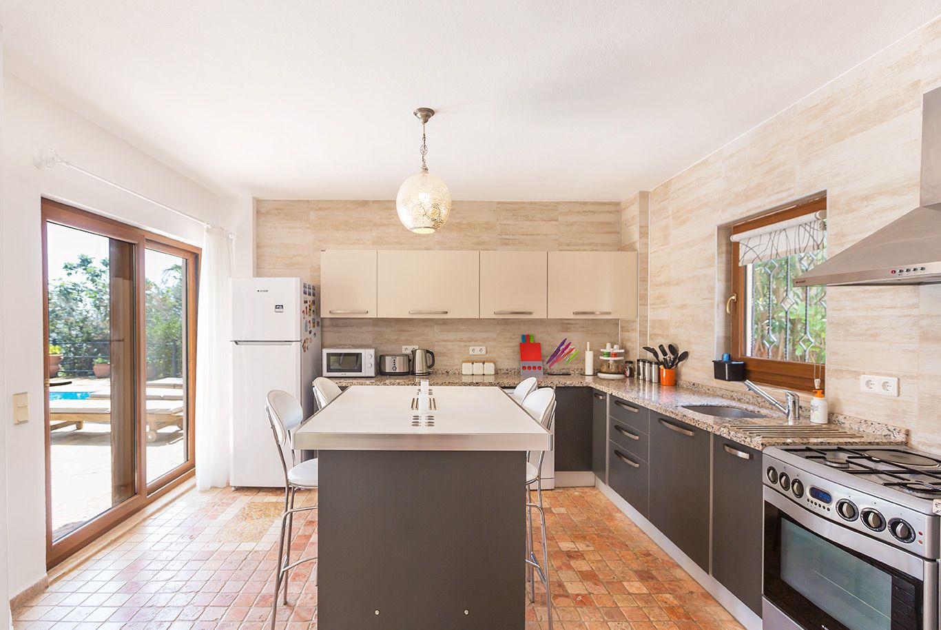 The open plan lounge and kitchen area is beautifully furnished and is airy and light. The lounge has an elegant spiral staircase leading up to the first floor and roof terrace plus a fireplace and a wall-mounted flatscreen TV and a DVD player. The kitchen has marble work- surfaces, is modern and contemporary with all the essential appliances, including oven, hob, extractor, microwave, dishwasher, washing machine, water cooler and fridge-freezer. The central breakfast bar overlooks the pool terrace outside.