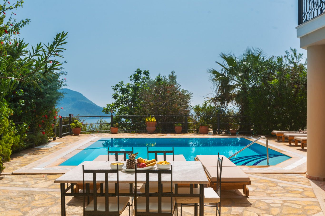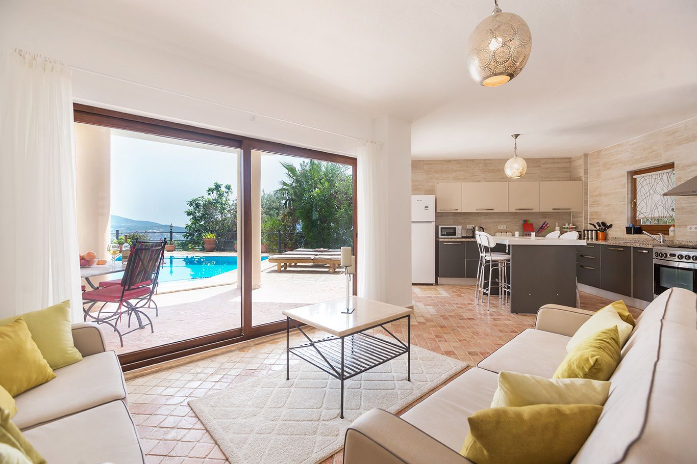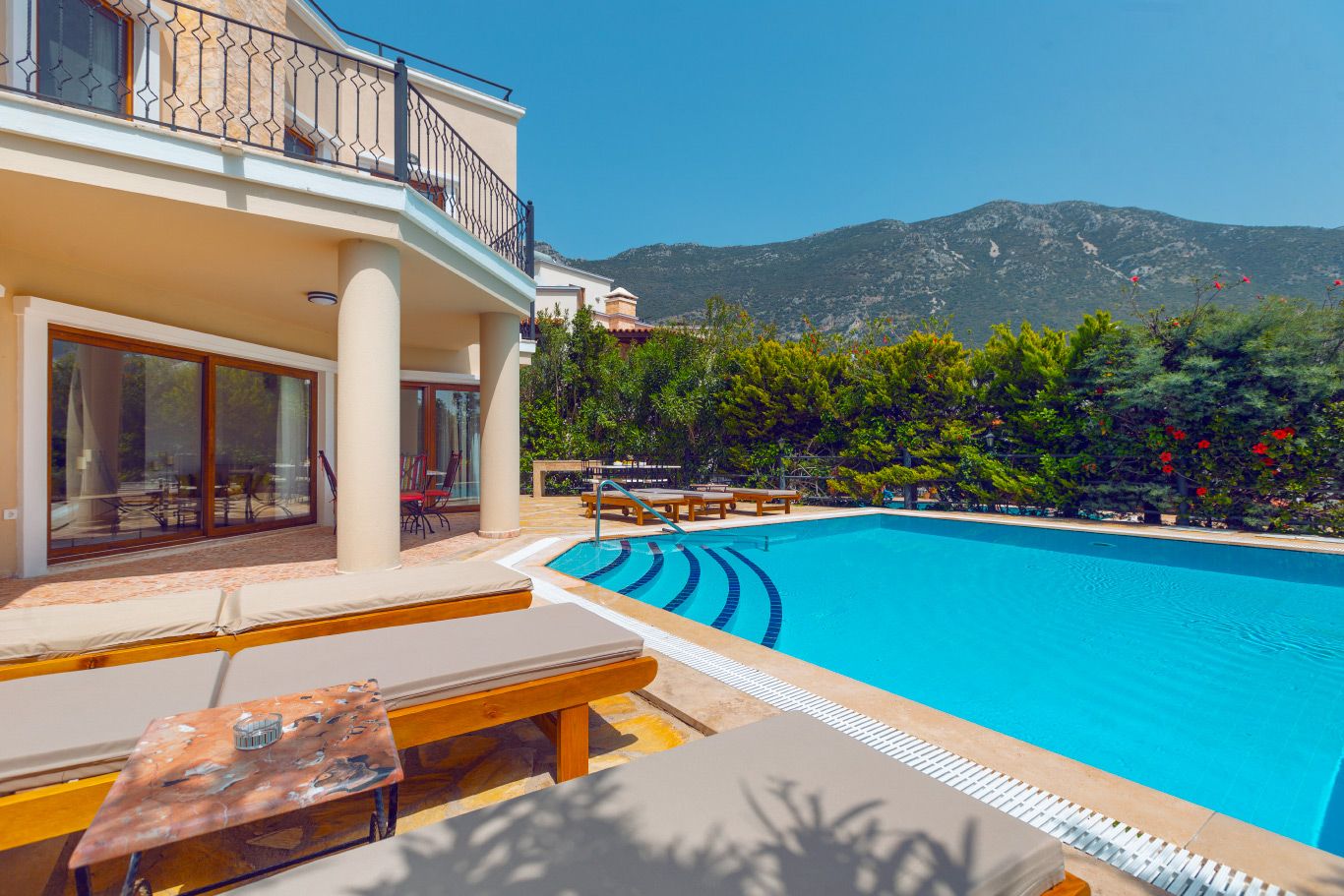 The villa has been beautifully furnished and has floor to ceiling windows and patio doors out to the sun-kissed pool terrace and the spacious first floor balconies.