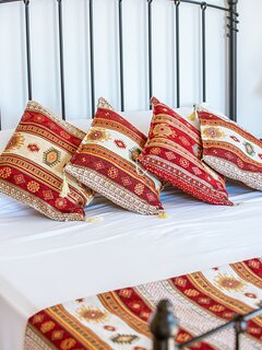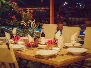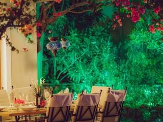 The terrace has a large dining table which seats 10 guests. There is another smaller seating area in our courtyard, and a double hammock on the shady upper terrace.